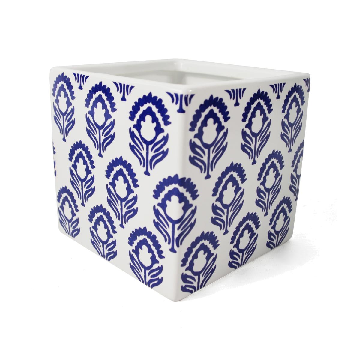 Ceramic Cube Planter with Decorative Print Blue Tulip - Blue