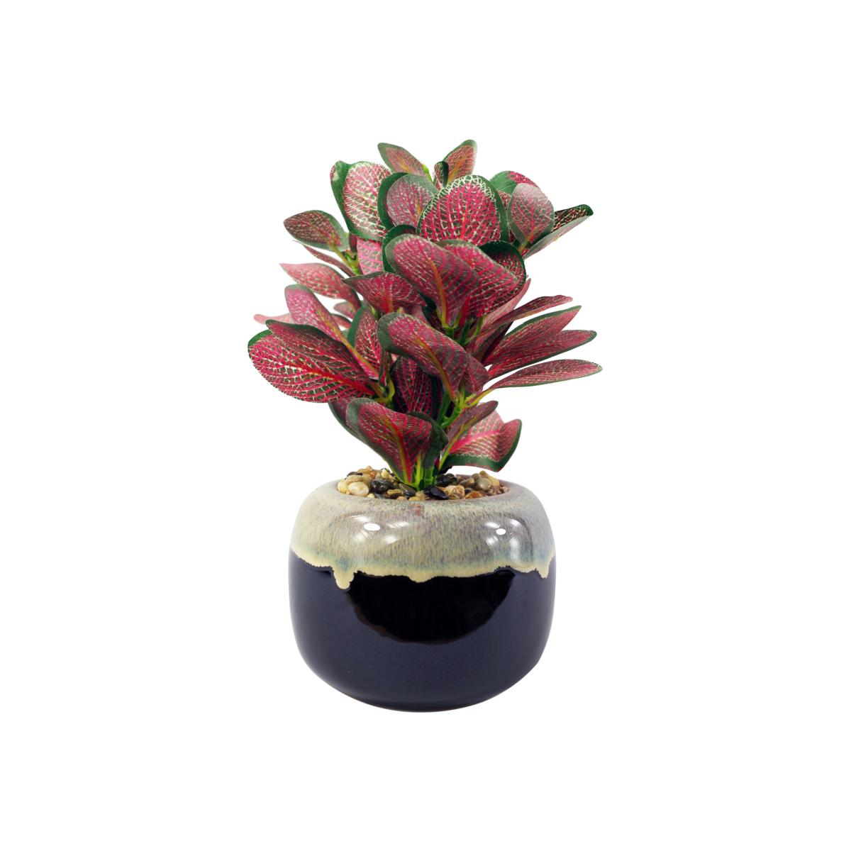 Ceramic Drip Glazed Planter with Artificial Red Mosaic Plant, comes fully potted in the small ceramic slip glazed multicolour planter shown. Decorative stones are fully fixed and won't come loose. Ready to display. Available with a choice of plants.