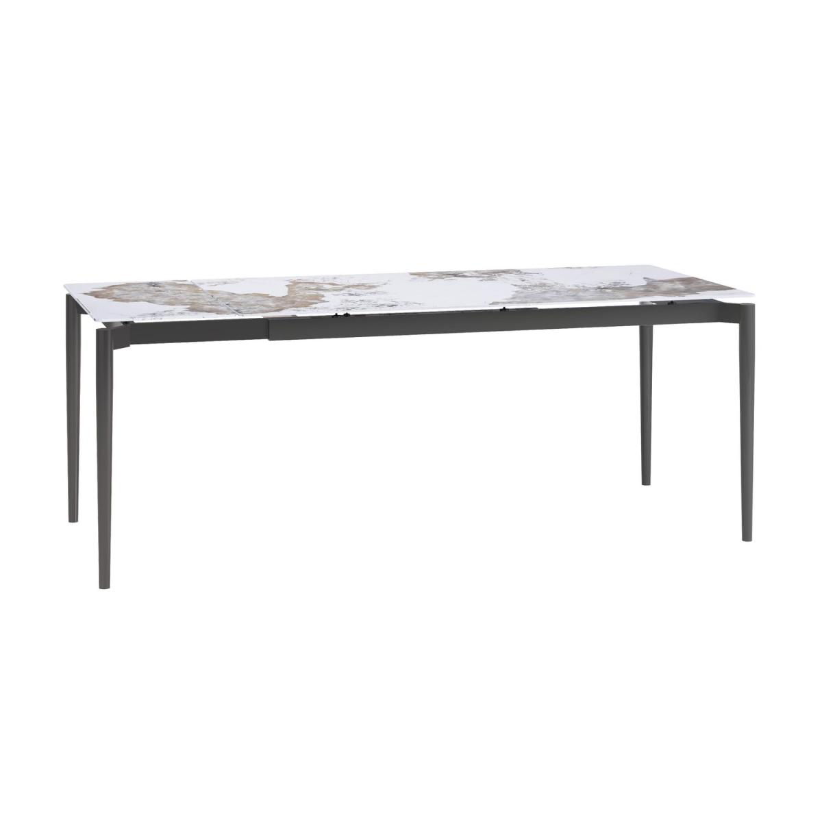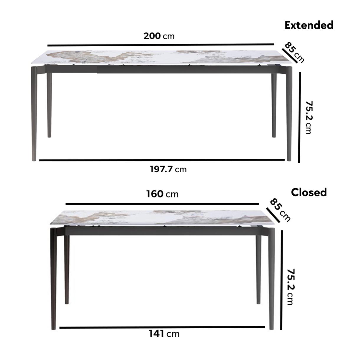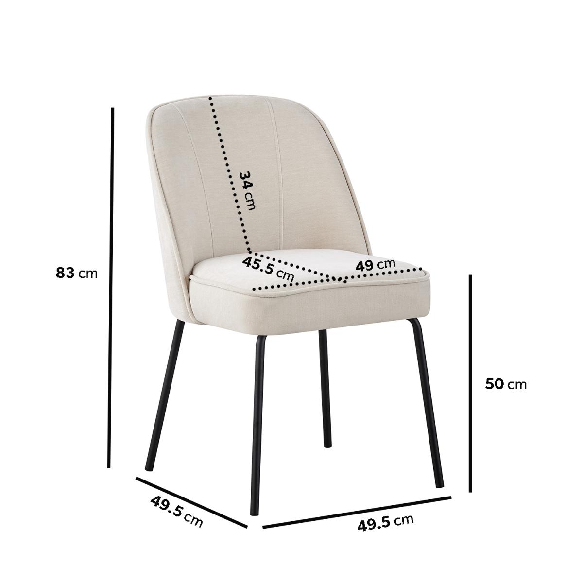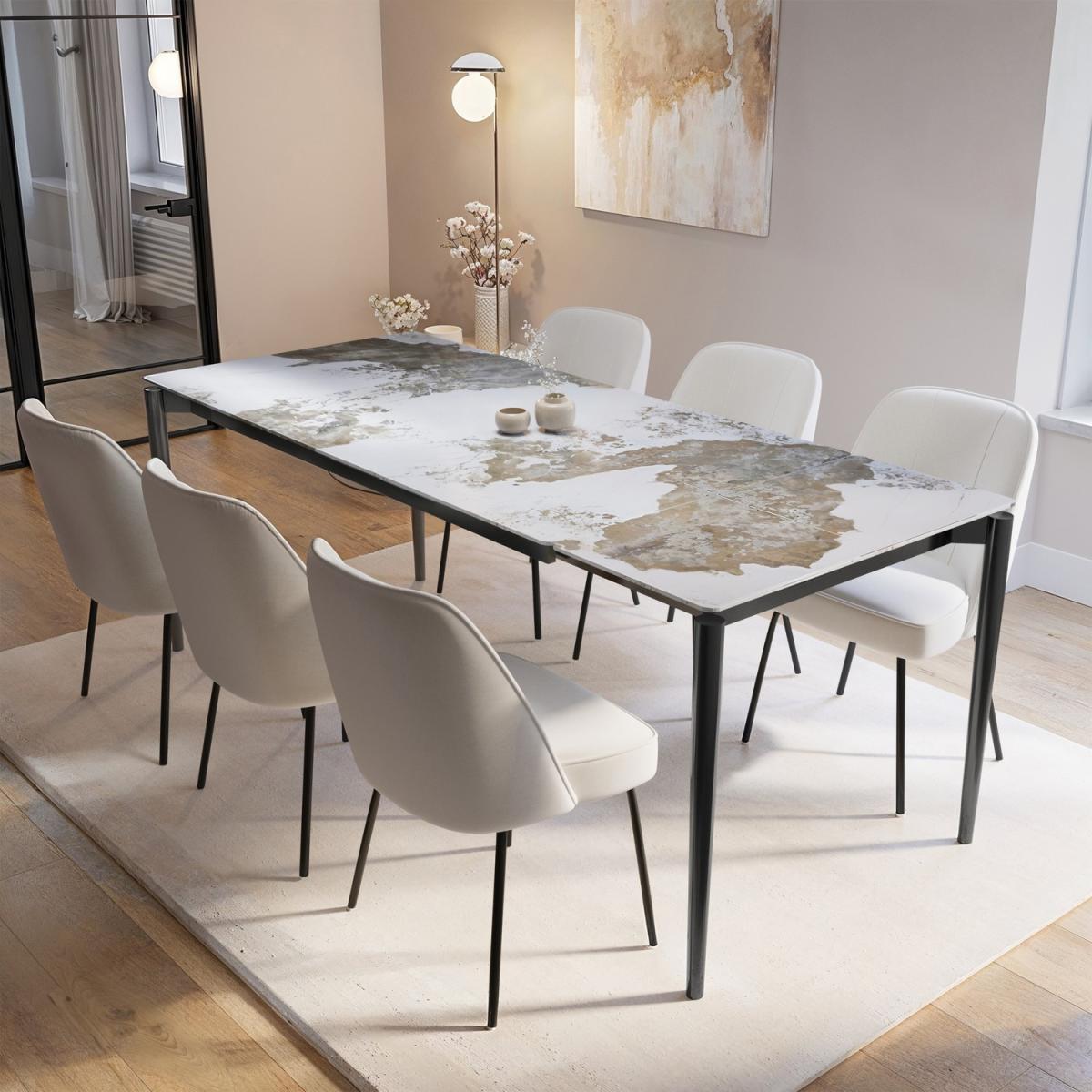 Transform your dining space with this modern dining set, perfect for hosting. Featuring a a warm neutral ceramic top that’s both heat and scratch-proof, this table offers a luxurious appearance with easy-to-clean durability. Its extendable design allows it to seat 6 to 8 guests comfortably, ideal for hosting family gatherings or dinner parties. Paired with six beige fabric chairs with elegant piped edge detailing to coordinate perfectly with any interior. Dimensions (closed): H75.2 x W160 x D85cm Dimensions (open): H75.2 x W200 x D85cm Product Weight: 105kg Finish: Ceramic top, pewter base Top Material: Ceramic top Base Material: Pewter Seats: 6-8 Colour:Warm ceramic Assembly required: Yes Number of Chairs: 6 Dimensions:W50 x D60 x H83 cm Weight: 7.1 kg Max supported weight: 120 kg Colour:Beige and black legs Finish: Upholstered and powder coated legs Material: Chenille fabric and metal legs Assembly required: Yes – just attach the legs Packed dimensions:W70 x D55.5 x H53.5 cm For domestic use only. Domestically UKFR certified.