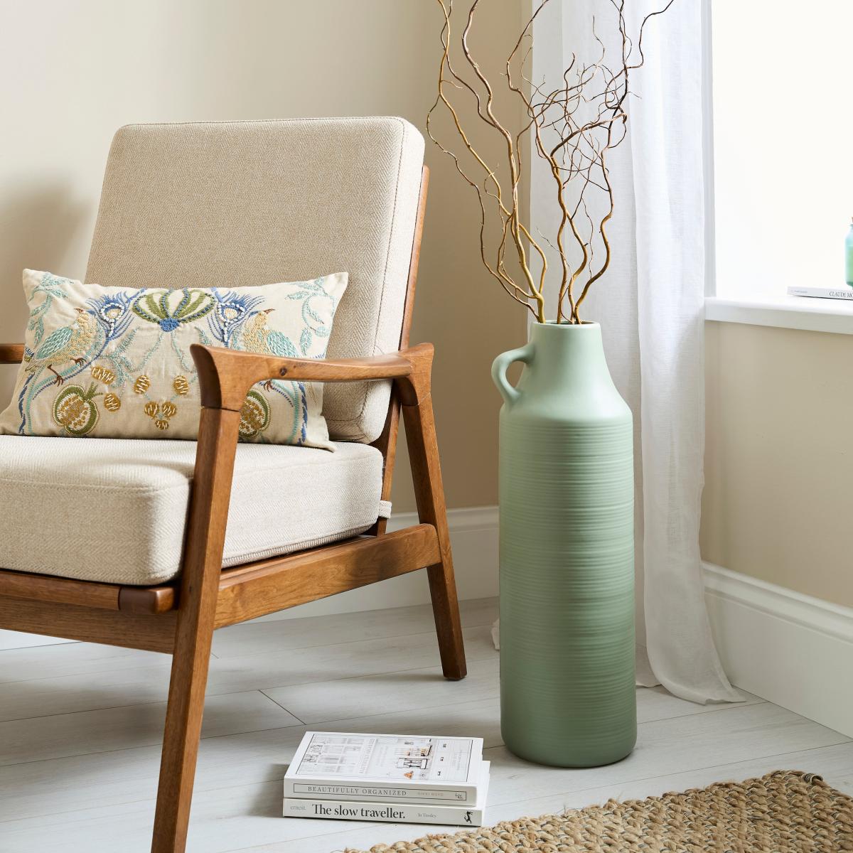 I love this green vase because of its sleek, contemporary shape combined with the calming sage colour, making it a versatile piece for a variety of interiors. It works particularly well in minimalist, Scandinavian, or modern boho settings, where its understated elegance can really stand out. For styling tips, I recommend pairing it with dried grasses or simple fresh flowers to enhance its natural tone, or leaving it empty as a sculptural accent. Its size makes it ideal for placement in hallways or living rooms, where it can act as an eye-catching focal point without overwhelming the space.