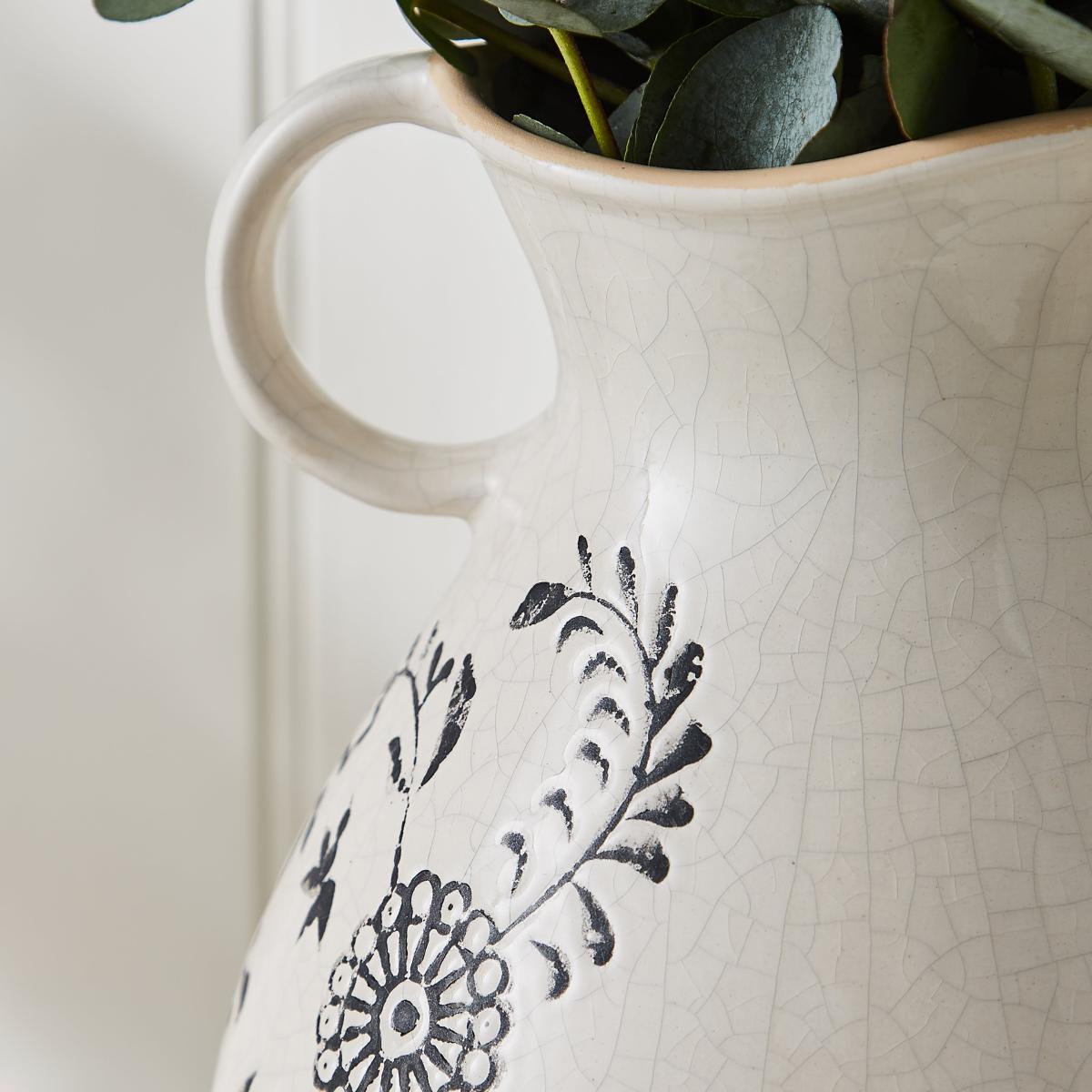 * Jug Shaped Vase* Floral Print* 100% Ceramic Introducing our Ceramic Floral Jug Vase, the epitome of elegance. With its charming jug-shaped design and captivating cream colourway adorned with a stunning black floral print, this vase effortlessly combines classic and contemporary styles. Crafted with utmost care using high-quality ceramic, this vase exudes durability and sophistication. The smooth surface is not only pleasing to the eye but also easy to wipe clean, ensuring a hassle-free maintenance experience. Whether you display it as a standalone centrepiece or showcase your favourite blooms, this Ceramic Floral Jug Vase will elevate any space with its timeless beauty.
