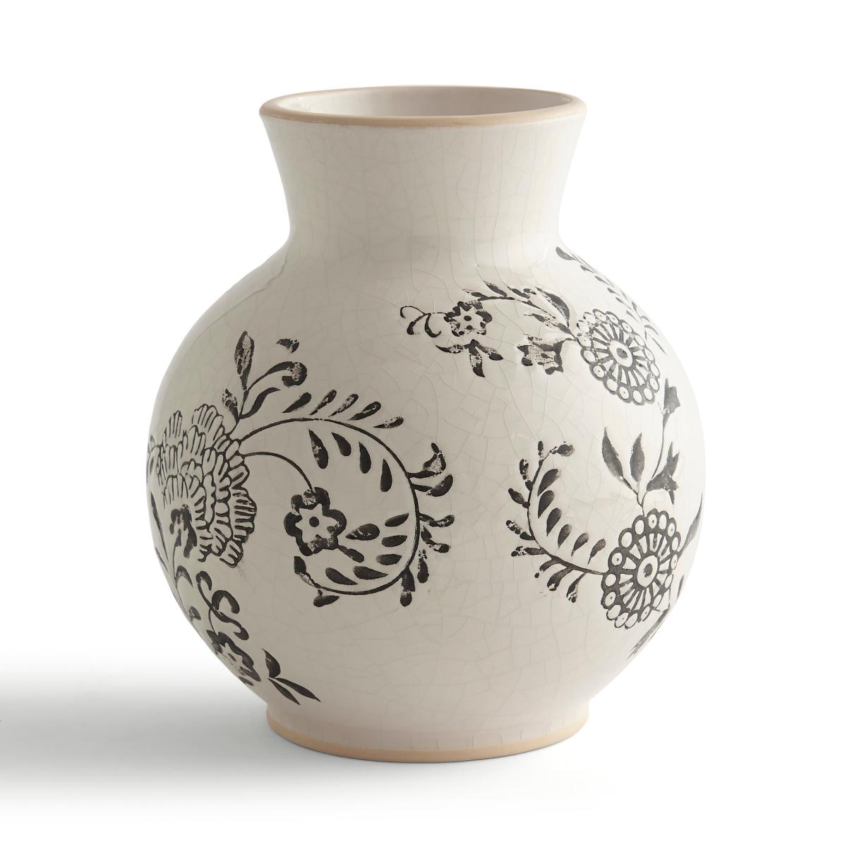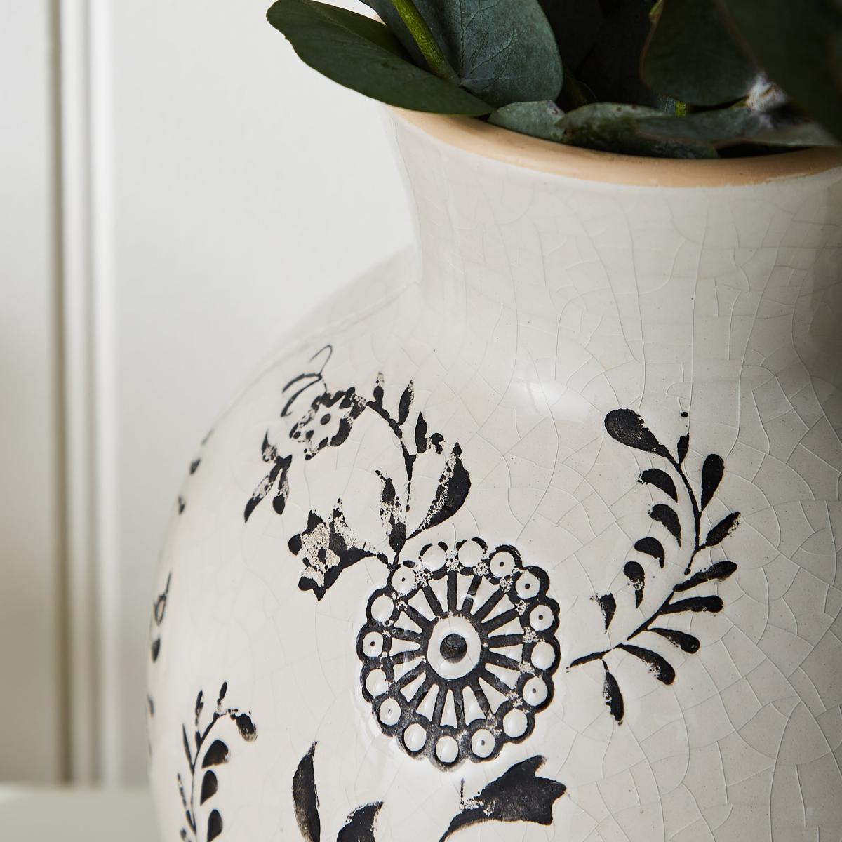 * Vase* Floral Print* 100% Ceramic Meet our Ceramic Floral Vase, the embodiment of beauty. With its elegant design and cream colourway adorned with a captivating black floral print, this vase is a true masterpiece that adds sophistication to any room. Crafted from high-quality ceramic, this vase showcases craftsmanship that ensures durability; its smooth surface not only invites admiration but also makes cleaning a breeze, allowing you to effortlessly maintain its condition. Create a captivating display by showcasing your favourite blooms or let this vase stand alone as a statement piece. Its charm and versatile design blend with any decor style, making it a perfect choice for adding a flair of elegance to your living space.
