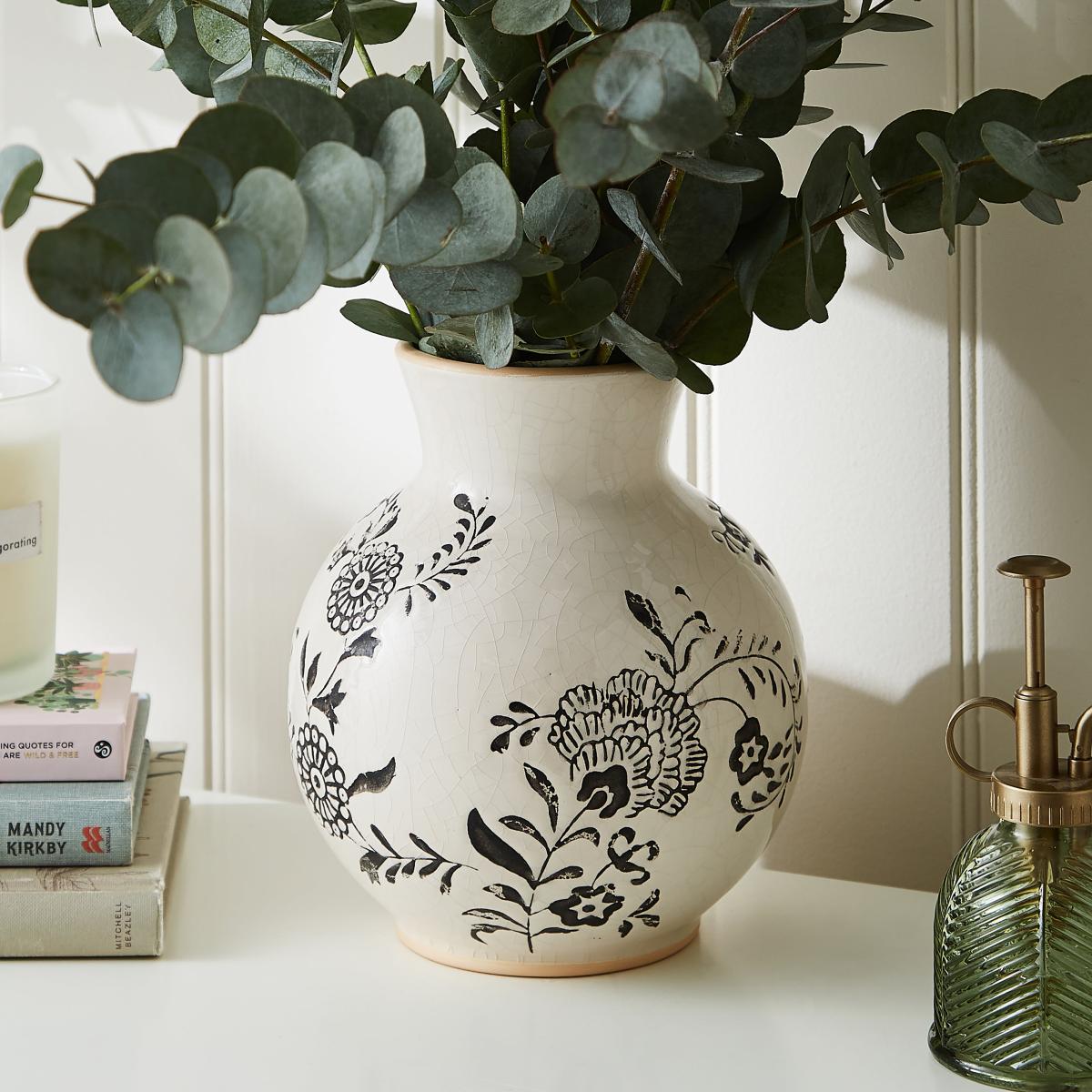 I love this ceramic floral vase for its understated elegance and versatile design. The creamy colour and simple black floral pattern make it easy to incorporate into various interiors, from cosy cottage styles to more modern, minimalist spaces. It works particularly well with soft, natural colour palettes and can serve as a statement piece on a sideboard or dining table. For practical styling tips, consider filling it with freshly cut seasonal blooms or even eucalyptus for a fresh, textured look. Its size and shape make it ideal for creating height on surfaces, while also lending itself well to pairing with other decorative objects for a layered, curated feel.