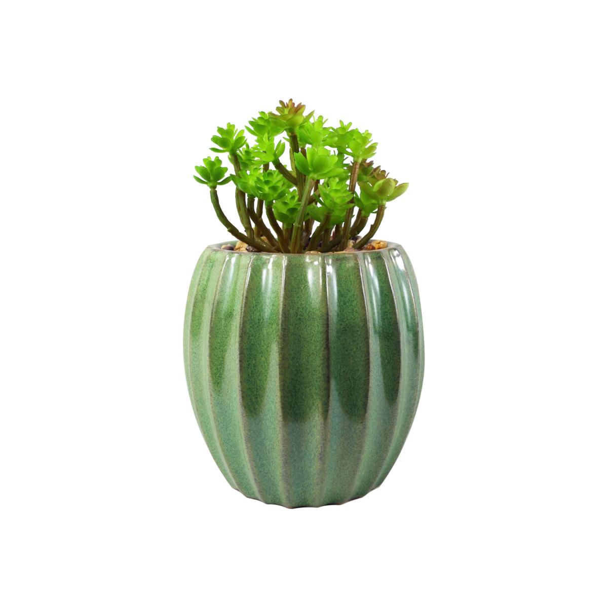 Ceramic Green Glazed Barrel Planter Artificial Sedum Clavatum Plant - Green