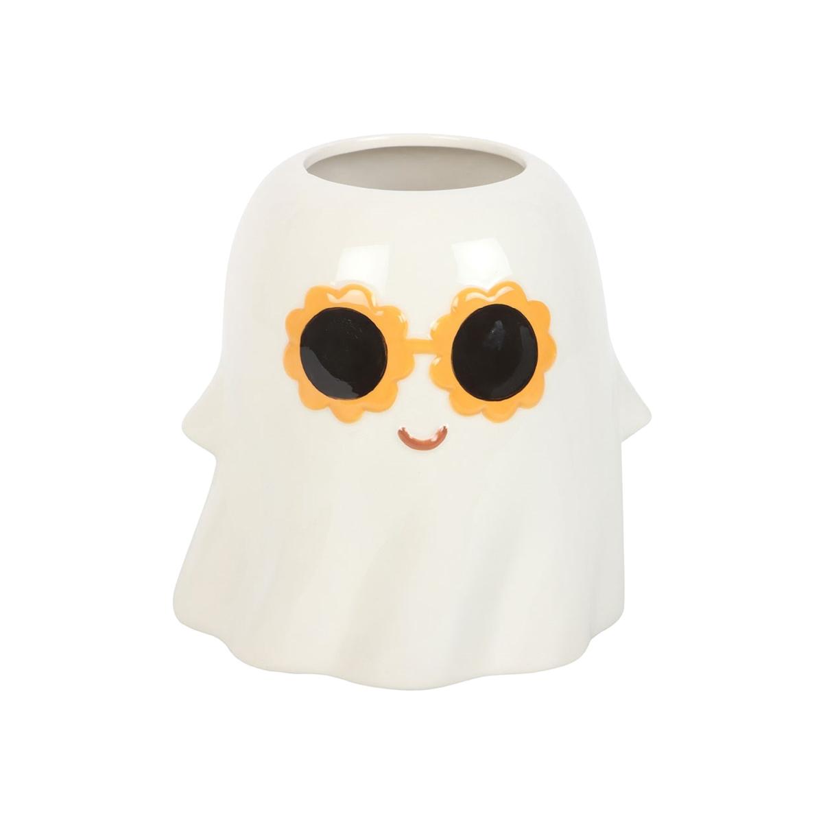 Add a playful spooky twist to home decor with this ceramic ghost-shaped vase, featuring a ghost wearing a groovy pair of 60s style sunglasses. Perfect for displaying seasonal flowers or as a standalone statement piece for autumn and Halloween.