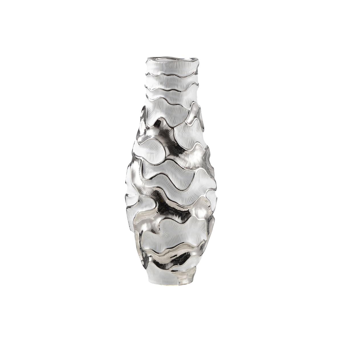 This ceramic handmade ripples design piece is a modern home decor accent that brings sophistication and elegance to any space. Featuring a meticulously crafted ripples texture, it showcases the artistry of handmade ceramics. Perfect for living rooms, offices, or bedrooms, it enhances your decor with its contemporary aesthetic. Durable and timeless, this decor piece is ideal for creating a refined yet warm ambiance in your home. This handmade ceramic vase with a white and chrome textured ripples design is a modern statement piece for your living room. Combining artisanal craftsmanship with contemporary elegance, its rippled surface adds depth and visual interest. This vase white and chrome finish ensures it complements a variety of decor styles, from minimalist to chic. Perfect for showcasing fresh flowers or standing alone as a decor piece, it enhances any space with sophistication and charm.