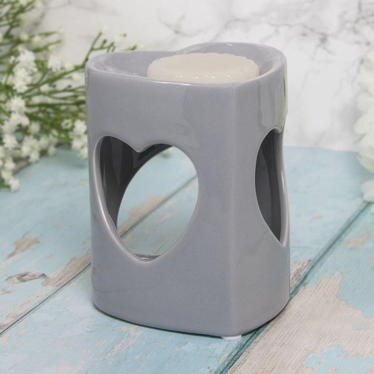 This ceramic warmer can be used with wax melts or fragrance oils. Available in grey or white with a shiny finish and cut-out heart. Use with a standard tealight candle.