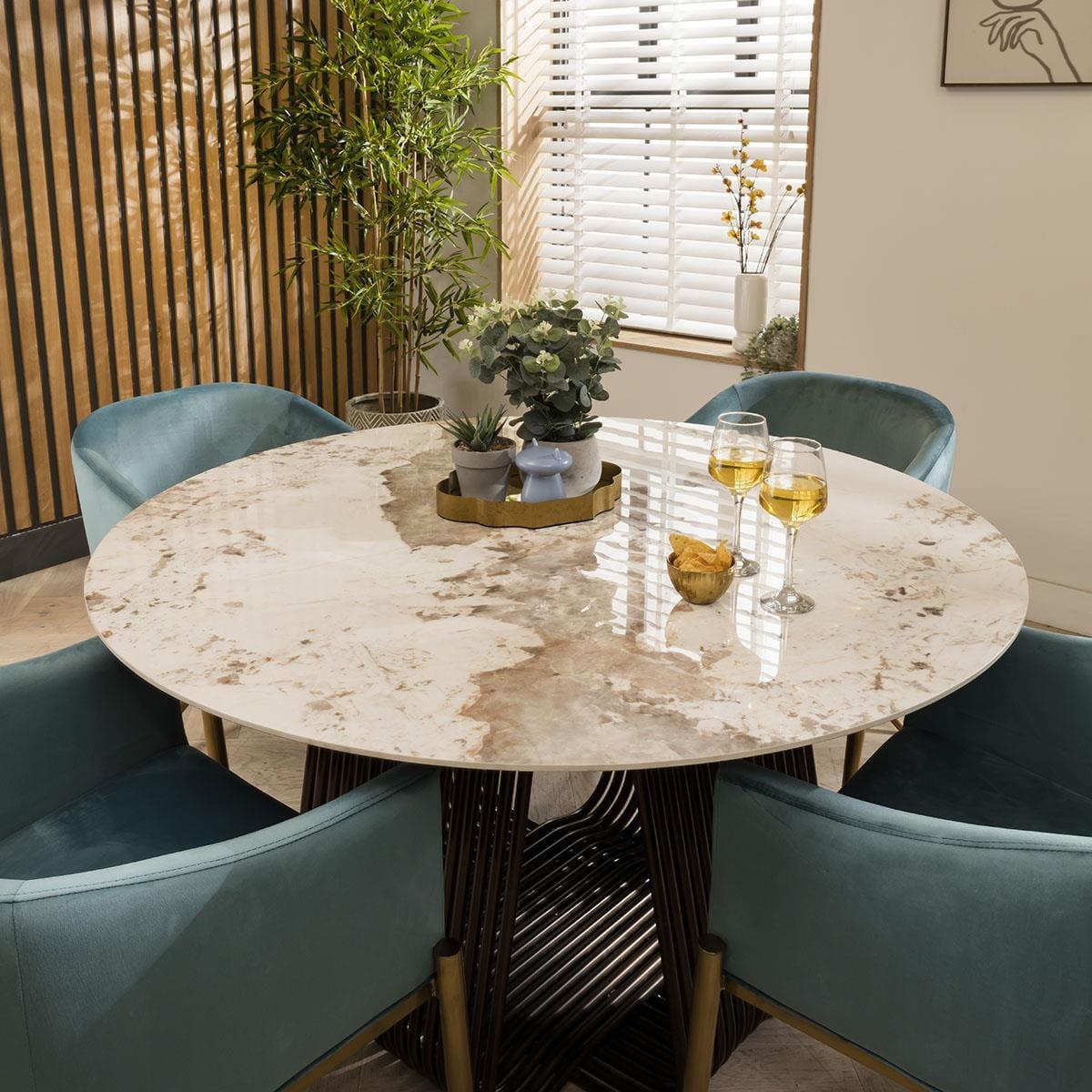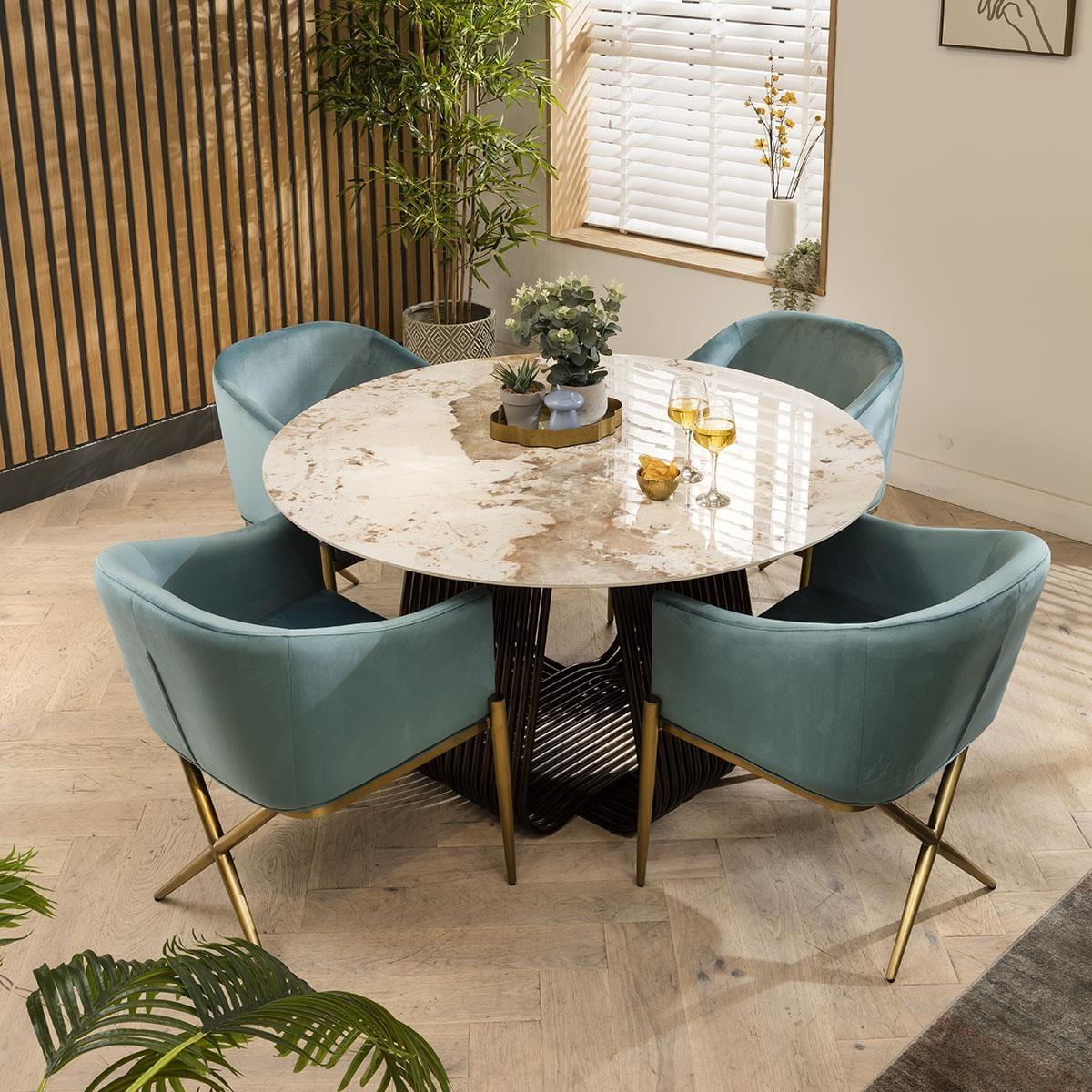 Embrace the perfect fusion of industrial allure, chic sophistication, and uncompromising quality in this stunning 4 seater dining set. Centred around the premium marble effect ceramic round Rugano table, four Zoe green velvet fabric dining chairs create a sleek, trendy look that charms and captivates dinner guests. The Rugano round dining table for 4, measuring 135cm, boasts a sophisticated white ceramic marble top adorned with exquisite gold detailing, supported by a unique pedestal base design. The ceramic surface isn't just a visual delight it's also scratch, stain, and heat-resistant, ensuring durability for everyday use. A perfect blend of elegance and modern design, the premium Zoe teal green velvet dining chairs will elevate your home's ambiance with their modern carver style, wrap-around backrest, and captivating brushed gold metal legs. Make a statement with this 4 seater dining table and chairs set and indulge in the charm of our teal velvet masterpiece. This 4 seater dining set combines modern Zoe chairs with the stunning Rugano table. Whether you love the Zoe chairs and would like to purchase them individually, or you think the Rugano table would complete your interior scheme better with another chair, you can easily mix and match our modern dining tables and chairs to curate something truly unique. Table Size W135cm D135cm H75cm Chair Size W65cm D62cm H80cm Dining Table And Chair Set For 4
