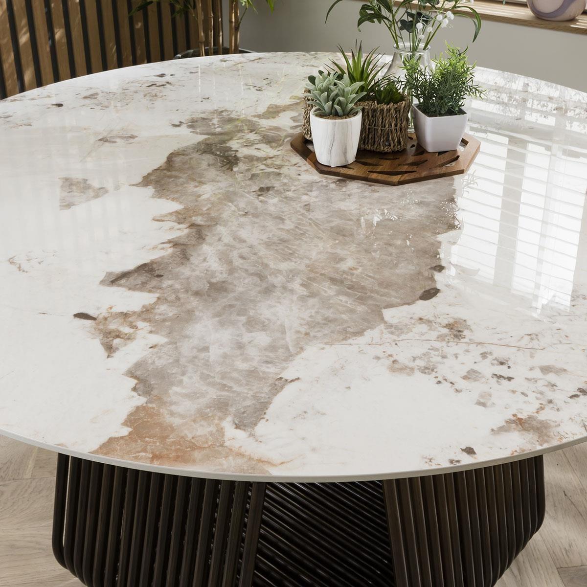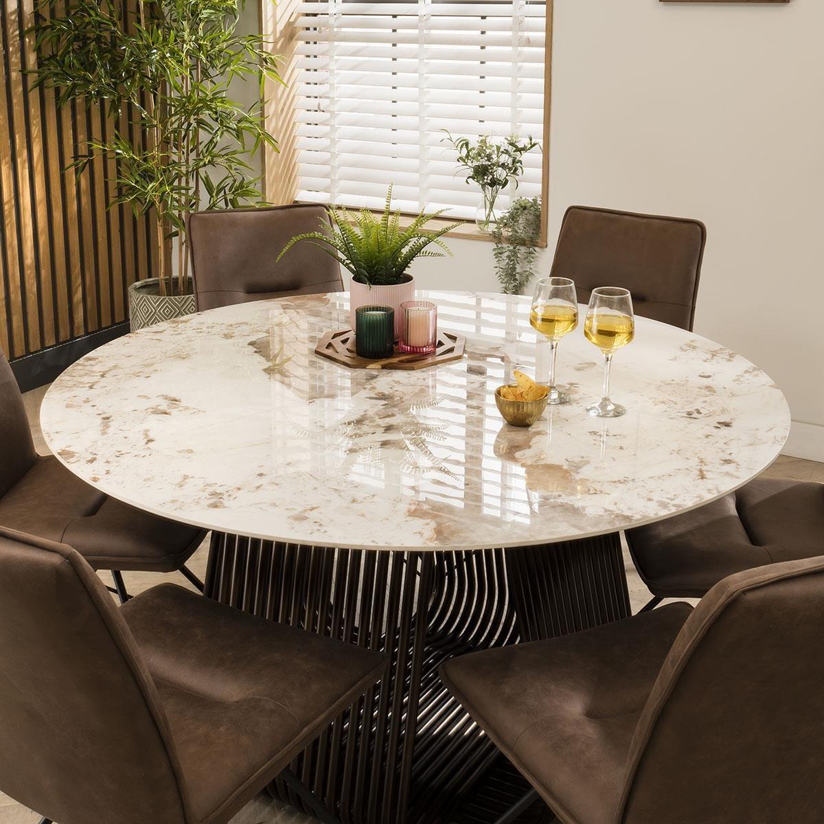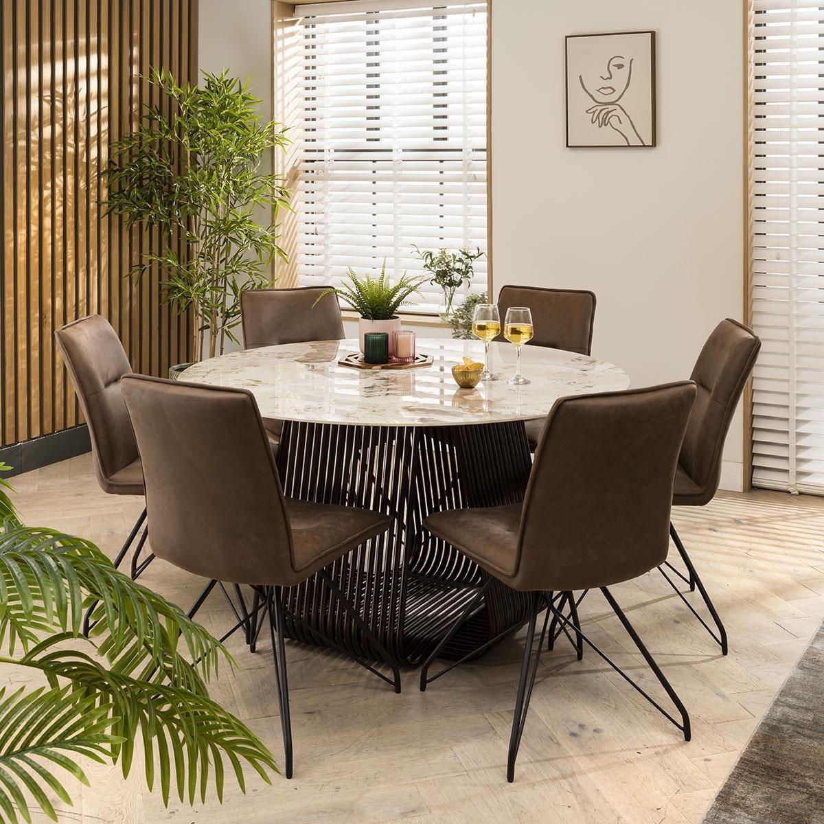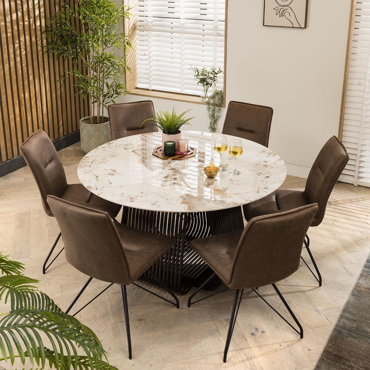 Embrace the perfect fusion of industrial allure, chic sophistication, and uncompromising quality in this stunning 6 seater dining set. Centred around the premium marble effect ceramic round Rugano table, six Detroit brown leather-look dining chairs create a sleek, trendy look that charms and captivates dinner guests. The Rugano round dining table for 6, measuring 135cm, boasts a sophisticated white ceramic marble top adorned with exquisite gold detailing, supported by a unique pedestal base design. The ceramic surface isn't just a visual delight it's also scratch, stain, and heat-resistant, ensuring durability for everyday use. This set of 6 Detroit dining room chairs in the set are a perfect combination of style and comfort. Crafted with hardwearing brown leather-look fabric upholstery, the kitchen chairs add a touch of industrial-chic to any space. The dining chairs boast clean lines accentuated by simple tufting details bestow a modern edge in kitchen or dining room. This 6 seater dining set combines modern Detroit chairs with the stunning Rugano table. Whether you love the Detroit chairs and would like to purchase them individually, or you think the Rugano table would complete your interior scheme better with another chair, you can easily mix and match our modern dining tables and chairs to curate something truly unique. Table Size W135cm D135cm H75cm Chair Size W64cm D49cm H91cm Dining Table And Chair Set For 6