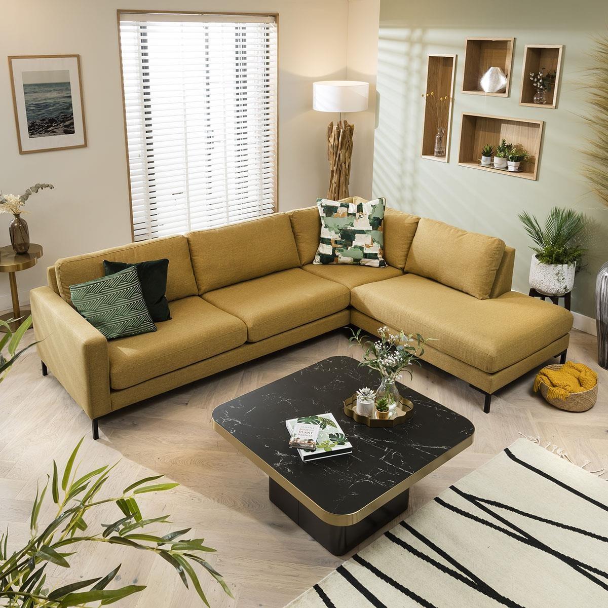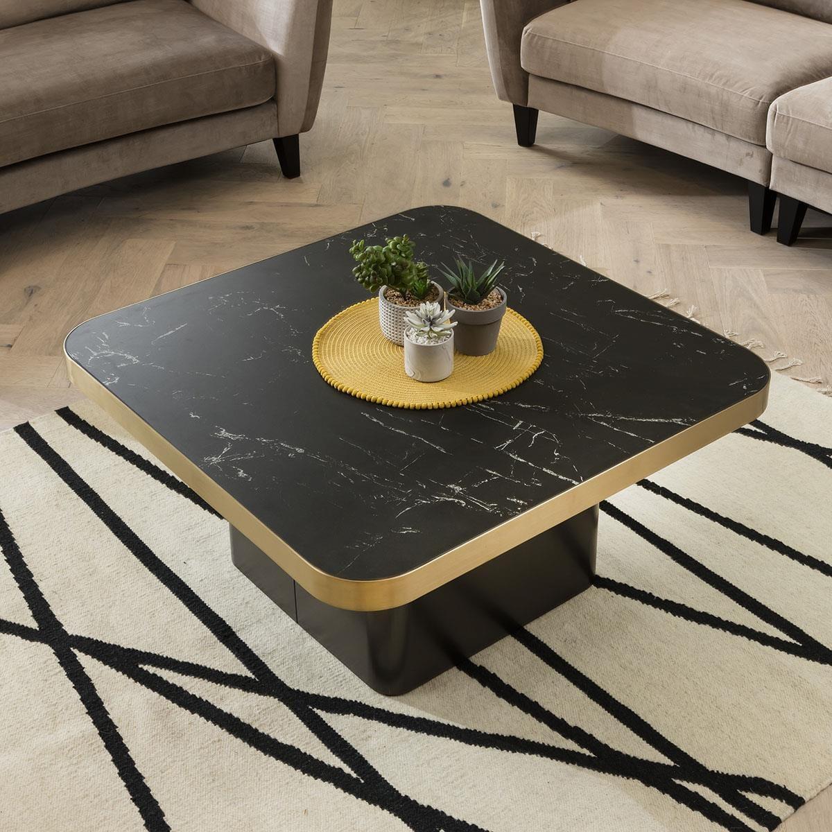 Sleek black marble combined with champagne brushed metal accents? So unique. Give the living area instant impact and a luxury feature with our Tesoro Square Coffee Table, which is finely crafted to produce an elegant, curvaceous design. Multiple finishes provide harmonious contrast, the black-finished refined metal base elevates the range with a sturdy pedestal to complement the bold silhouette, together with the coordinating black ceramic marble top makes the range eye catching, hygienic & incorporates a modern twist to any interior. You can't miss the Tesoro Coffee Table's proportions, wrapped in a champagne coloured brushed metallic trim which accentuates its curvaceous lines. If you need more information about this product, use the Live Chat service to speak to the team or send us a message. Spread the cost our with interest-free finance options. Minimum spend applies.