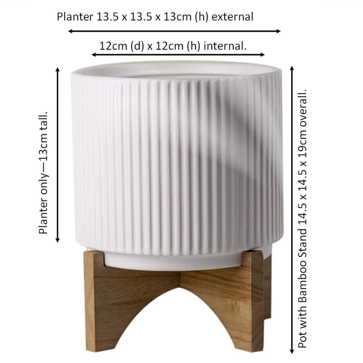 Ceramic Plant Pot with Bamboo Stand - White Ribbed - White
