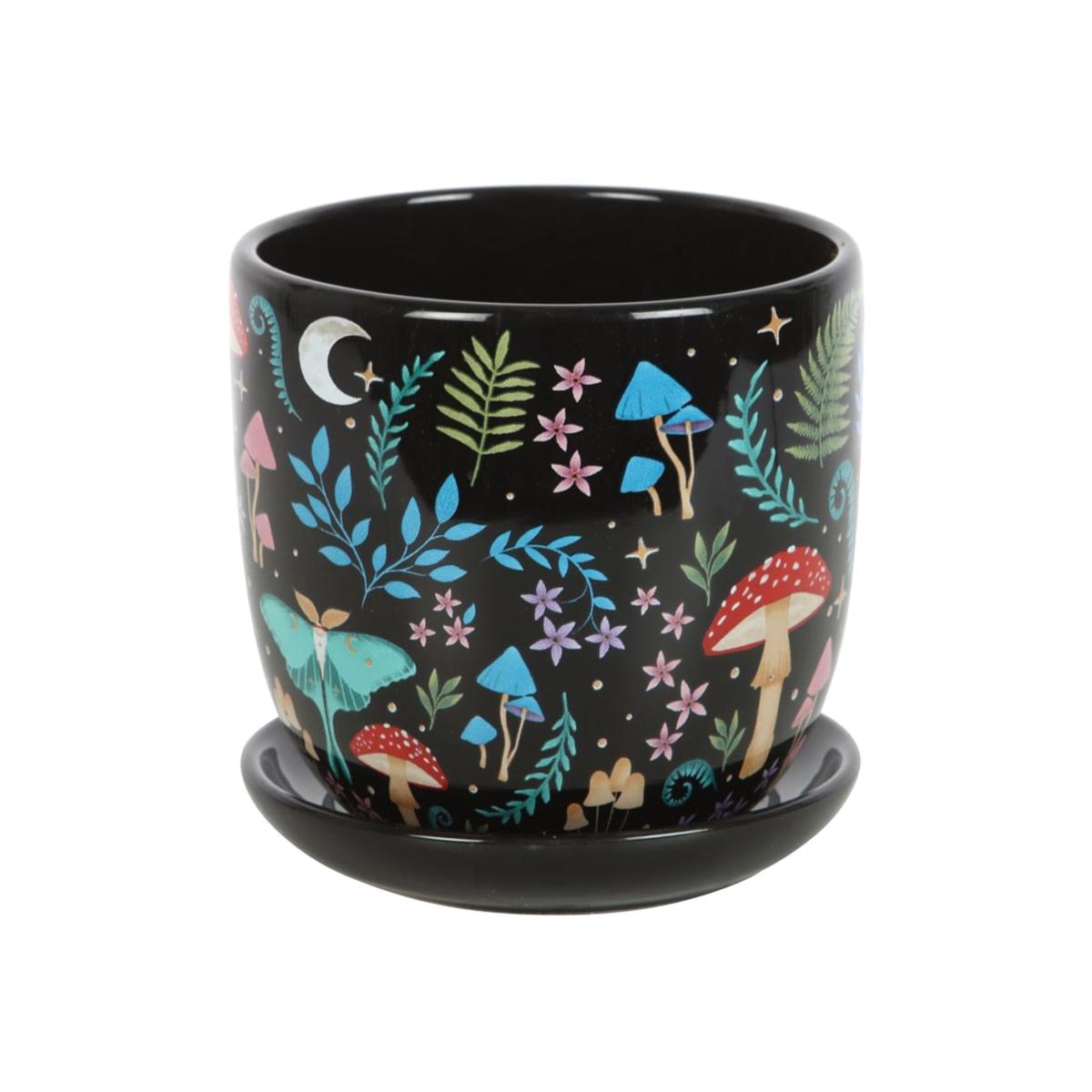 Give plants the home they deserve in this stunning dark forest print plant pot, complete with matching saucer. Featuring colourful flora and fauna illustrations and speckled with a pretty moon and star design, this pot is perfect for showcasing your most precious house plants.