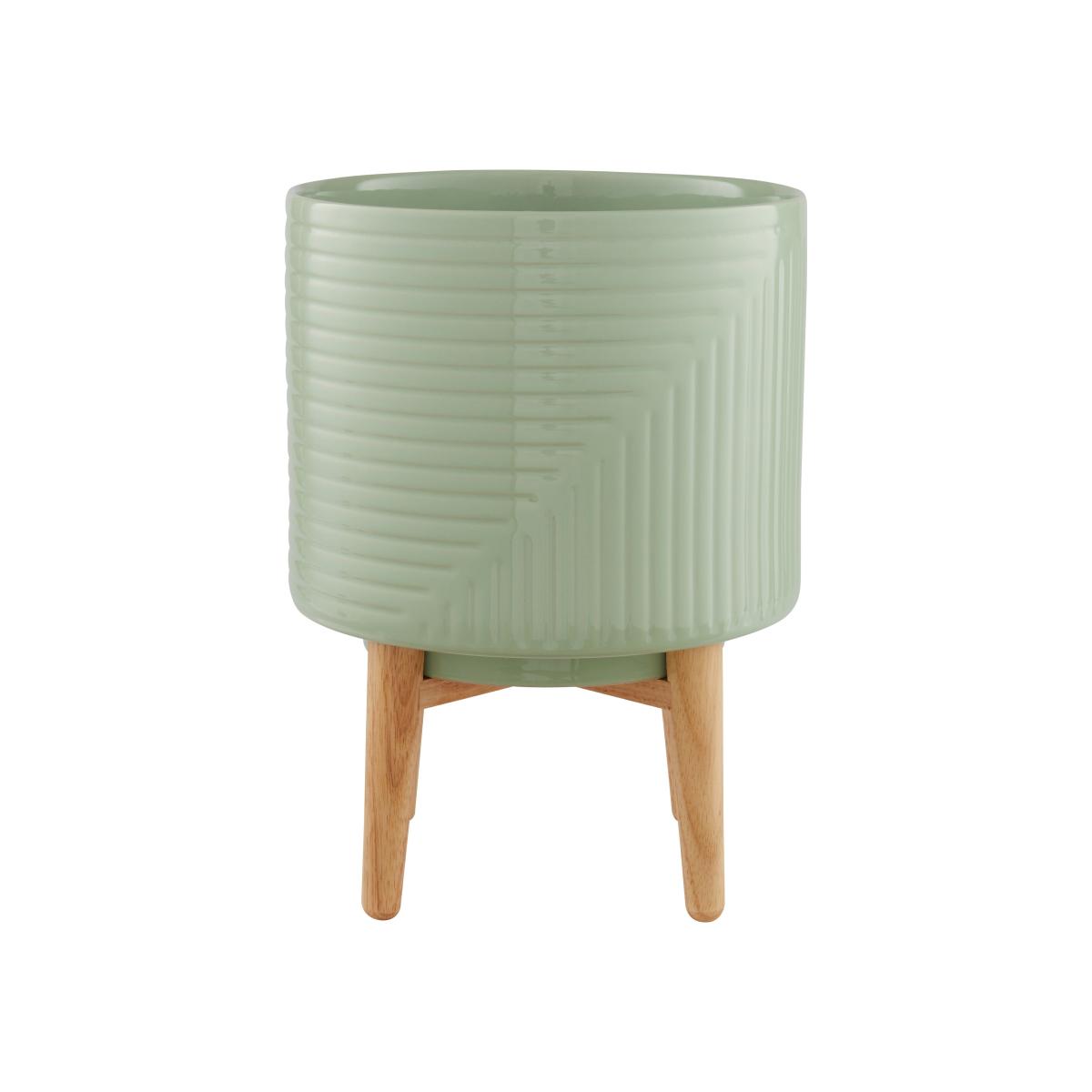 A large ceramic planter sitting on a sturdy base with wooden legs. This elevated piece serves decorative value with its subtle repetitive pattern and practical, holding and supporting a thriving plant within. This modern colourway and natural wooden base will complement any area of the house as well as having easy wipe clean properties.