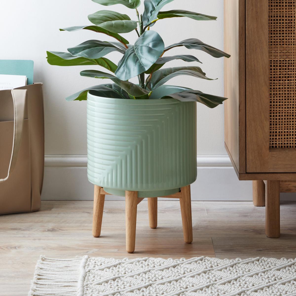 I love this ceramic pot with its wooden stand for adding a touch of contemporary elegance to any space. Its sleek sage green colour works well in both modern and Scandinavian-inspired interiors, bringing a calming vibe to living rooms, offices, or even bedrooms. Practical styling tips include pairing it with other natural textures like woven baskets or adding a trailing plant for visual interest. Its slightly elevated stand also makes it easier to care for plants, and the neutral tones mean it can seamlessly complement a variety of colour schemes without overpowering other decor. It’s a versatile piece that combines style with functionality, making it a great investment for plant lovers looking to elevate their decor.