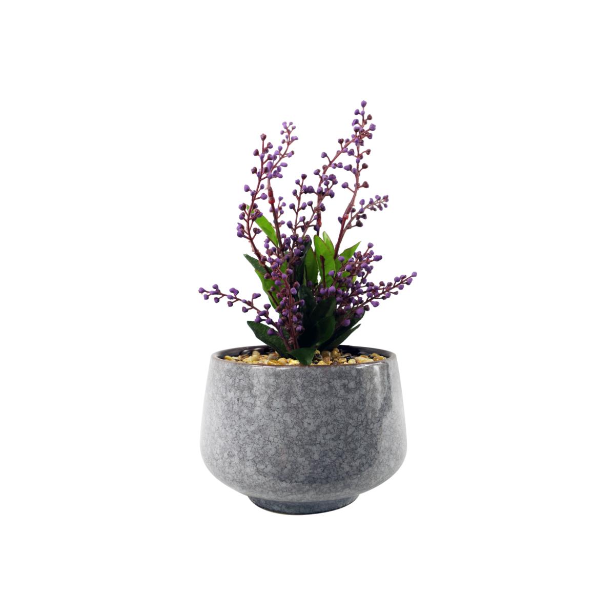 Ceramic Tall Blue Planter with Artificial Purple Vitex Negundo Plant. Plant comes fully potted in the small ceramic planter shown. This is a robust tall design which looks fantastic on a desk. Pebbles are fully fixed and won't come loose. Ready to display. Available with a choice of plants.