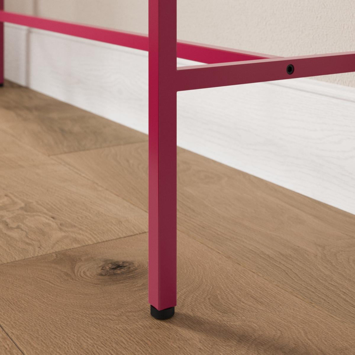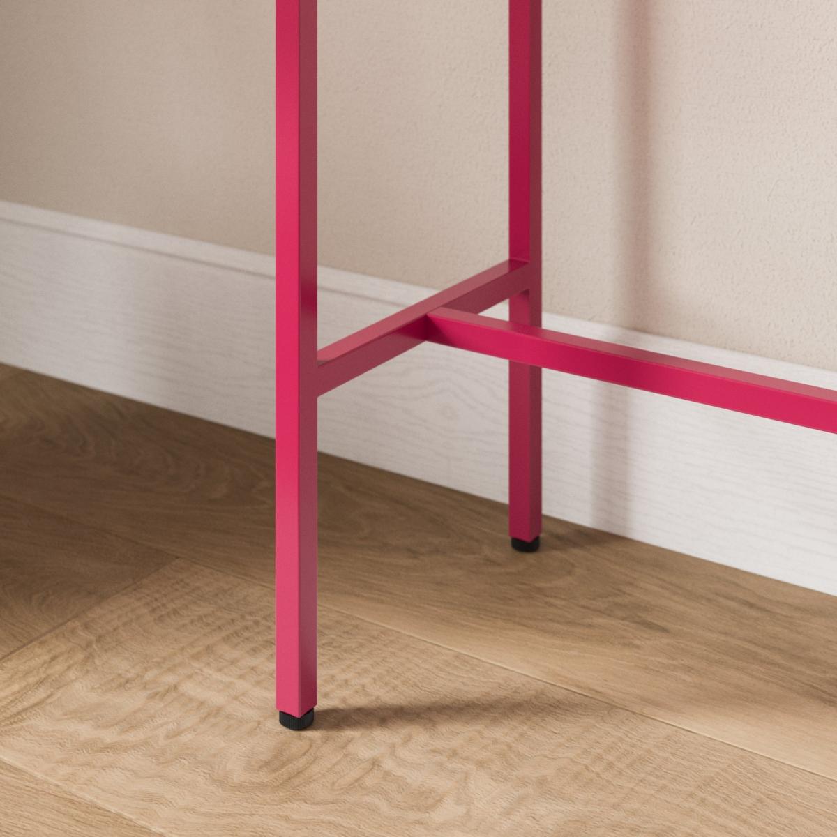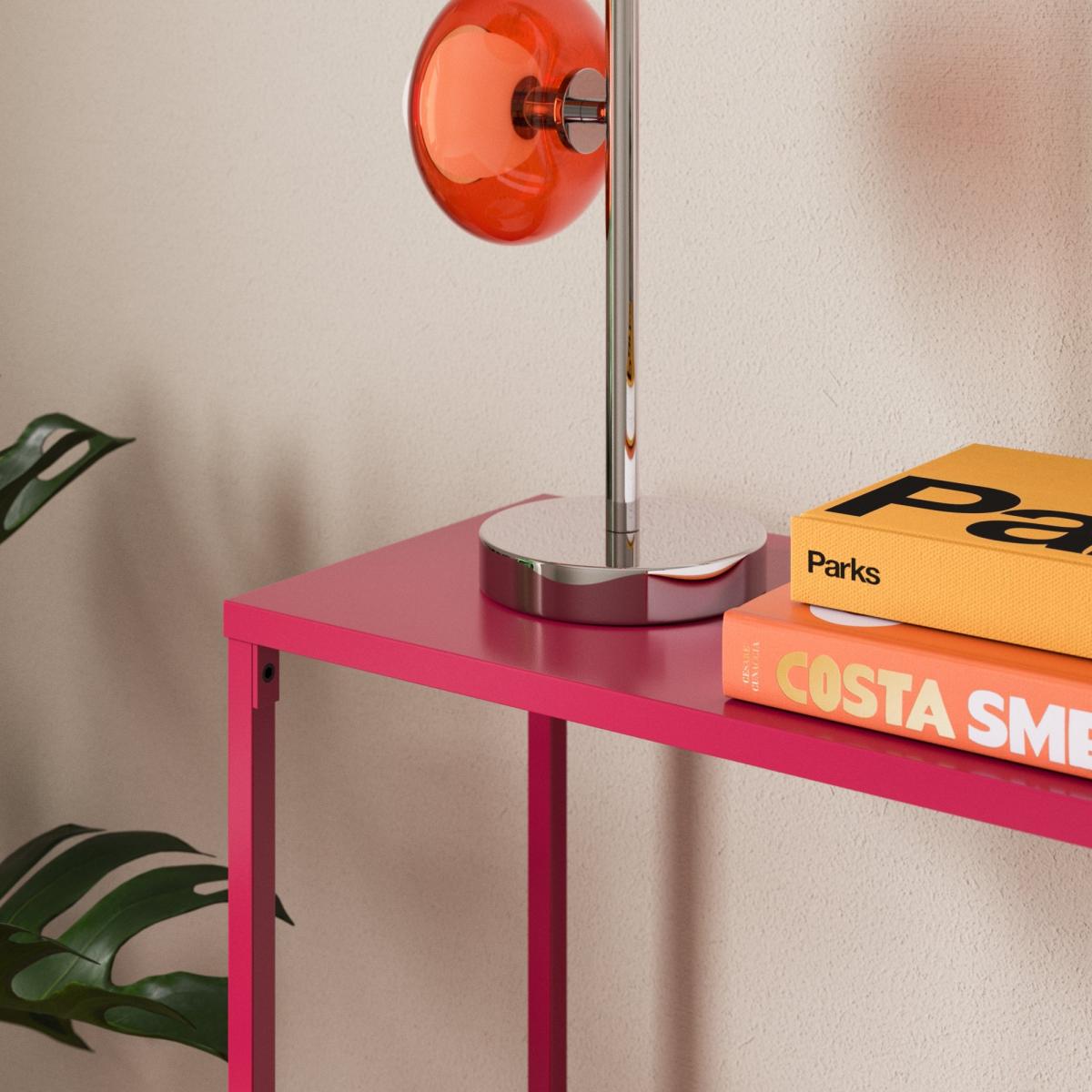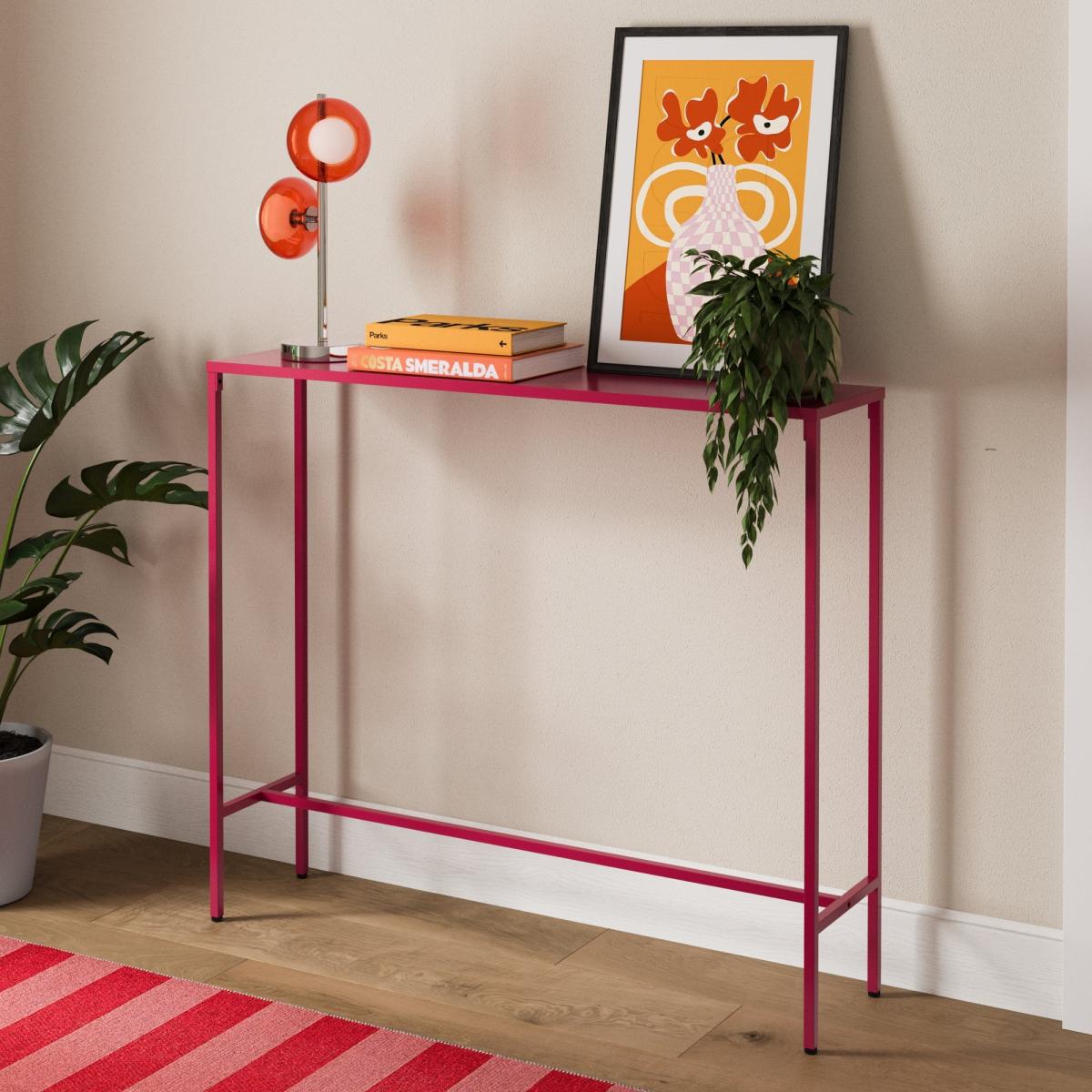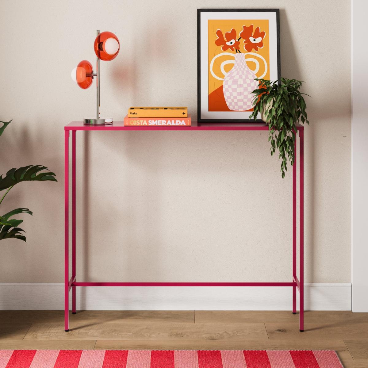 I love this slim console-it’s a striking piece that adds a pop of colour and a modern edge to any space. Its magenta finish makes it particularly suitable for contemporary or eclectic interiors, where bold accents are welcomed. Practical styling tips include placing it in a narrow hallway for a chic surface for keys or decorative objects, or using it behind a sofa for added visual interest. Its sleek, minimalist design enables it to blend seamlessly with varied décor styles, making it both a functional and fashionable choice. Just ensure it’s styled with lighter accessories or a statement lamp to keep the look balanced and airy.