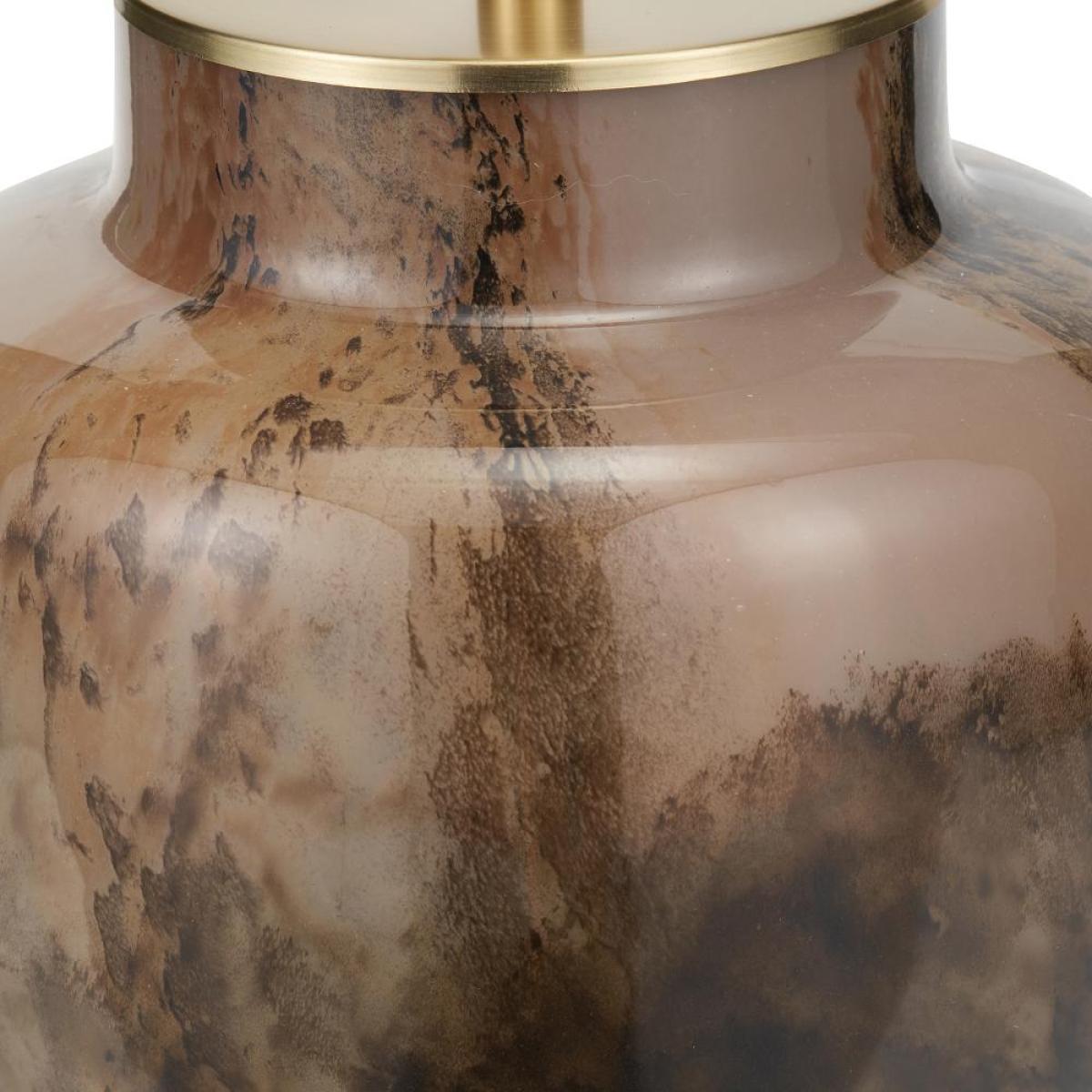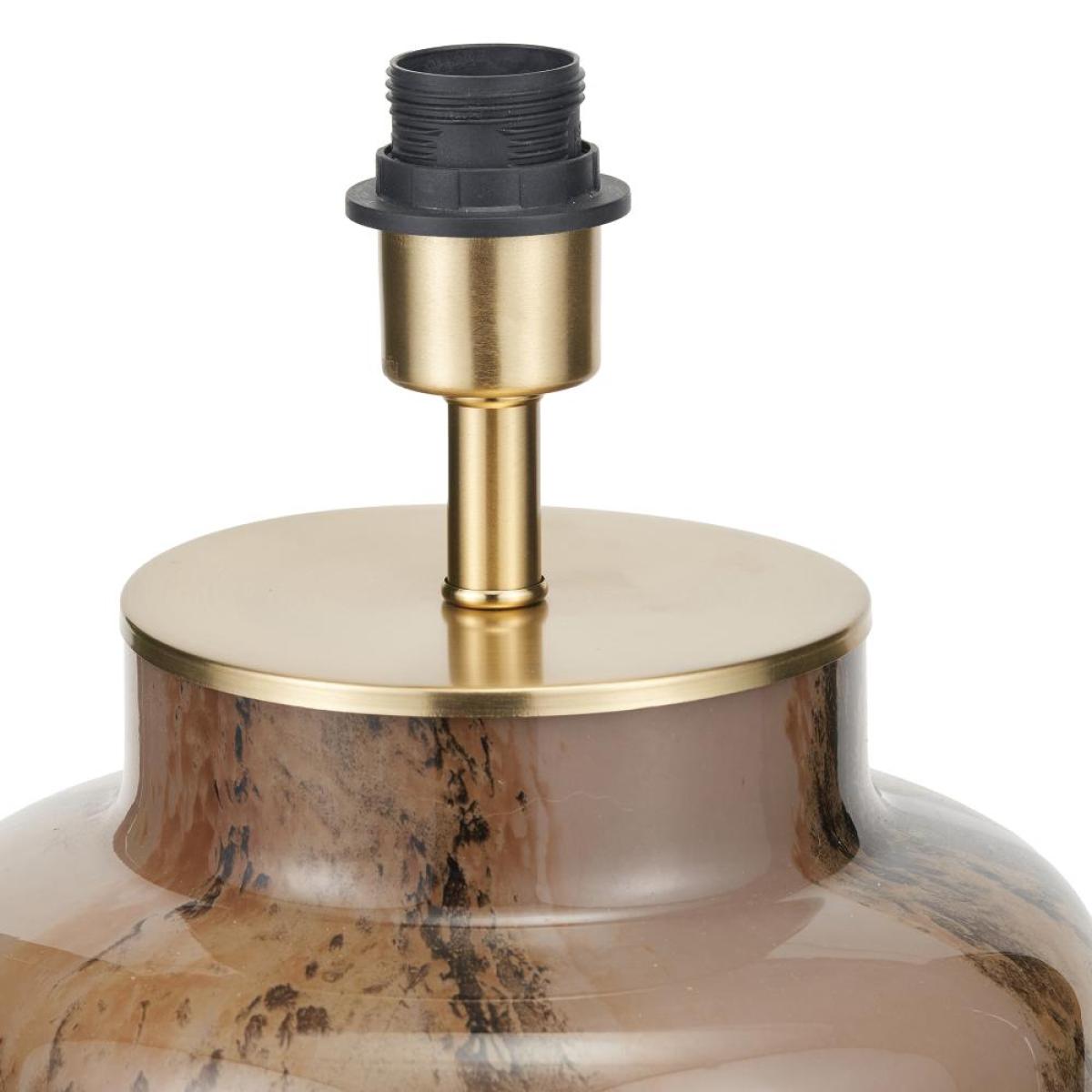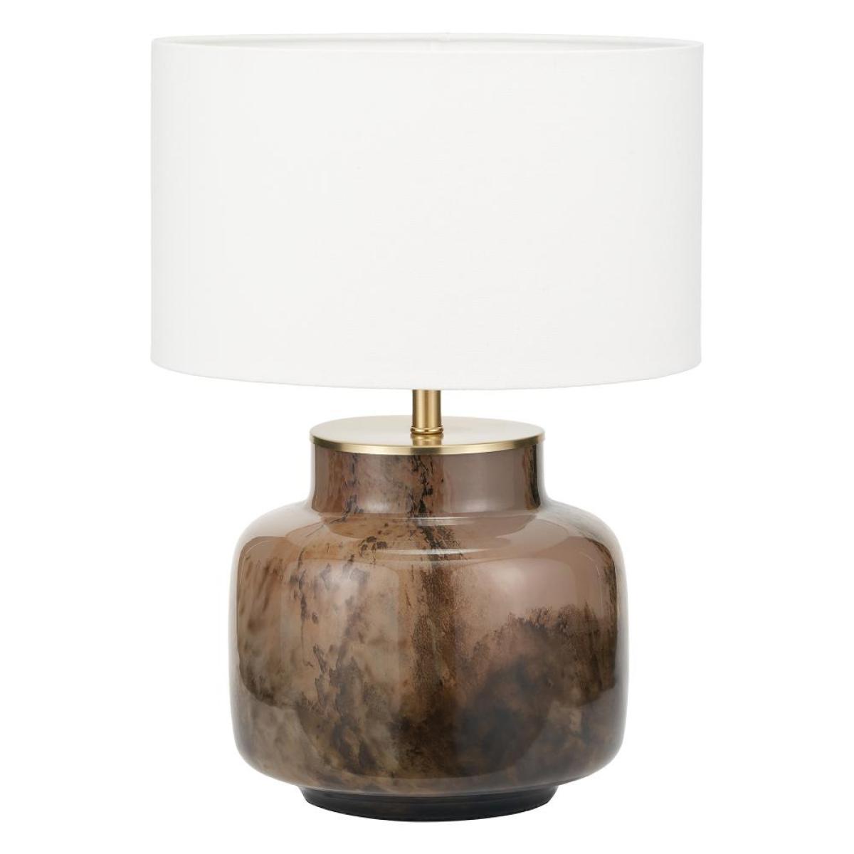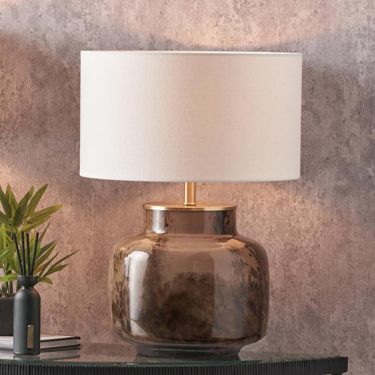 Add warmth and sophisticated style to your interior with the. Featuring a beautifully crafted smoky brown glass base with unique marbled patterns, this lamp brings natural texture and depth to any room. A classic white fabric drum shade softens light for a warm, inviting glow, while brushed brass accents add a touch of luxury and refinement. Perfectly proportioned for bedside tables, sideboards, or living room consoles, the Cerdanya lamp blends modern elegance with earthy tones for a timeless look.