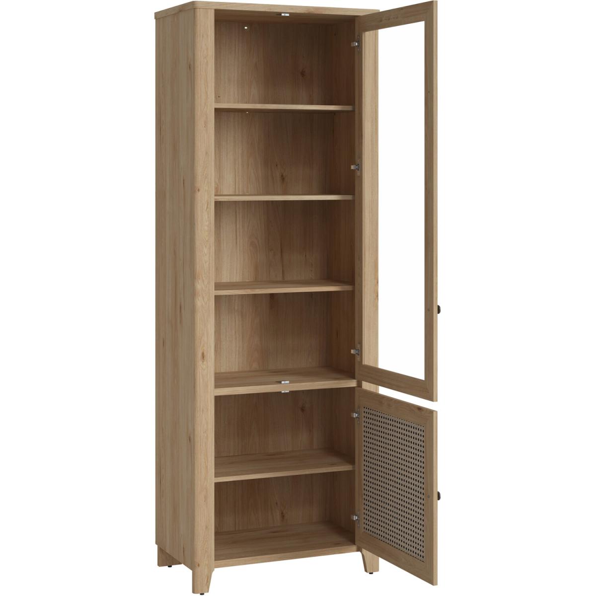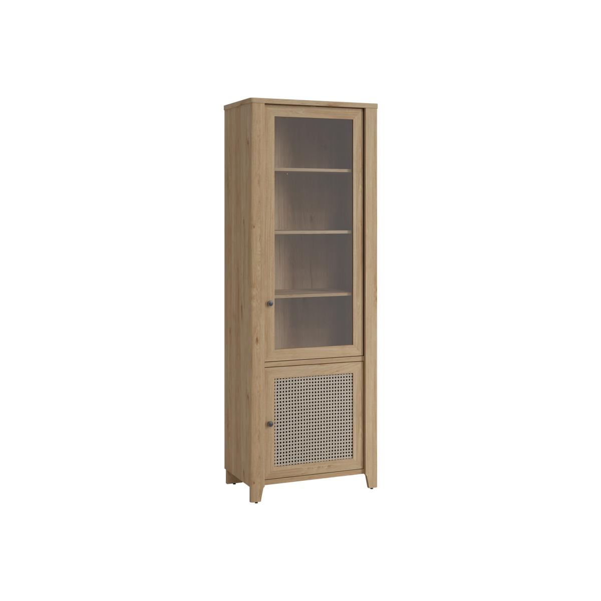 Place cutlery and crockery in the Cestino 2-Door Display Cabinet and it will perfectly complement the room's interior. Perfect for the dining room and the living room, the high single display unit is a piece of furniture that creates a unique style and emphasises the stylistic refinement of the room. Made of high-quality MDF and laminated chipboard, the high display cabinet has spacious shelves, practically covered with tempered glass. The impressive, two-door display unit is perfect for small rooms, especially in living rooms open to the kitchen, where the dining room is the connecting element. The display cabinet from the Cestino furniture collection fits perfectly into the boho style.