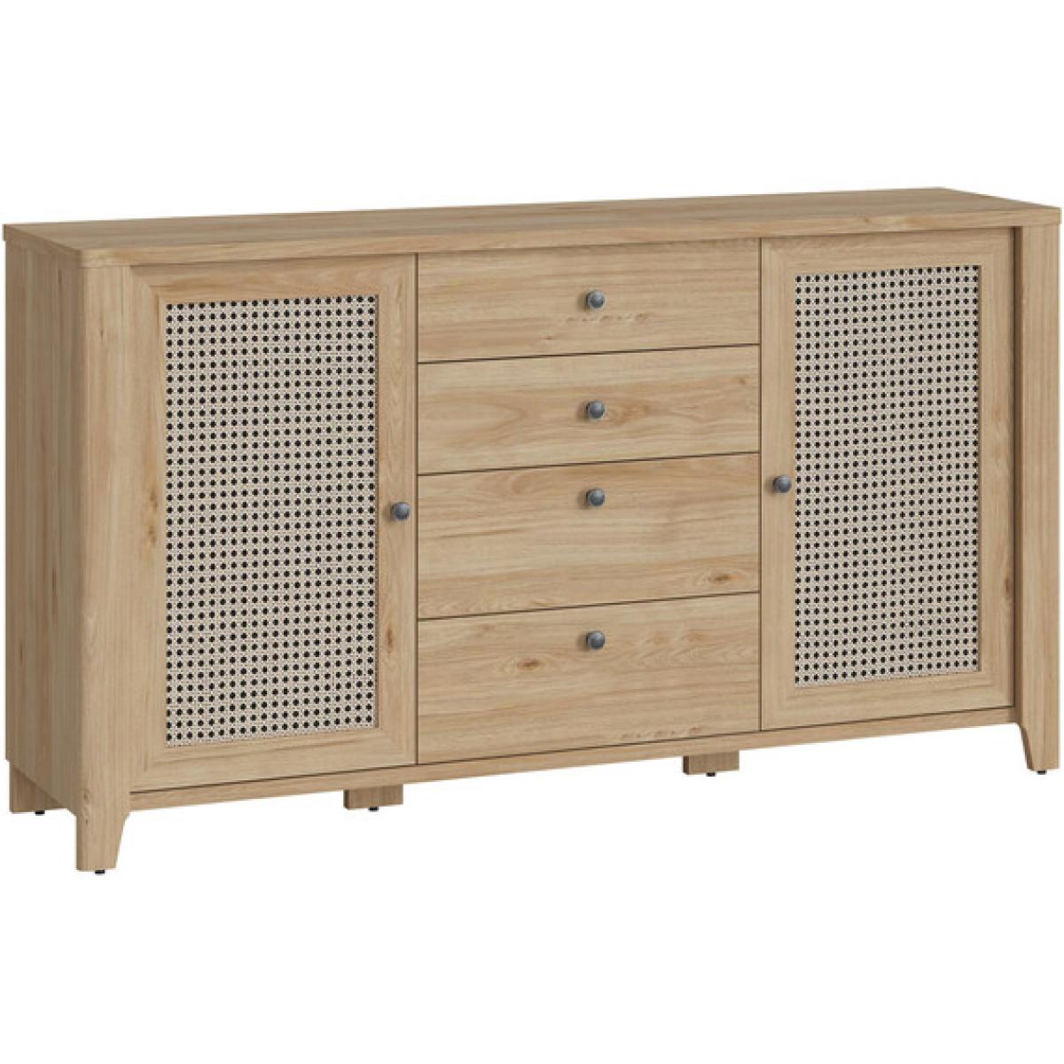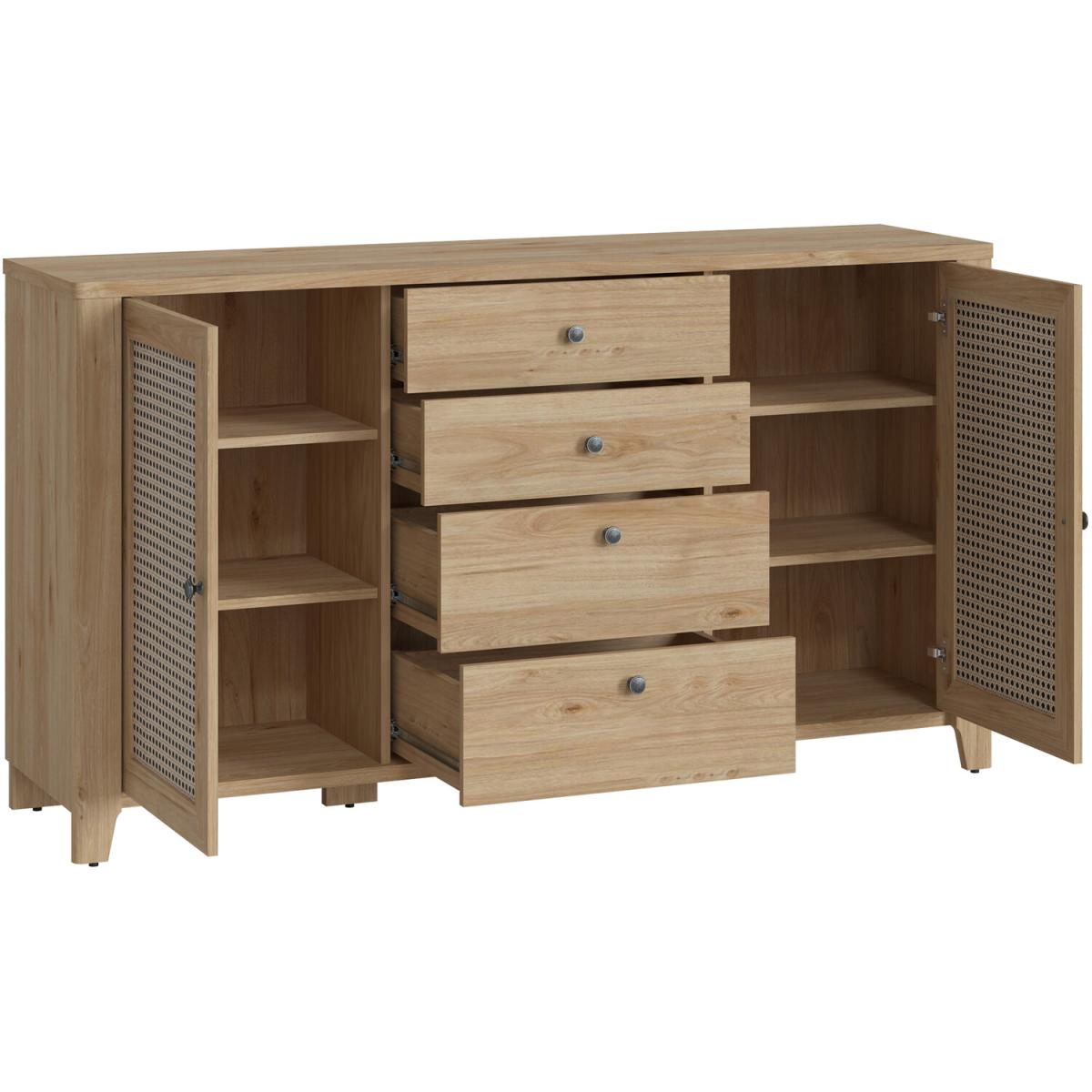Made of laminated particle board and MDF board, this roomy Cestino 2-Door Sideboard is a piece of furniture that presents high-quality workmanship. The stylish storage unit features four drawers, all equipped with a ball mechanism with full extension and spacious shelves hidden behind the fronts containing a silent closing mechanism and metal handles. The furniture is made in classic colours with a rattan effect which makes it easy to coordinate with your existing decor. The timeless chest of drawers can easily adapt to the interior in the boho and Scandinavian style. It will also work great in a classically furnished living room and an interior dominated by natural inspirations. Universal in use, a large chest of drawers with drawers and shelves can be placed in the living room, dining room, studio, home office and bedroom.