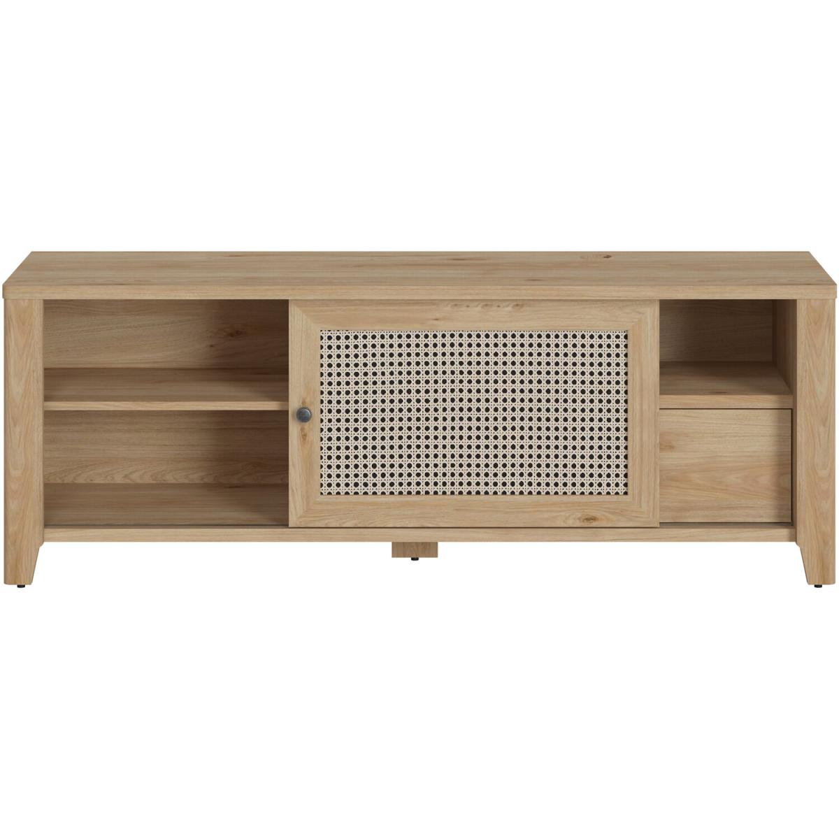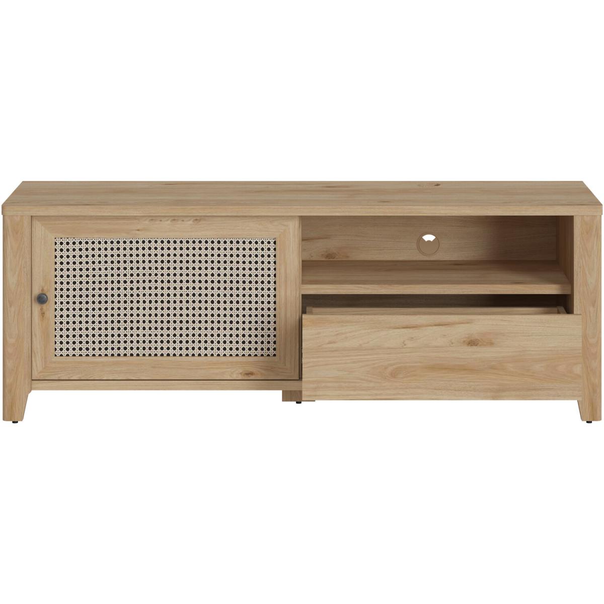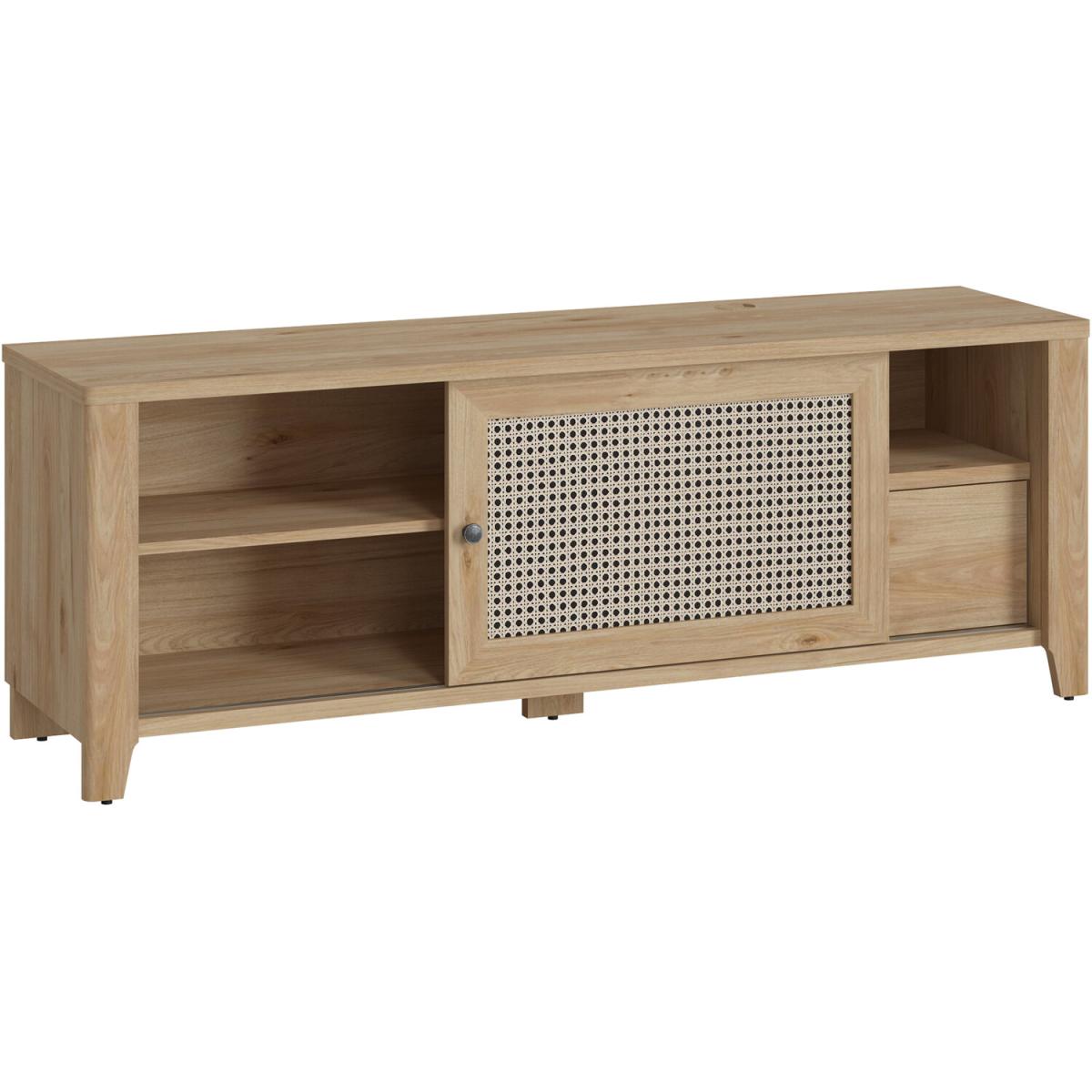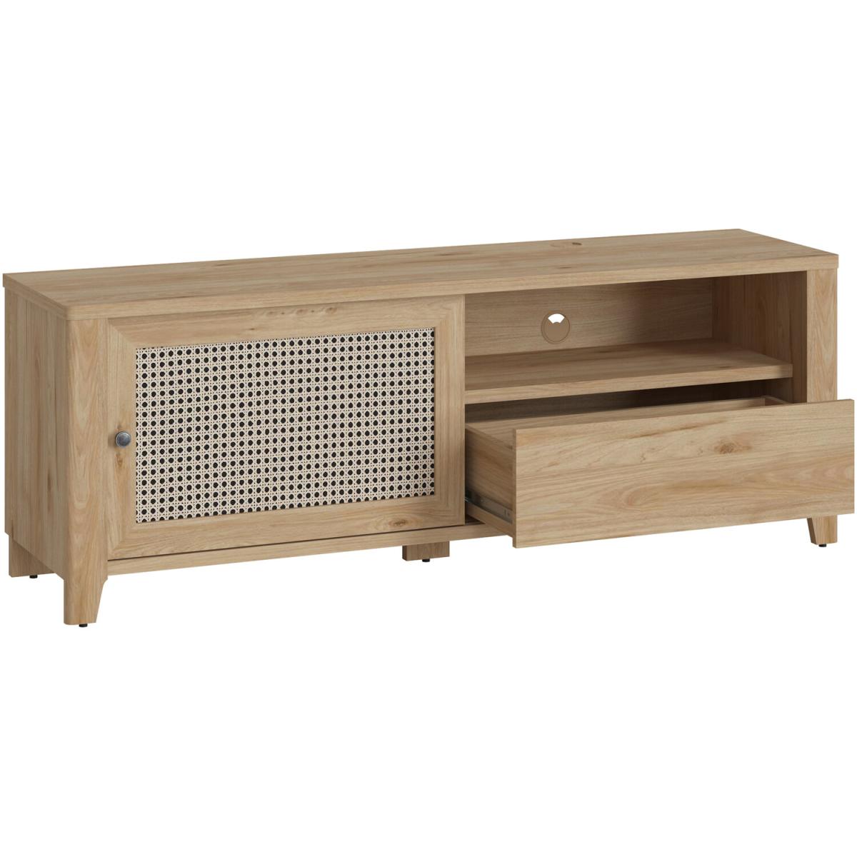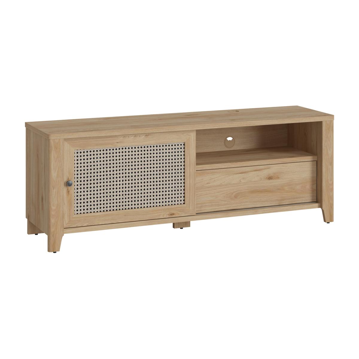 The stylish Cestino TV Unit has a shelf hidden behind a full rattan-effect front for convenient storage and an on-trend look. The whole cabinet is made of laminated chipboard with MDF elements, arranged in a gorgeous wooden shade that's easy to coordinate with your decor. This unique piece of furniture contains a modern solution with a sliding front - you decide which space you expose, while its drawer is equipped with a reliable ball mechanism that allows full extension. Above the drawer is a practical open shelf and a wiring hole to keep your TV space organised. The cabinet will be perfect for rooms decorated in a Scandinavian and boho style whilst the neutral colour and simplicity of the design makes this piece elegant and timeless.