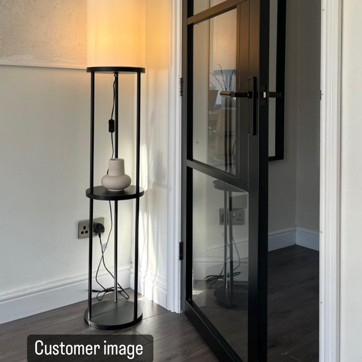 Our Kalak black metal floor lamp is slim and streamline and has built in black wooden shelves for storage and decoration. The lamp is complimented with a white fabric shade that gives off a warm and ambient light. Great for those smaller areas of the home in need of a style. 1 x E27 bulb (not included)
