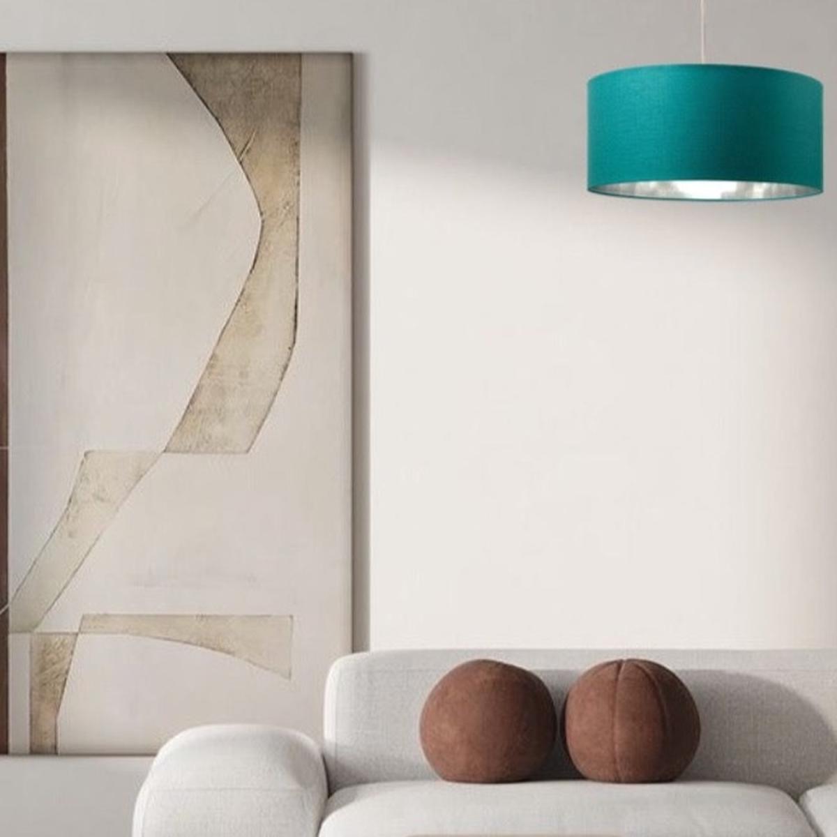 I love this teal and silver oversized velvet lamp shade for its bold colour and luxurious texture. It works particularly well in contemporary or eclectic interiors where a pop of colour can add personality, or in more muted schemes to create a statement moment. The velvet fabric offers a soft, inviting glow and helps elevate the overall aesthetic. Practical styling tips include pairing it with neutral furnishings to let the colour stand out or combining with metallic accents for a cohesive look. Given its size, it's ideal for statement lighting over dining areas or in spacious living rooms where it can serve as both a functional piece and a focal point.