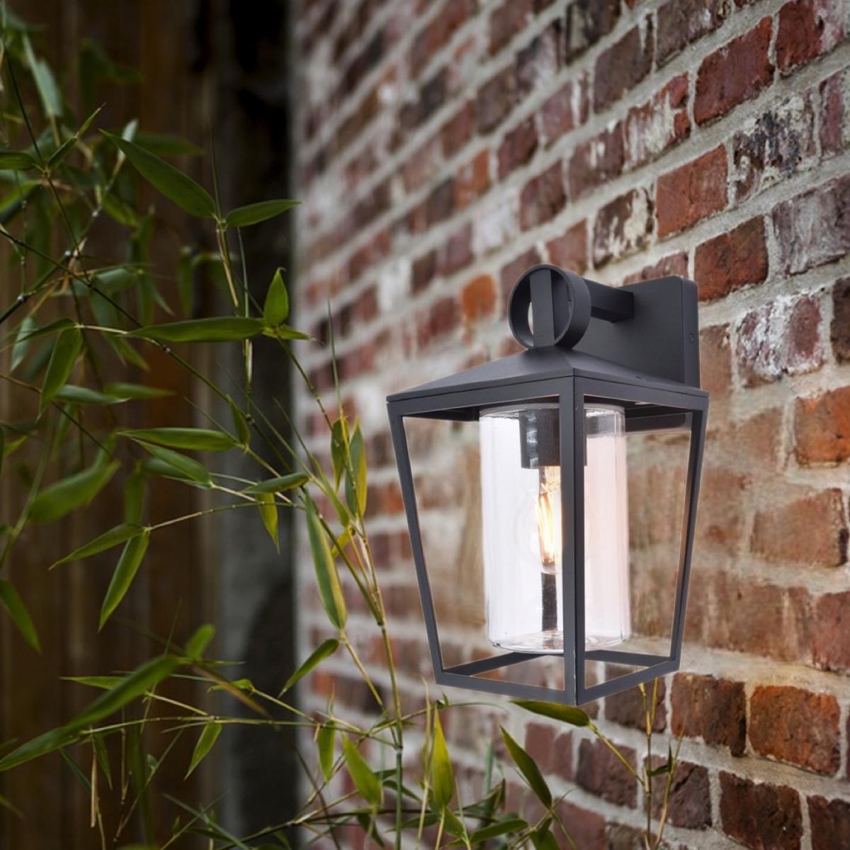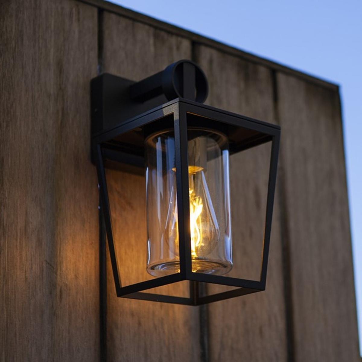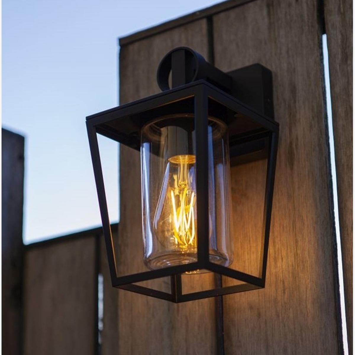 I love how this black outdoor wall light has a sleek, contemporary look that works well with various exteriors, from modern to industrial styles. Its simple geometric shape and matte finish make it versatile and unobtrusive, while the transparent glass adds a touch of warmth when illuminated. This lantern is ideal for highlighting entryways, patios, or garden walls, creating both safety and style. For styling tips, consider pairing it with similarly minimal fixtures or contrasting textures like wood or brick for visual interest. It works particularly well in outdoor spaces with a clean, understated aesthetic, and adding a warm filament bulb can enhance its welcoming vibe.