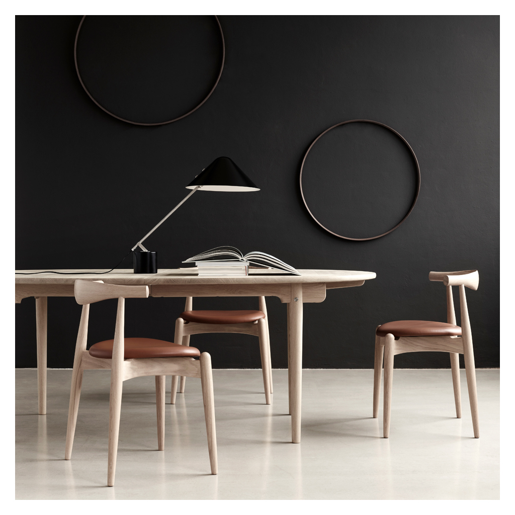 Designed by Hans J. Wegner in 1956, the CH20 Elbow Chair, upholstered in Thor Leather, is an exceptionally comfortable dining chair that, despite its lightweight appearance, is extremely stable. A modern dining chair that offers great comfort and stability, the CH20 Elbow Chair references the simple lines of the 1950s and 1960s and will surprisingly complement both contemporary and vintage-inspired interiors. Exquisitely crafted with a Danish oiled-oak frame that showcases the unique graining of the wood, the wooden seat is beautifully upholstered in Thor leather. Thor is a semi-aniline ox hide, which offers a natural grain and is coated for protection. Manufactured by Danish design icons, Carl Hansen & Son, the CH20 Elbow Chair is a lesson in enduring craftsmanship. Stackable and sturdy, the CH20 chair's low back makes it a reliable option for your workspace, or a comfortable alternative dining chair. The CH20 Elbow Chair is testament to Hans J. Wegner's aptitude for finding beauty in minimalist forms, and would make a truly unique, timeless addition to your space.