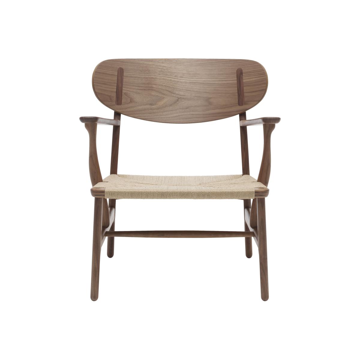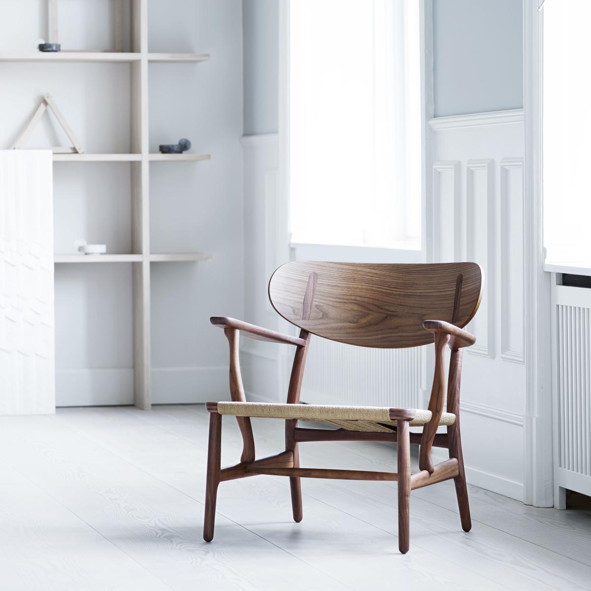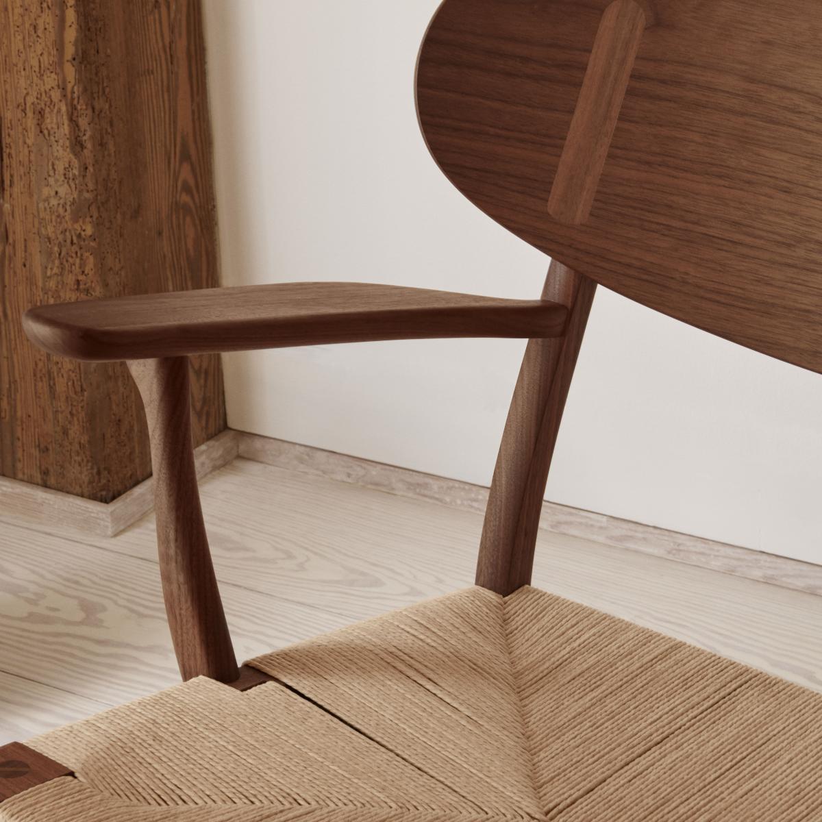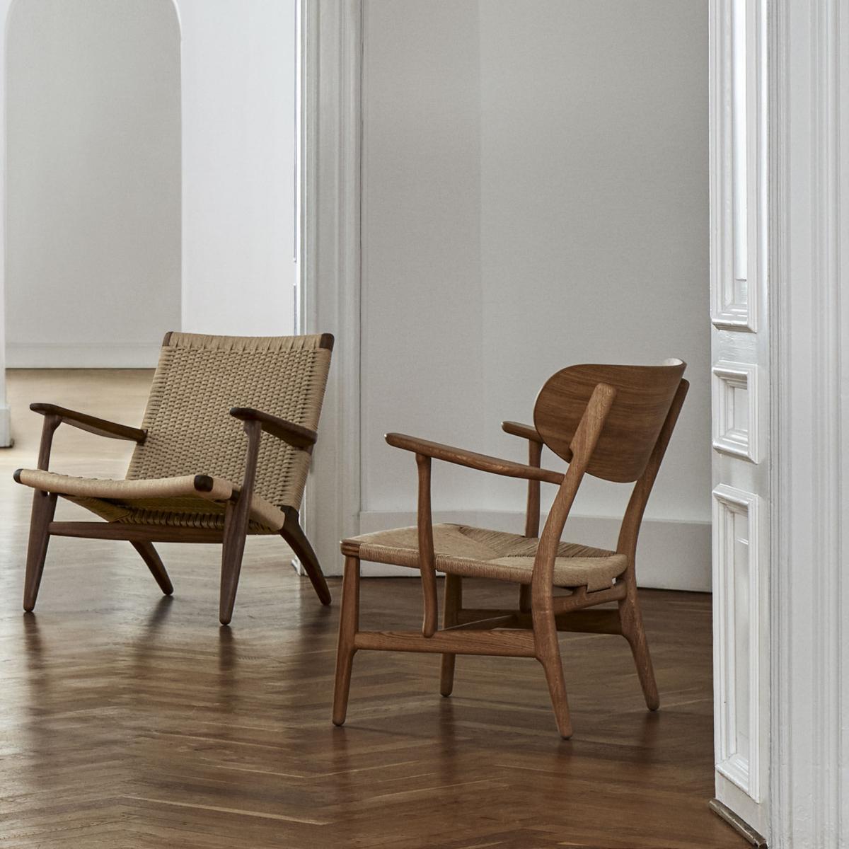 Since 1908, Carl Hansen & Søn has embodied the quintessence of Danish design by combining craftsmanship, quality and innovation. The brand brings together a collection of masterpieces of Scandinavian design: iconic items created by the greatest Danish designers. Handcrafted in Denmark, these pieces with their exceptional quality stand the test of time. With the strictest respect for the original models, Carl Hansen & Søn reissues the legendary creations of Hans J. Wegner (1914 – 2007), considered one of the founders of Scandinavian design. Released in 1950, the CH22 lounge chair is part of the first collection designed by Hans J. Wegner for Carl Hansen & Søn. These wooden chairs with their paper cord seats are today among the designer's best-known and most sought-after creations. These highly modern pieces of furniture set new standards in design. The ergonomics, clean, organic contours and refined style illustrate the unique design approach and insightful know-how of the young Hans J. Wegner. After a decades-long hiatus, Carl Hansen & Søn started producing the CH22 lounge chair again in 2016. As always, the design remains faithful to Wegner's original hand-drawn sketches, with all aesthetic and structural components intact. The large, curved wooden backrest with its visible caps is typical of Wegner's work. The seat is covered with braided paper cord. Robust and durable, the paper cord perfectly imitates plant fibre, with its warm, natural aspect. It's lifespan easily stretches over 50 years and is (at least) as durable as textiles and quality leather. Although production has naturally been modernised, today, the CH22 is still manufactured according to the same artisanal principles as when Wegner followed and participated in the manufacture of the first examples in Carl Hansen's family workshop in 1950. In the meantime, modernisation has improved accuracy. The front legs, which were originally round, can now have the same profile as the chair’s rear legs. This means they’re now manufactured as Wegner originally drew them on his technical drawing. The CH22 lounge chair is much more than just a piece of furniture: it's a functional work of art that embodies the heritage of Danish design.