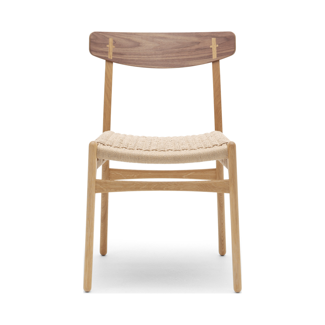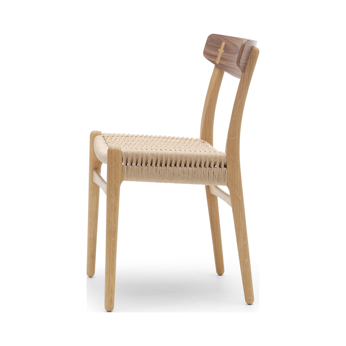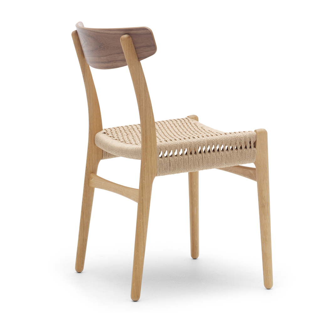 Out of production for 50 years and specially re-introduced for 2017, the oiled oak and walnut CH23 Side Chair with a natural paper cord seat was designed by Hans J. Wegner exclusively for Carl Hansen & Son. One of the first pieces Wegner designed exclusively for Carl Hansen & Son, the CH23 Side Chair in oiled oak and walnut is emblematic of Wenger's design style: straightforward, functional and timelessly beautiful. A demonstration of Wegner's insightful craftsmanship, this oiled oak and walnut CH23 Chair showcases several of his celebrated design details: the shape of the elegant cover caps on the top rail, the special double-woven natural paper cord seat and the curved shape of the rear legs, which ensures optimal stability. This CH23 Side Chair is rich in detail, yet retains its minimal and lightweight quality. With no armrests, the oiled oak and walnut CH23 Side Chair is ideal for fitting around the dining table and makes for a classic seating option in smaller rooms. Thanks to its ingenious design and organic contours, Hans. J Wegner's CH23 Side Chair offers comfort, stability and style, making a striking piece for any sophisticated interior. This re-released CH23 Side Chair presents a unique opportunity to own a true collector's item that is sure to be passed down through generations.