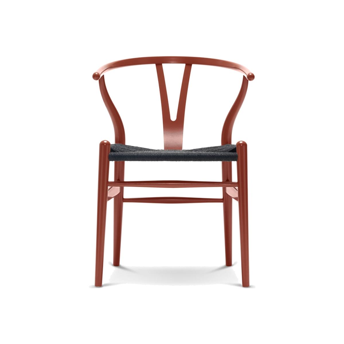 The Wishbone Chair with a red-brown beech frame and black paper cord seat was first designed by Hans J. Wegner in 1949 and is crafted today to his exacting standards by Carl Hansen & Søn. Inspired by a portrait of Danish merchants sitting in traditional Ming chairs, this original design showcases the ergonomic sensibility that defines an antique Chinese chair. With its steam-bent top rail and wonderfully sculptural shape, the lightweight chair allows for freedom of movement and superior comfort, making it an ideal piece for both work and relaxation spaces. The chair's characteristic 'Y'-shaped detail gives the chair its name and also provides exquisite support and stability. Involving over 100 hand-rendered production steps in total, the seat is beautifully hand-woven from 120 metres of paper cord that can last up to 50 years.