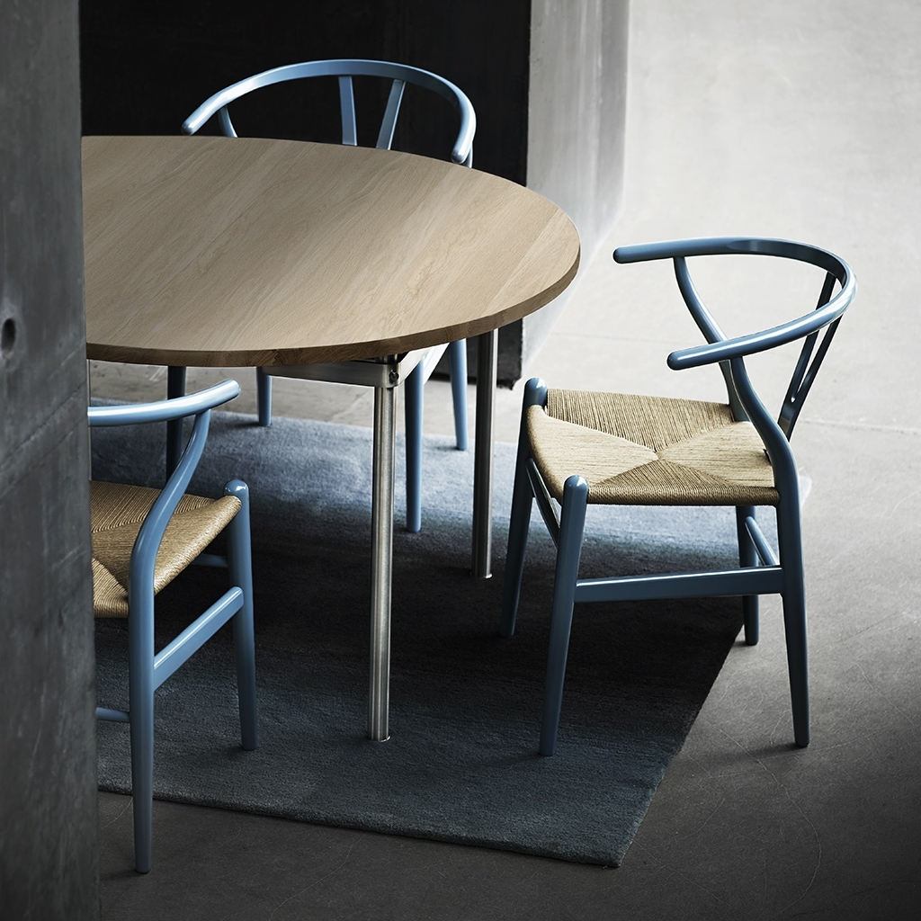 The Wishbone Chair with a steel-blue beech frame and naturally hued paper cord seat was first designed by Hans J. Wegner in 1949 and is crafted today to his exacting standards by Carl Hansen & Søn. Inspired by a portrait of Danish merchants sitting in traditional Ming chairs, this original design showcases the ergonomic sensibility that defines an antique Chinese chair. With its steam-bent top rail and wonderfully sculptural shape, the lightweight chair allows for freedom of movement and superior comfort, making it an ideal piece for both work and relaxation spaces. The chair's characteristic 'Y'-shaped detail gives the chair its name and also provides exquisite support and stability. Involving over 100 hand-rendered production steps in total, the seat is beautifully hand-woven from 120 metres of paper cord that can last up to 50 years.