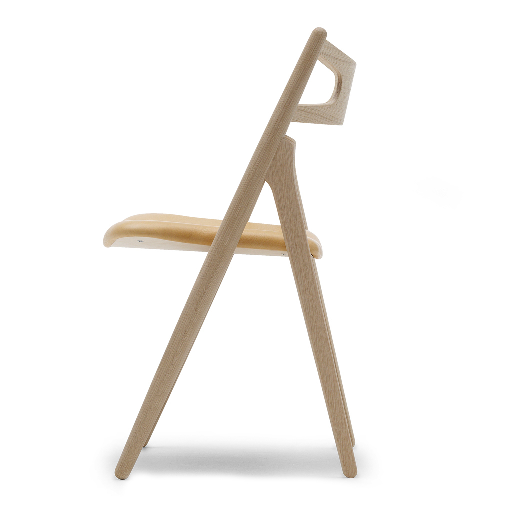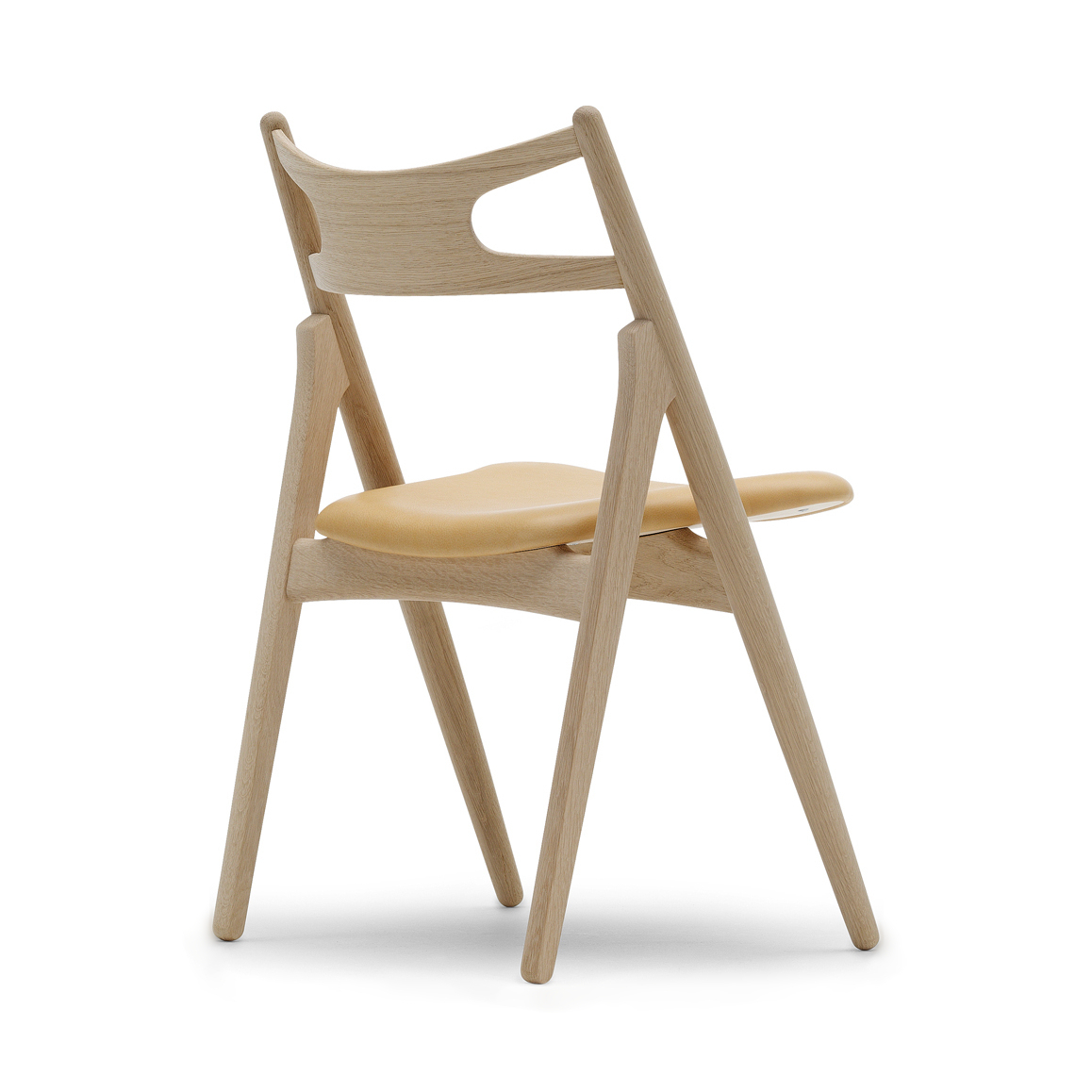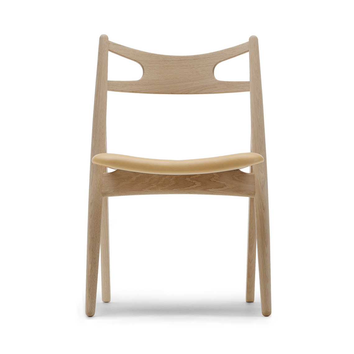 Also known as the 'Sawbuck Chair', the CH29 Chair by Hans Wegner is manufactured to exacting standards by master craftspeople at Carl Hansen & Son and is crafted from soaped oak in a contemporary curved form. Originally designed in 1952, the 'Sawbuck Chair' was so-named due to its legs' resemblance to simple sawbucks or saw horses used by carpenters. Originally taken out of production in 1970, it was Wegner's daughter Marianne who suggested it be reissued 20 years later, to great success and acclaim. Carefully crafted from oak treated with soap to lighten and enhance the unique graining of the wood, the CH29 Chair is produced in accordance to Wegner's original specifications. Combining a complex structure with soft curves and organic shapes, the CH29 Chair has a solid wood frame and distinctively moulded back shell, with an ergonomic seat upholstered with Carl Hansen & Son's premium Sif leather: a full-grain, uncoated pure aniline ox hide with high breathability that will age with patina and grace. The CH29 Chair offers comfort, stability and style, and would make a striking piece for any sophisticated interior. Perfect as a statement chair in a dining room or workspace, Wegner's CH29 in soaped oak and leather combines timeless style with a contemporary edge.