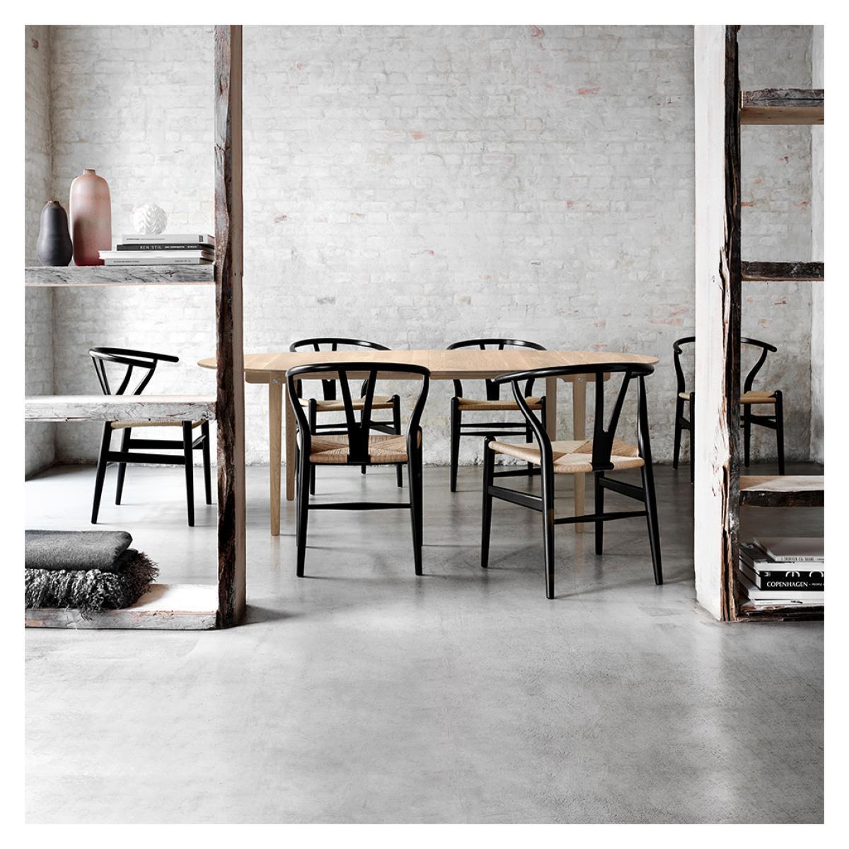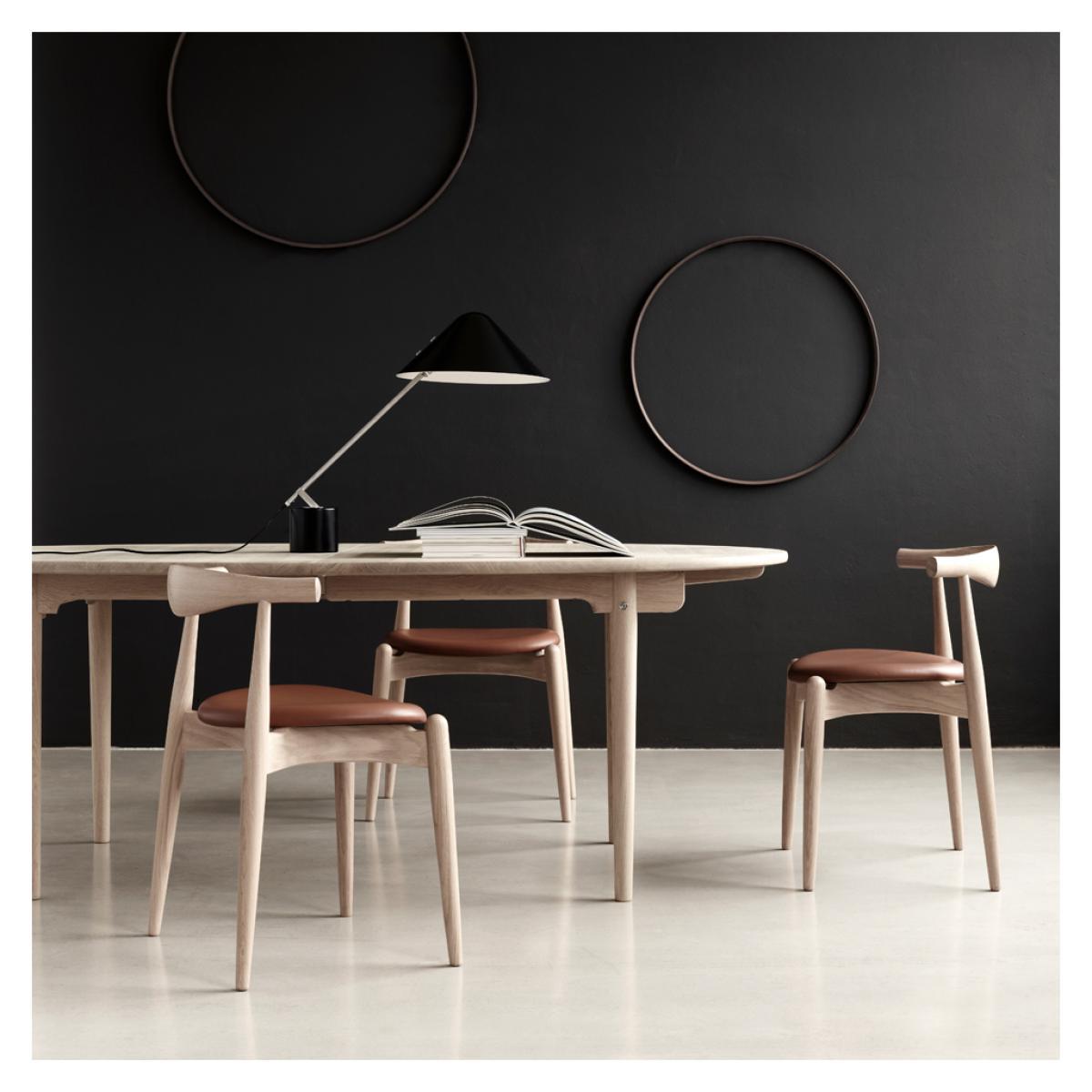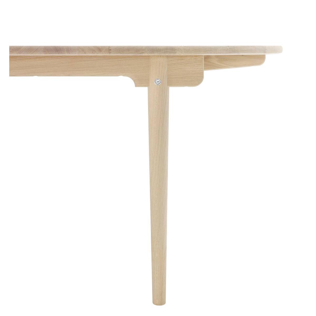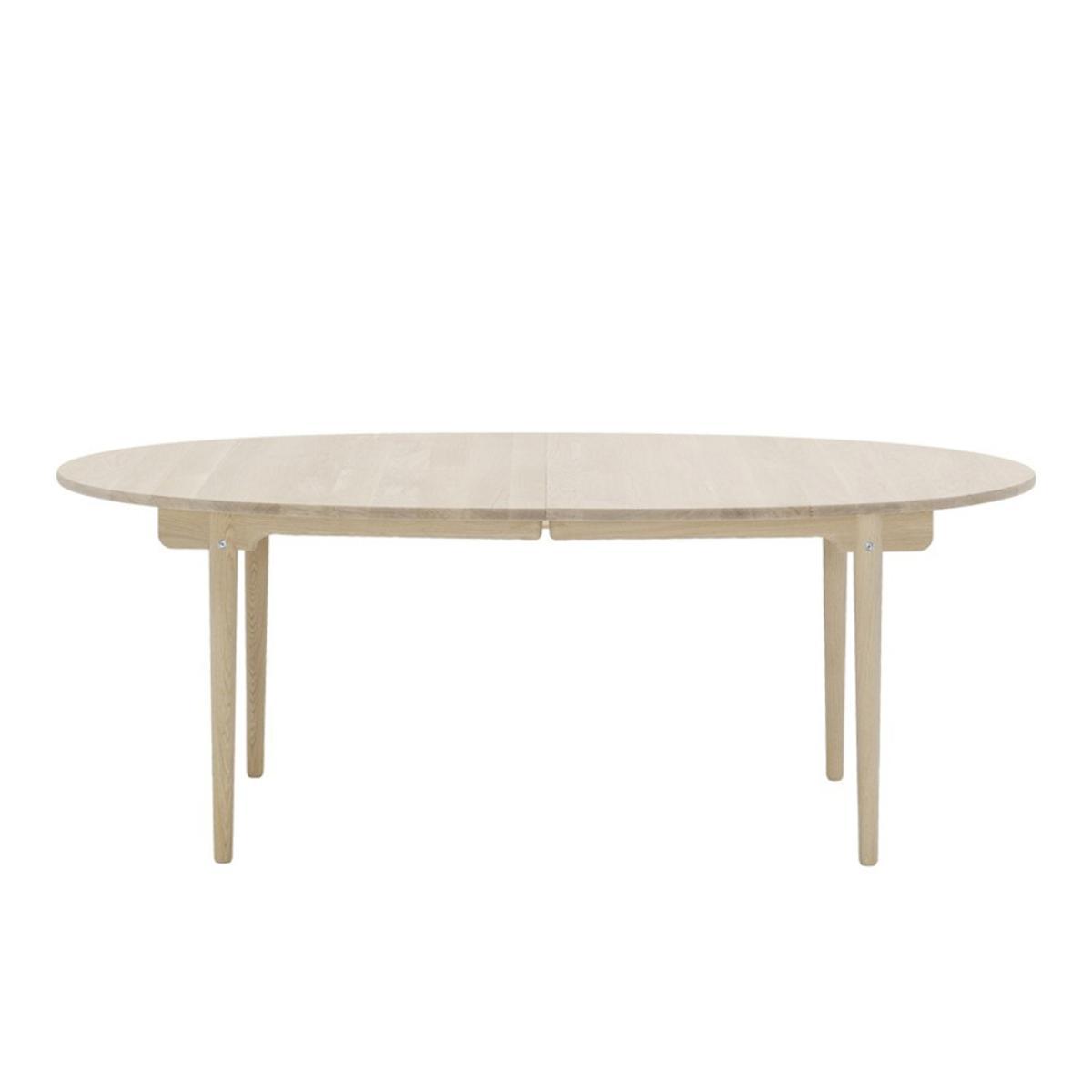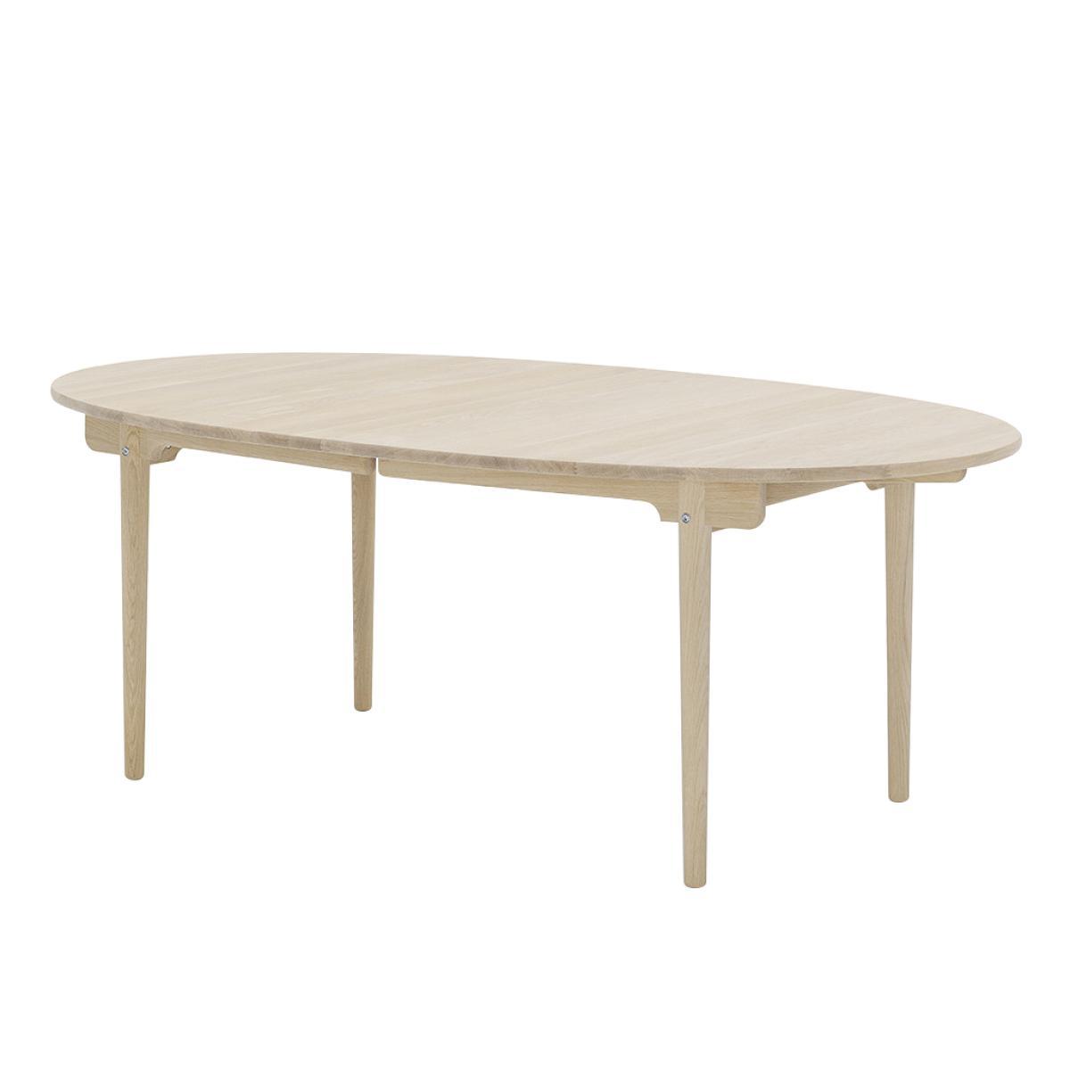 A beautiful example of Danish designer, Hans J. Wegner's visionary works, the elliptical CH338 dining table offers simplicity, elegance and functionality. Designed in 1962, the tabletop and legs are crafted from solid oak wood, finished with a subtle soap effect to allow it to adapt to any contemporary setting. Created to have perfectly rounded edges, the CH338 Table has no corners to ensure it remains compact within its setting. Crafted in Denmark by artisans at the prestigious Carl Hansen workshop, the CH338 Table is the smaller version of the CH339 Table and is created to exacting standards for longevity and a classic finish. Hans Wegner was one of the most prolific designers of the 20th century, having created over 500 different chairs over the course of his career. He began work as a cabinetmaker, providing him with a profound respect for the properties of wood, as well as exacting joinery techniques. He joined Arne Jacobsen and Erik Moller, designing furniture pieces for the new city hall in Århus in 1940, the same year in which he began collaborating with Holger Hasen, whose company, Carl Hansen & Son continue to produce Wegner's classic pieces, including the elliptical dining table. This table is created with a central seam, which allows it to become extendable with wooden inserts. Home life - Carl Hansen & Son from Monocle on Vimeo. View our entire range of furniture from Hans J. Wegner