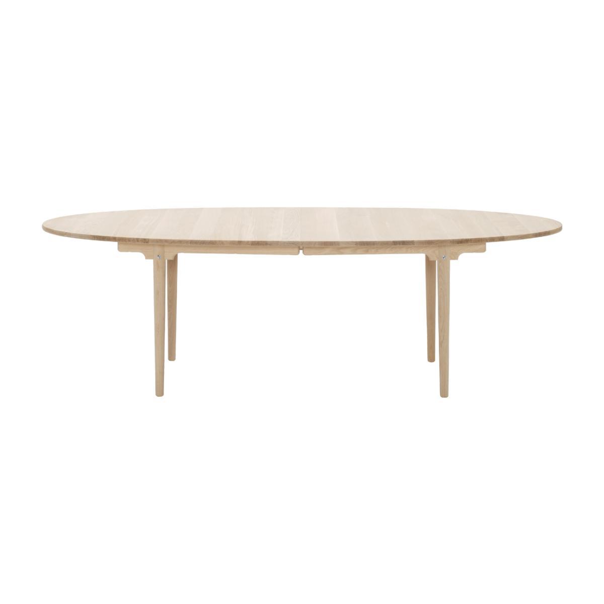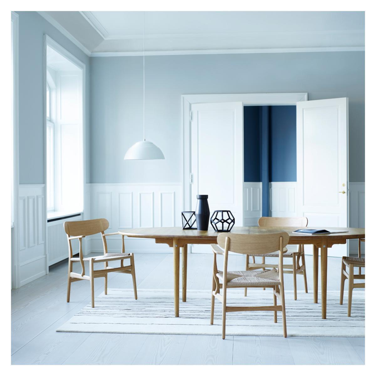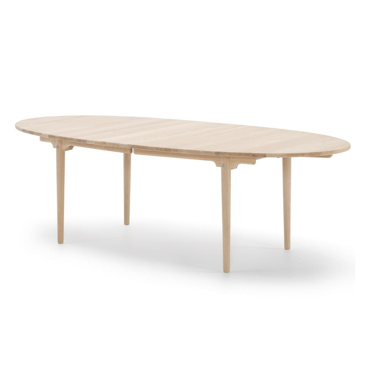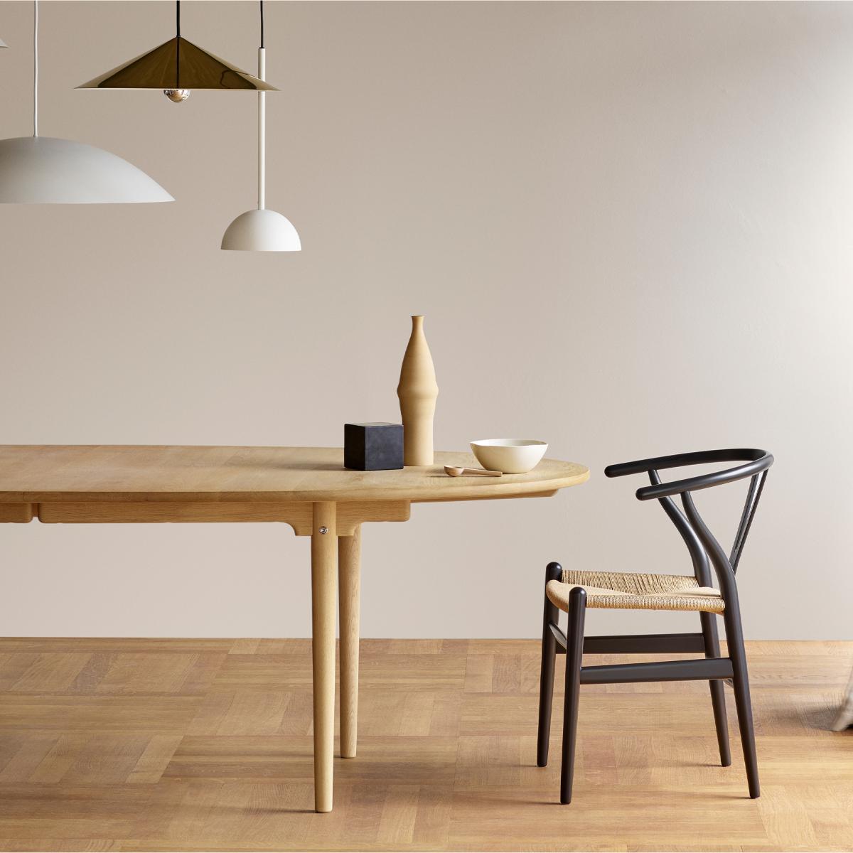 A beautiful example of Danish designer, Hans J. Wegner’s visionary works, the elliptical CH339 dining table offers simplicity, elegance and functionality. Designed in 1962, the tabletop and legs are crafted from solid oak wood, finished with a subtle soap effect to allow it to adapt to any contemporary setting. Created to have perfectly rounded edges, the CH339 Table has no corners to ensure it remains compact within its setting. Crafted in Denmark by artisans at the prestigious Carl Hansen workshop, the CH339 Table is the larger version of the CH338 Table and is created to exacting standards for longevity and a classic finish. Hans Wegner was one of the most prolific designers of the 20th century, having created over 500 different chairs over the course of his career. He began work as a cabinetmaker, providing him with a profound respect for the properties of wood, as well as exacting joinery techniques. He joined Arne Jacobsen and Erik Møller, designing furniture pieces for the new city hall in Århus in 1940, the same year in which he began collaborating with Holger Hasen, whose company, Carl Hansen & Son continue to produce Wegner’s classic pieces, including the elliptical dining table. This table is supplied with a central seam and extension leaf, which allows it to become extendable to 300cm. In-store. Home life - Carl Hansen & Søn. From. Monocle. On. Vimeo. View our entire range of furniture from Hans J. Wegner.