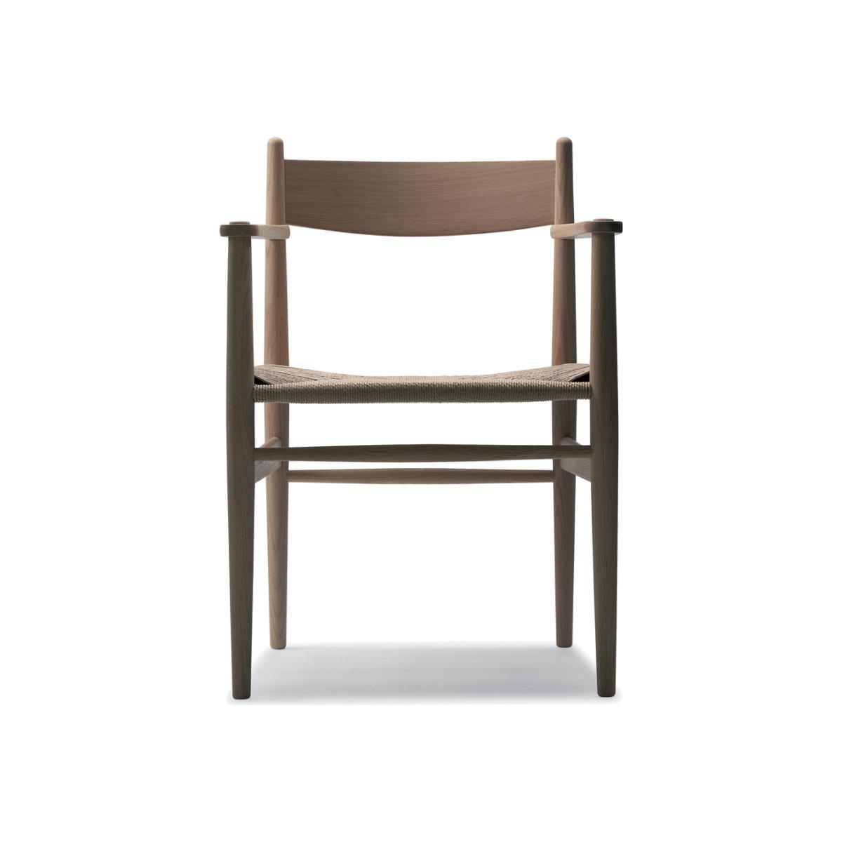 Expertly manufactured by master craftspeople at Carl Hansen & Son, this soaped oak edition of the CH37 Armchair is a clean-lined masterpiece of Danish furniture design history with a natural hand-woven paper cord seat. Originally designed by Hans J. Wegner in 1962, the CH37 Armchair has been treated with wood soap to enhance and lighten the grain while showcasing a simple, functional structure that is as beautiful to behold as it is comfortable to sit in. Crafted with a gently rounded back panel, the lightweight CH37 Armchair allows for freedom of movement and superior comfort, making it an ideal design for both relaxation and dining spaces. Simple and thoughtfully made, the design references its influence of Shaker furniture principles, integrated with Wegner's own inimitable touches: gently tapering legs for a light appearance, enhanced back support and the Carl Hansen & Son signature hand-woven paper cord seat that appears both sturdy and delicate all at once. The CH37 Armchair in a soaped oak finish is an excellent example of iconic Danish designer Hans J. Wegner's constant striving towards organic simplicity in his work and his desire to create sculptural beauty, comfort and outstanding stability.