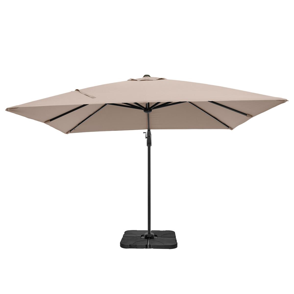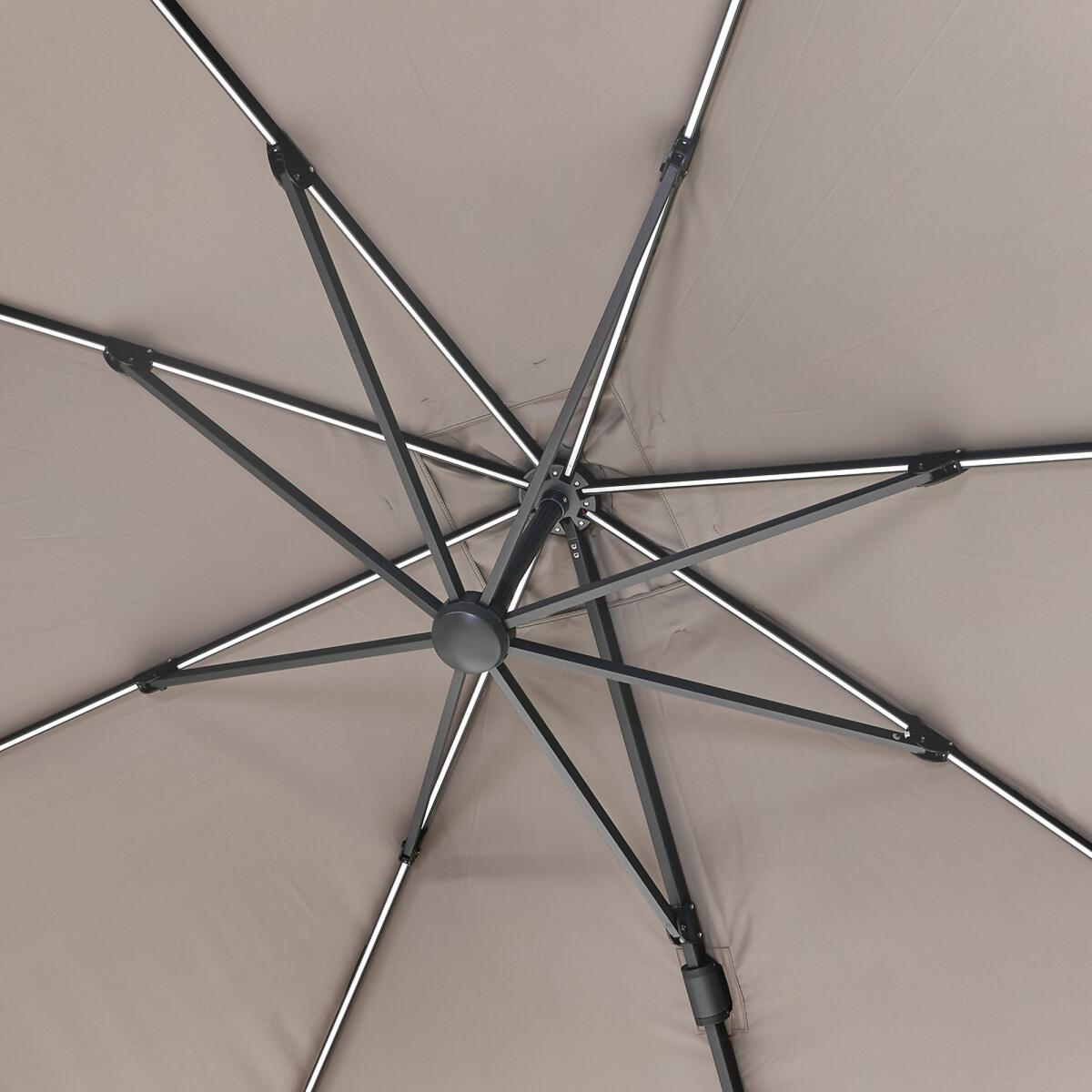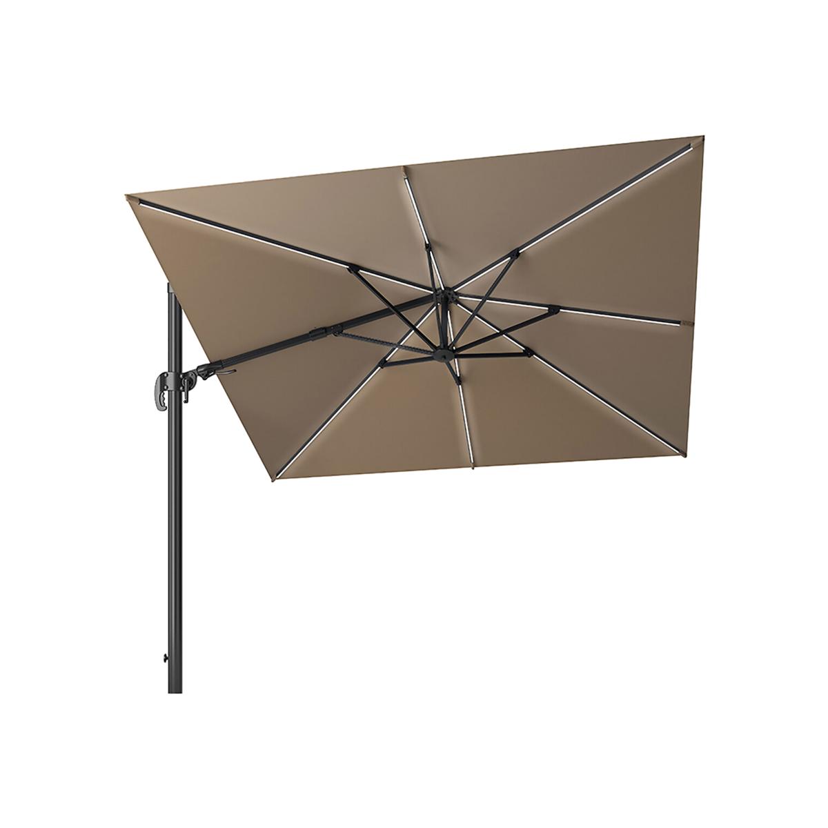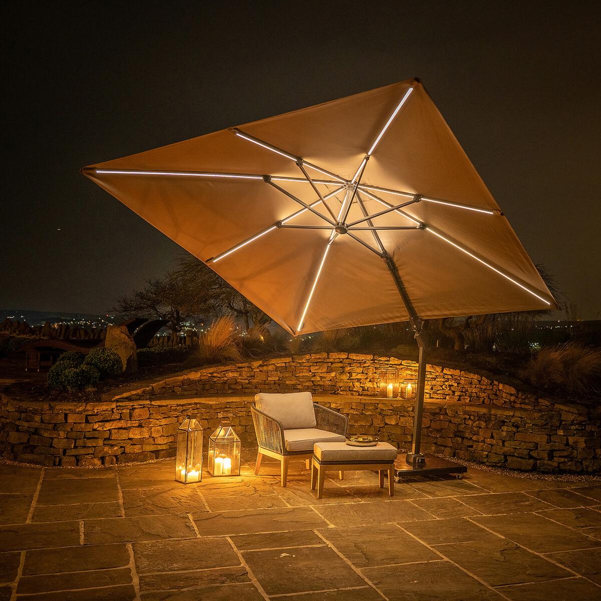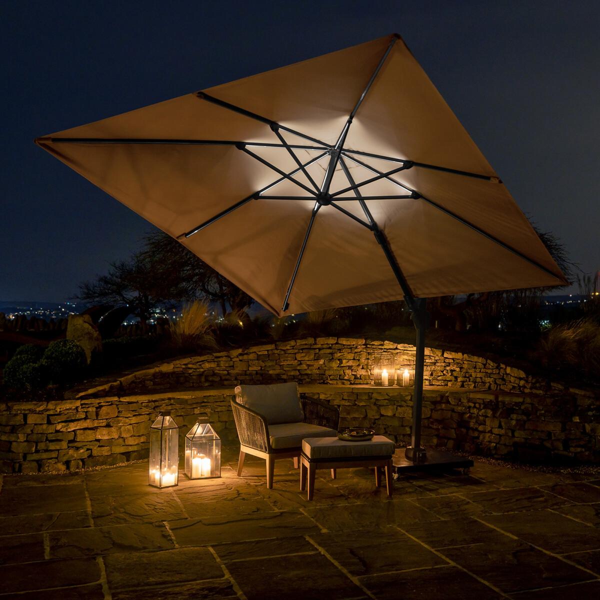 The lighting is integrated into the ribs of the parasol and can shine both upwards and downwards, all while being easy to operate. The glow is wireless and comes with two batteries and a charger. This parasol can rotate 360 degrees and can be tilted forwards, backwards and sideways for all day sun protection. The double tilt mechanism is equipped with a stainless steel interior and aluminium housing. You can turn the sunshade towards the sun without moving the parasol base with the help of the cast aluminium crank, which is easy to use, allowing you to turn the parasol 360 degrees and open and close it. The Recommended base weight for the Glow parasol is 90kg. This parasol’s material class = 2, meaning it’s 100% Polyester, 300g, UPF 35+, PU coated and has a water/dirt resistant coating. Packaged Dimensions: 258cmx 39cmx 16cm Weight: 26kg. Please note Parasol Bases are sold separately. This item can be delivered to all UK Mainland postcodes with the exception of the following postcodes starting with; AB, BT, DD, IV, KW1-14, PA21-38, PH, TR17-27 & ALL ROI.This product will be dispatched by one of our trusted suppliers. You’ll be contacted by their selected courier about your delivery.