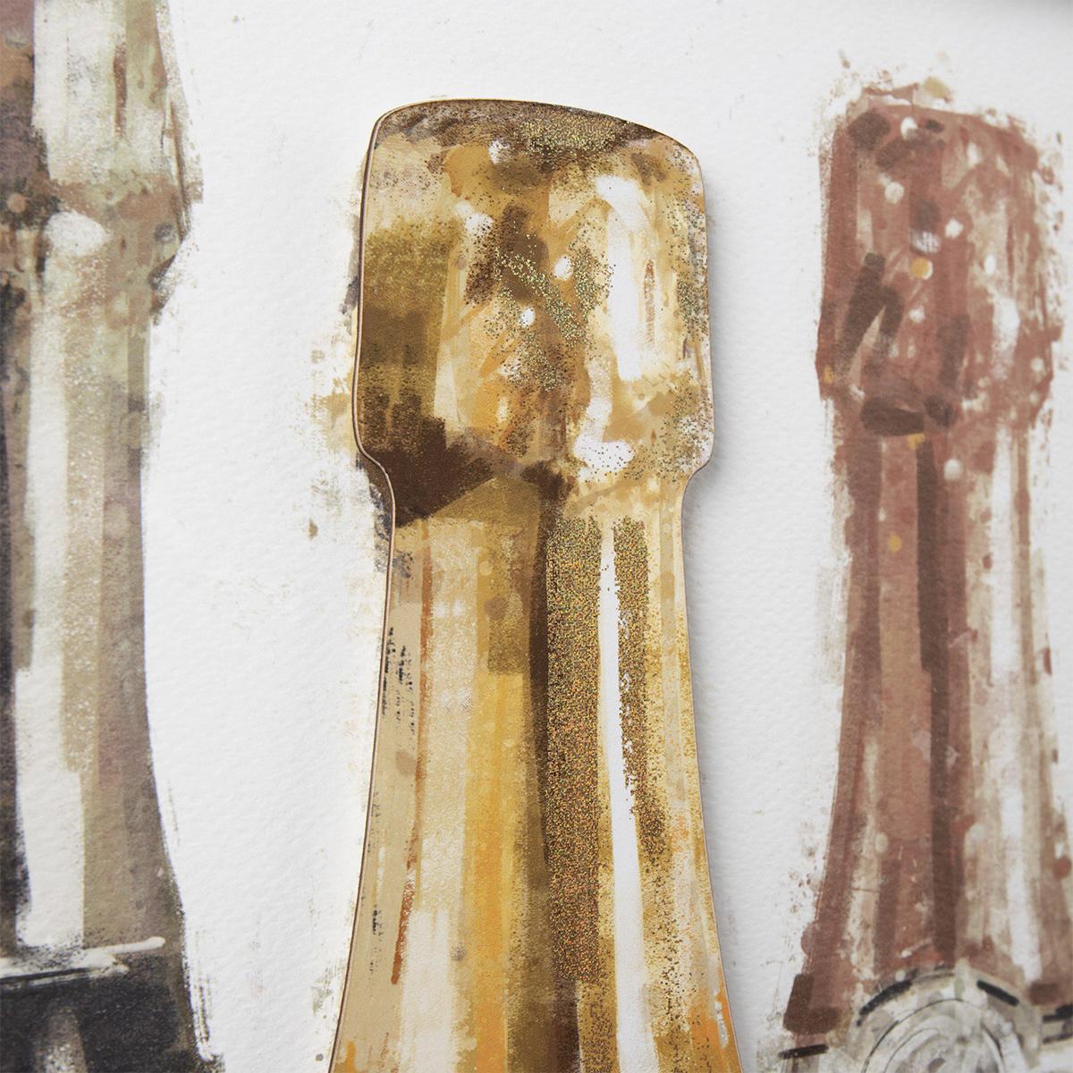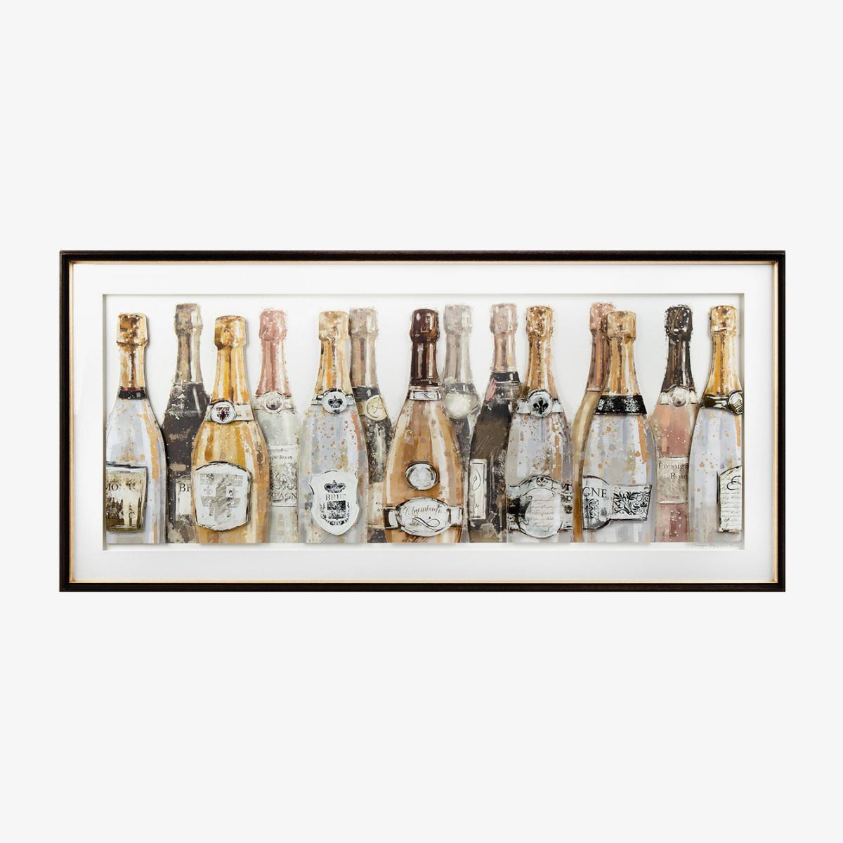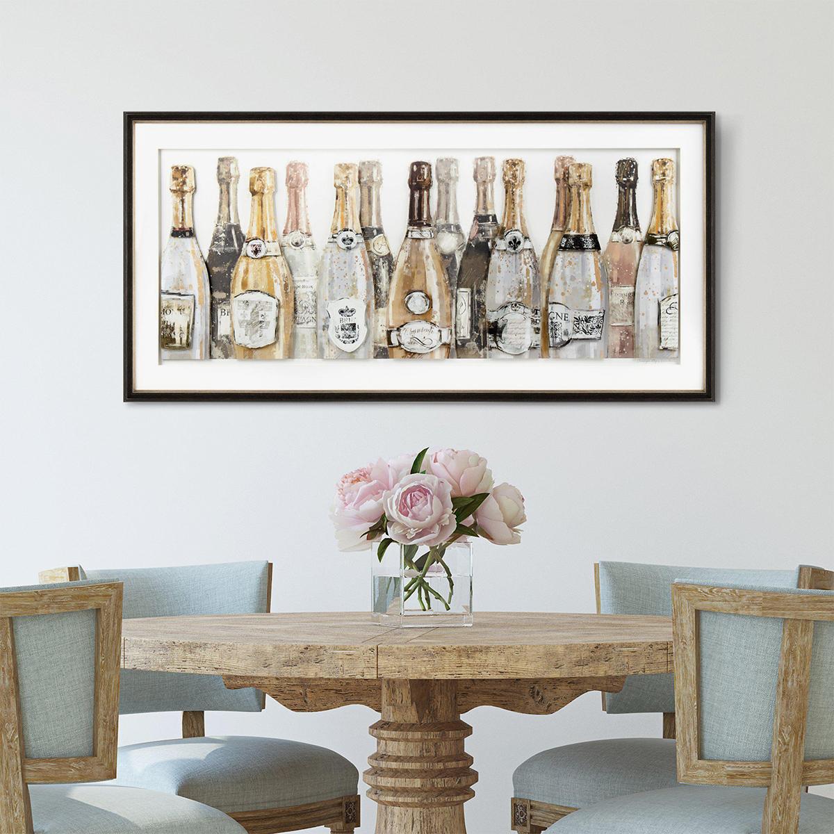 I love the Champagne Celebrations print for its fun, festive vibe and its versatility. It works particularly well in lively social spaces like dining areas, home bars, or even a breakfast nook to add a celebratory touch. Its neutral tones and subtle metallic accents make it easy to incorporate into both modern and eclectic interiors, and it pairs nicely with brass or gold accessories. For styling tips, consider grouping it with other smaller artwork or framing it in a sleek, slim frame to keep the focus on the bottles, or hang it as a standalone statement in an empty wall. It’s a light-hearted piece that brings personality and a hint of luxury to any space.
