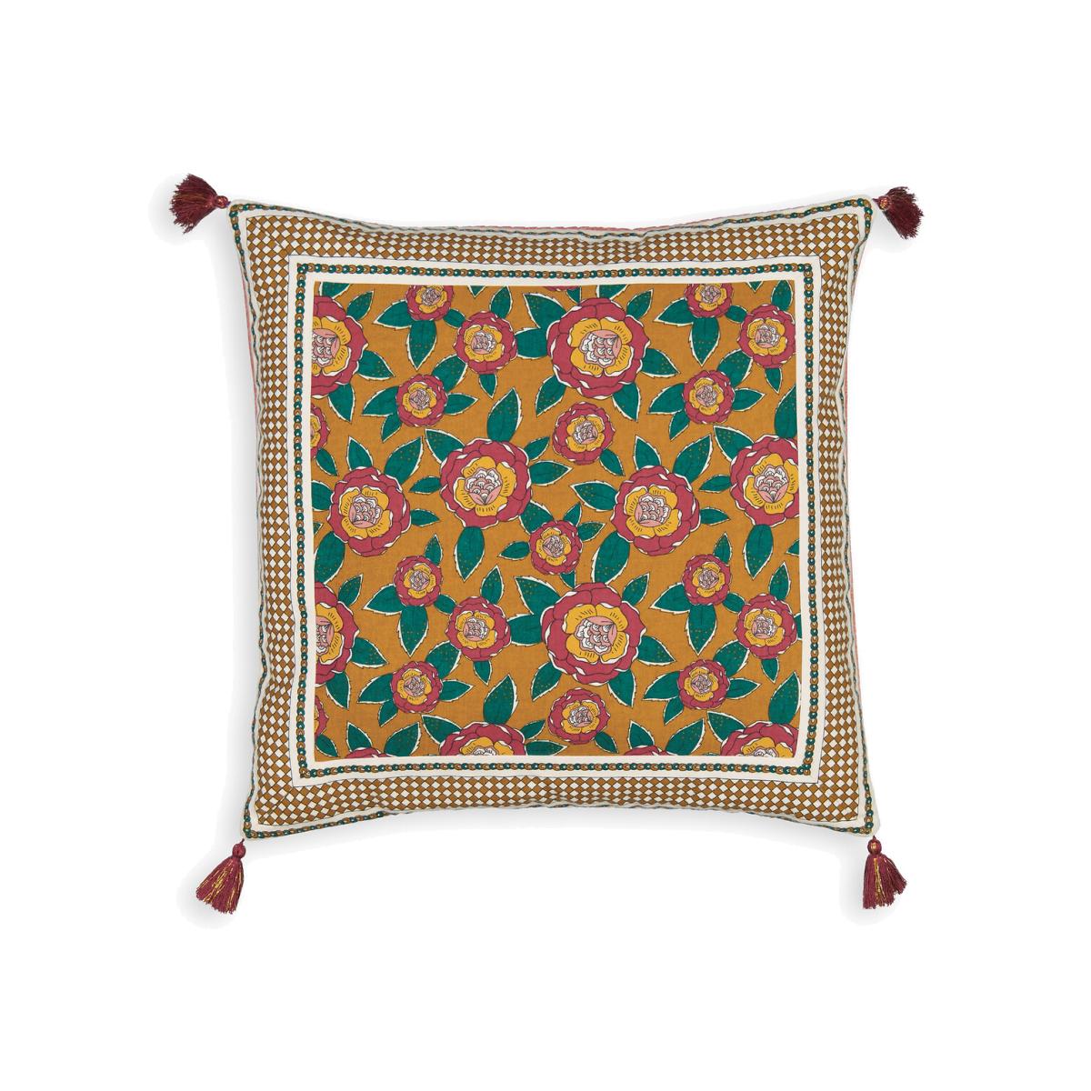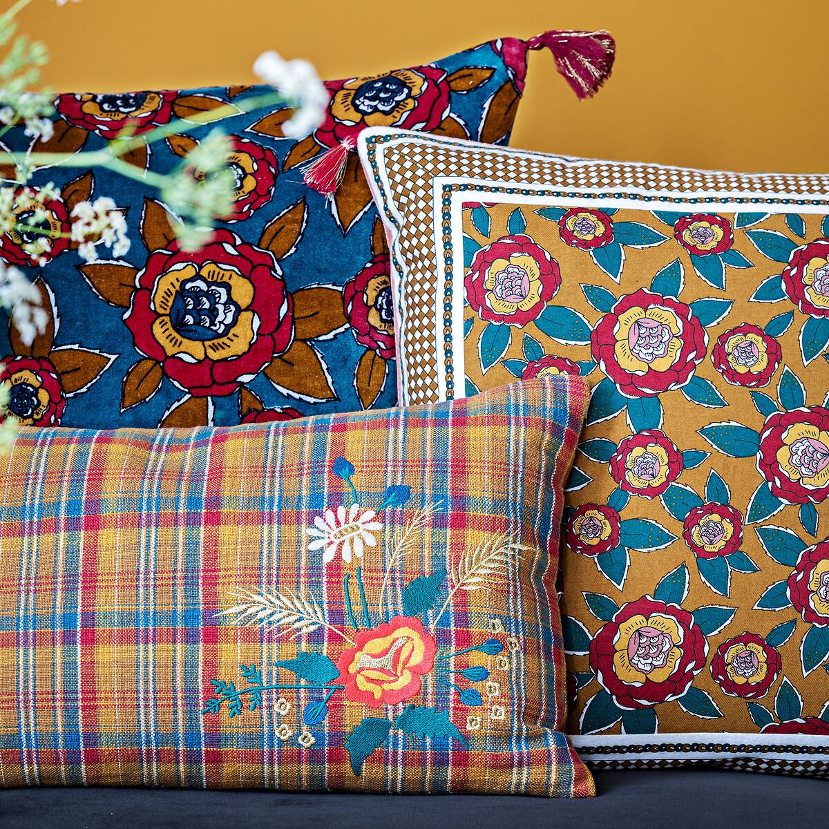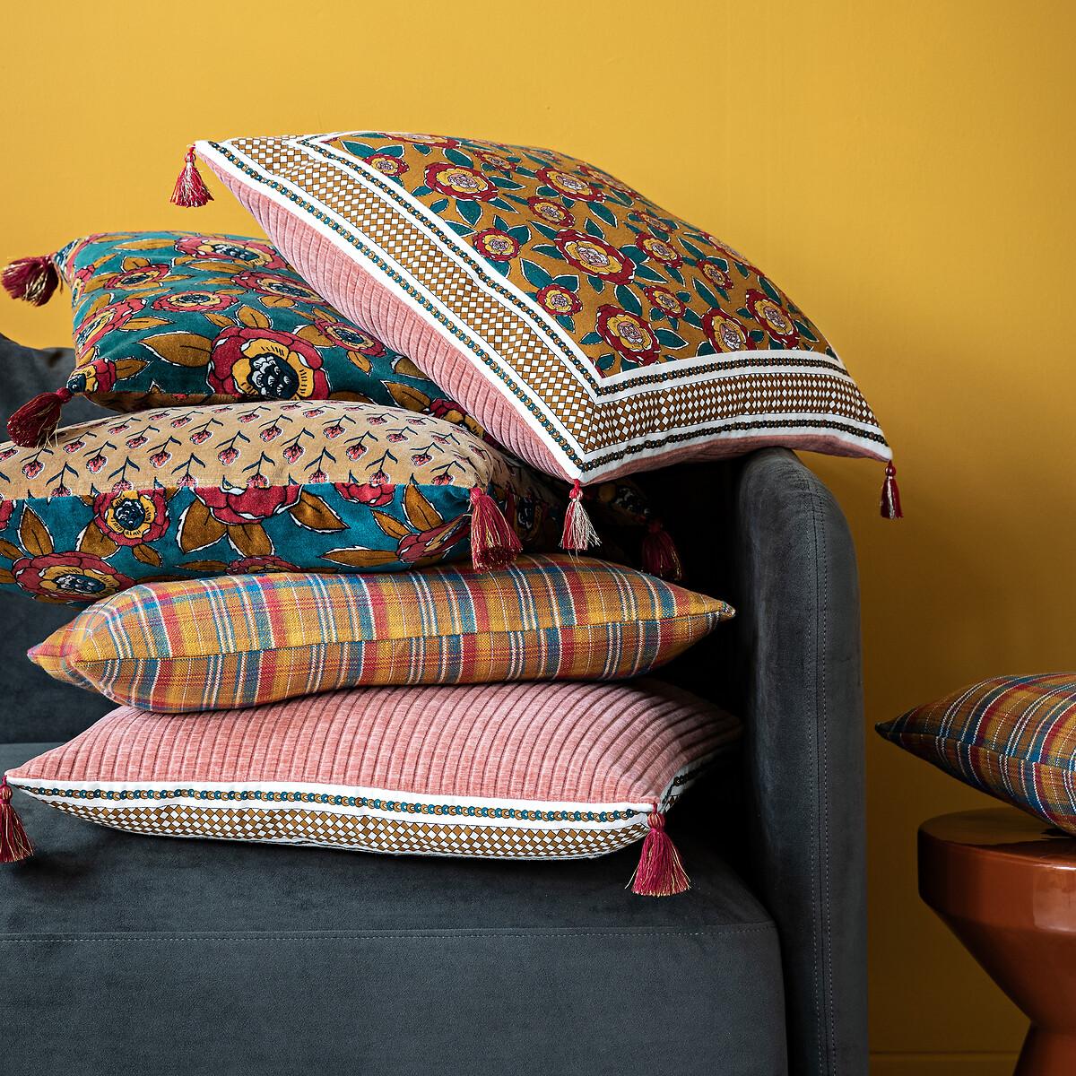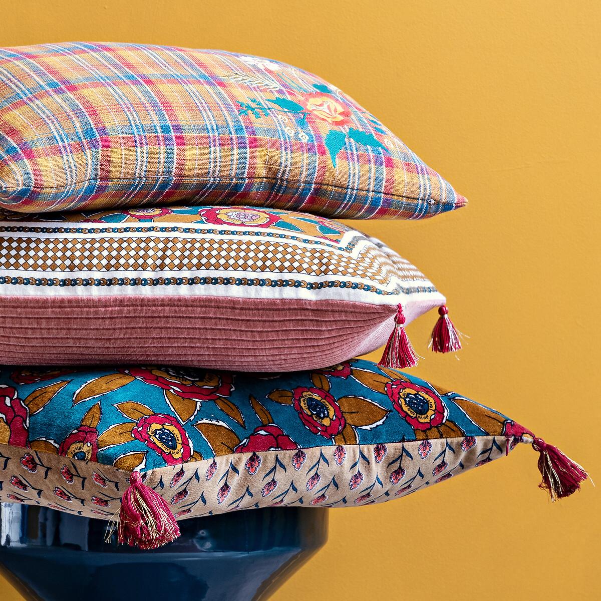 Jamini, the French brand inspired by Indian culture, has teamed up with La Redoute Interiors to create a capsule collection of home textiles combining floral prints and Art Deco patterns. Showcasing varying shades of curry yellow, terracotta and blue, the collection brings together the elegance of traditional Indian heritage with French chic, creating a harmonious fusion of the two cultures. An enchanting invitation to travel. Product Details • 100% cotton • Floral printed flannel front • Plain corduroy back • Tassel detailing on each corner • Concealed zip fastening. Care Advice • Machine washable at 30°CSize • 50 x 50cm • OEKO-TEX® Standard 100. Standard 100 certification by OEKO-TEX® tests textile products for harmful substances via an independent, international label.