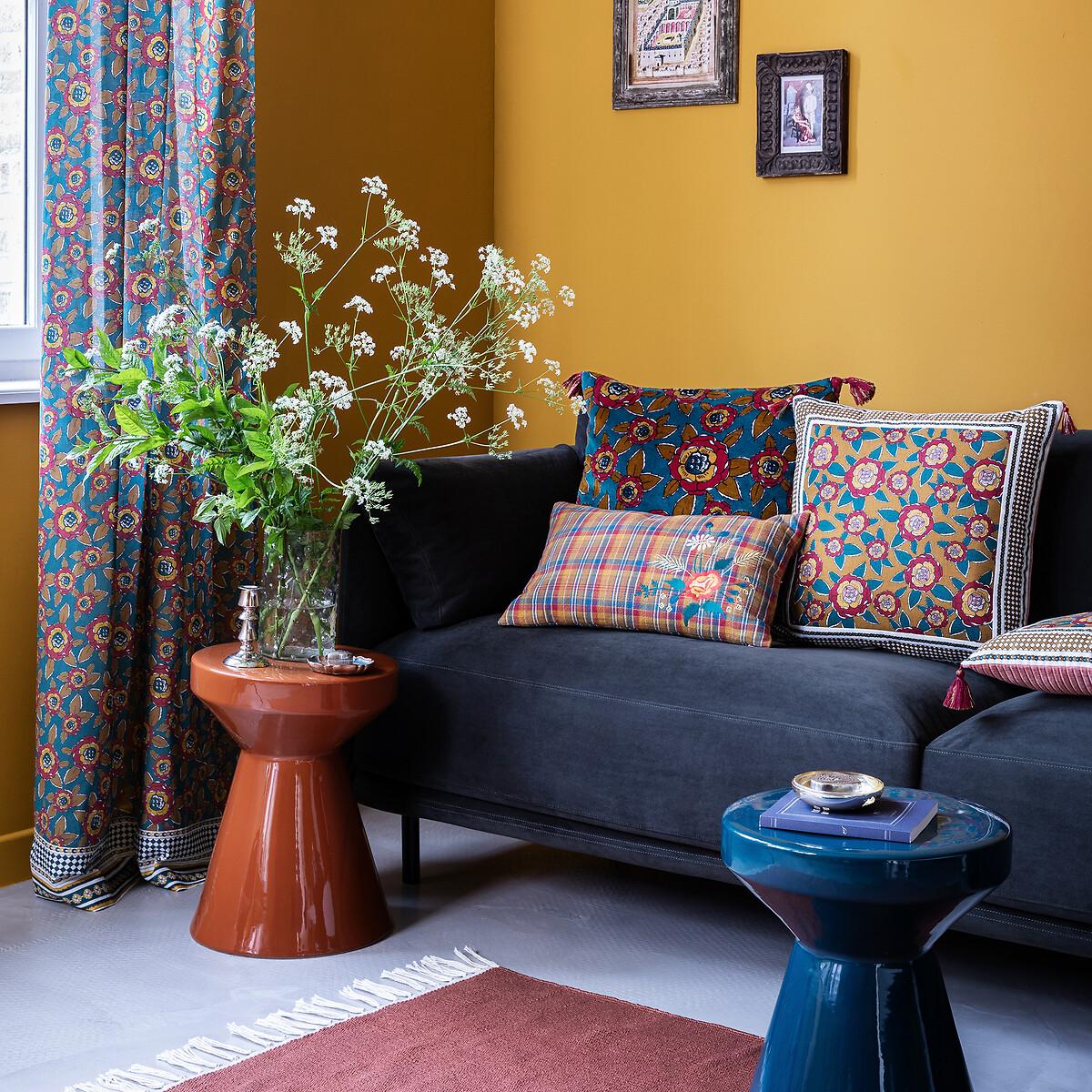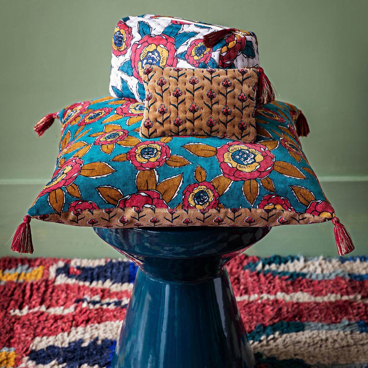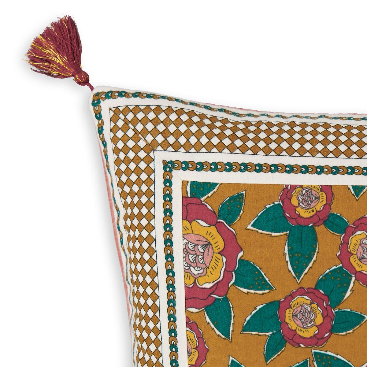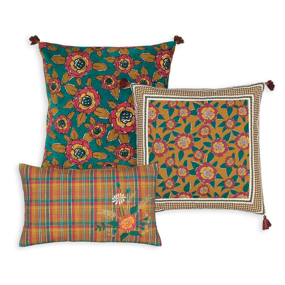 Jamini, the French brand inspired by Indian culture, has teamed up with La Redoute Interiors to create a capsule collection of home textiles combining floral prints and Art Deco patterns. Showcasing varying shades of curry yellow, terracotta and blue, the collection brings together the elegance of traditional Indian heritage with French chic, creating a harmonious fusion of the two cultures. An enchanting invitation to travel. Product Details • 100% cotton • Floral printed flannel front • Plain corduroy back • Tassel detailing on each corner • Concealed zip fastening. Care Advice • Machine washable at 30°CSize • 50 x 50cm • OEKO-TEX® Standard 100. Standard 100 certification by OEKO-TEX® tests textile products for harmful substances via an independent, international label.