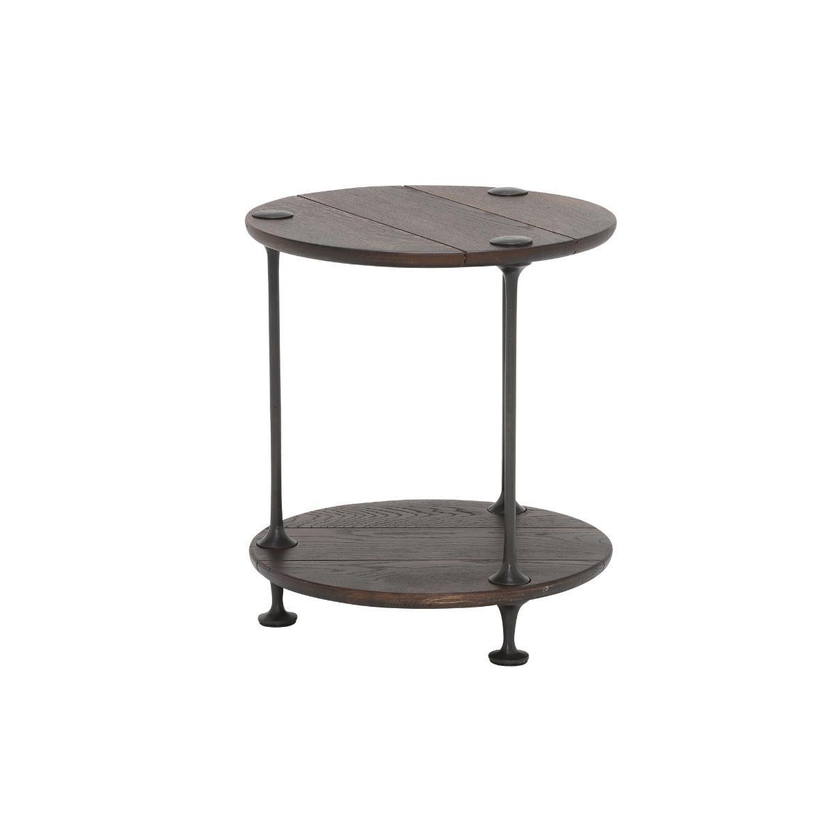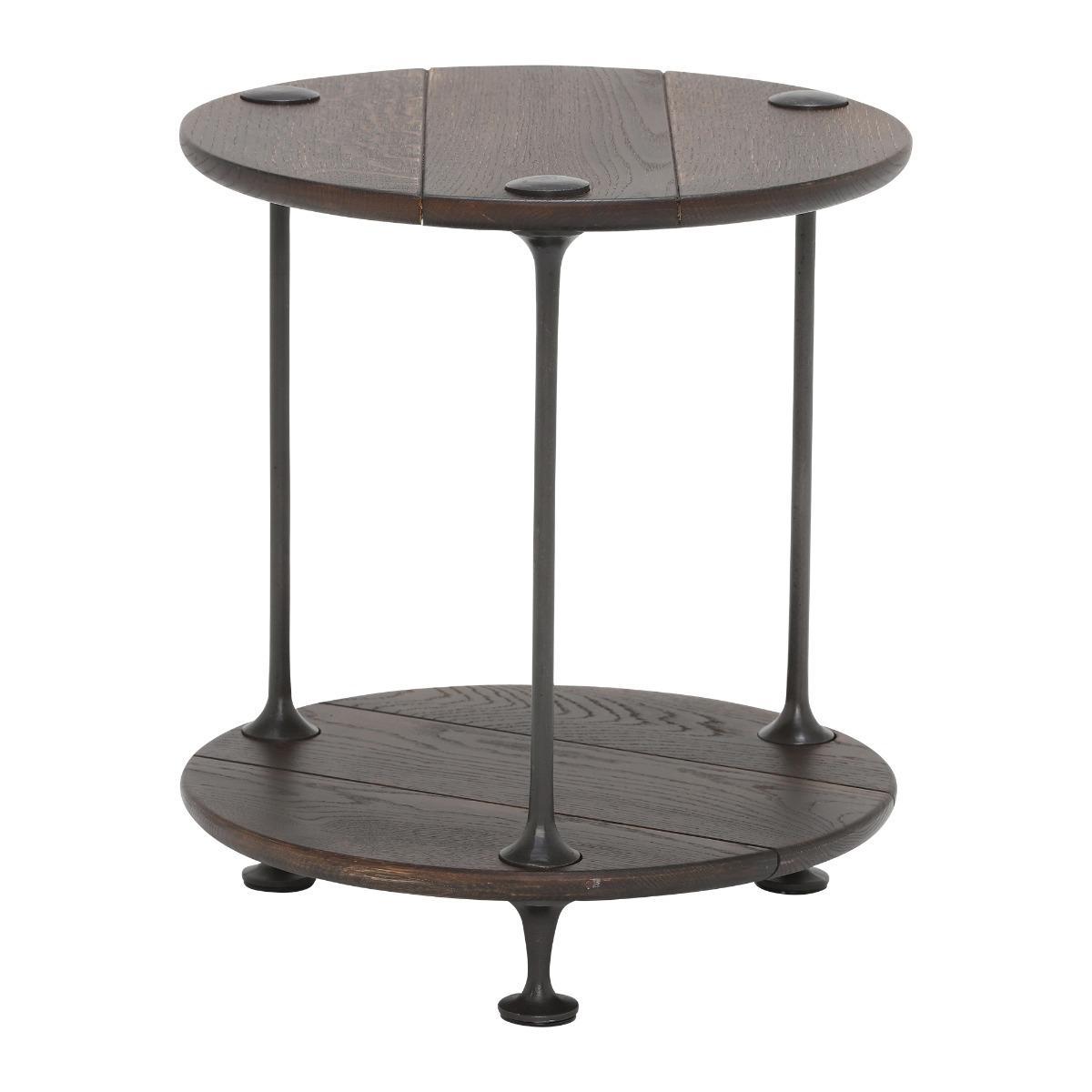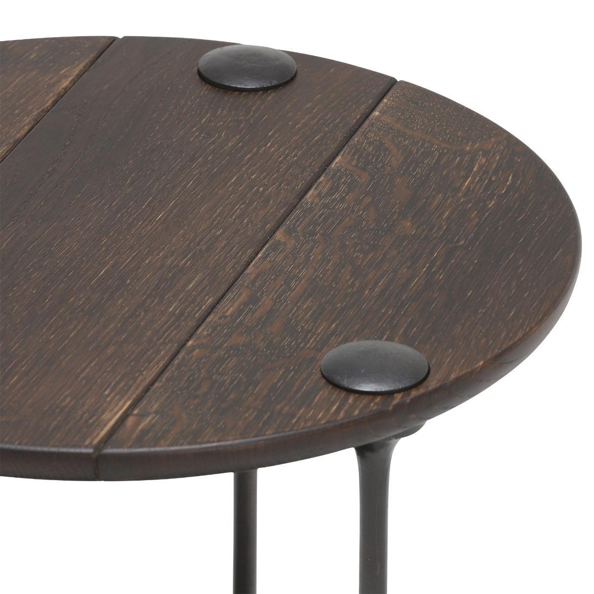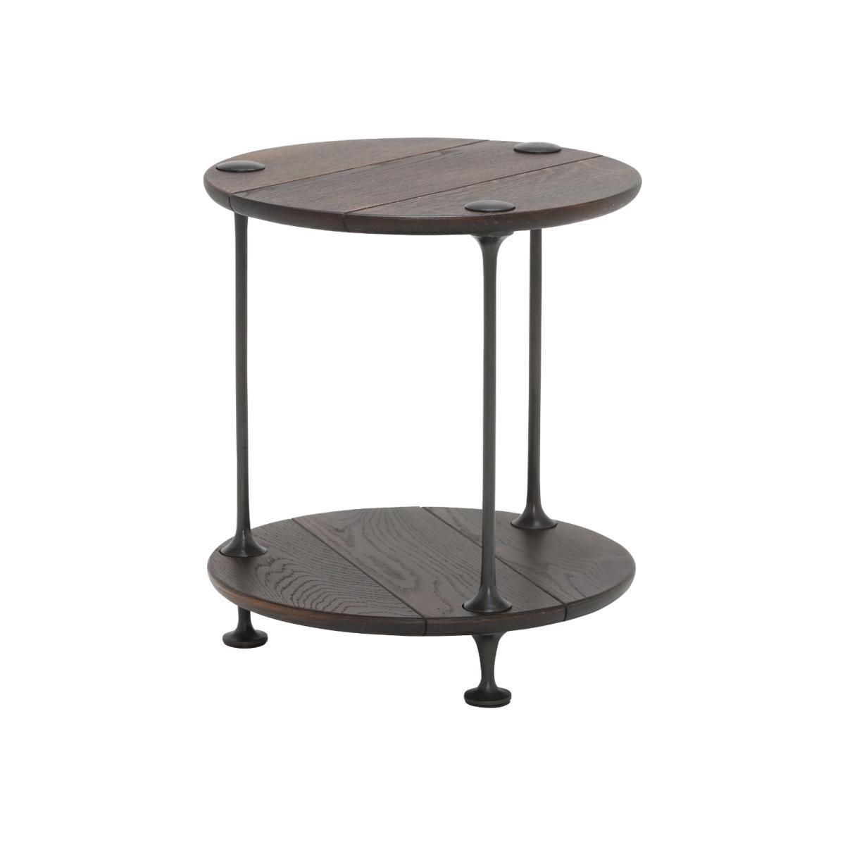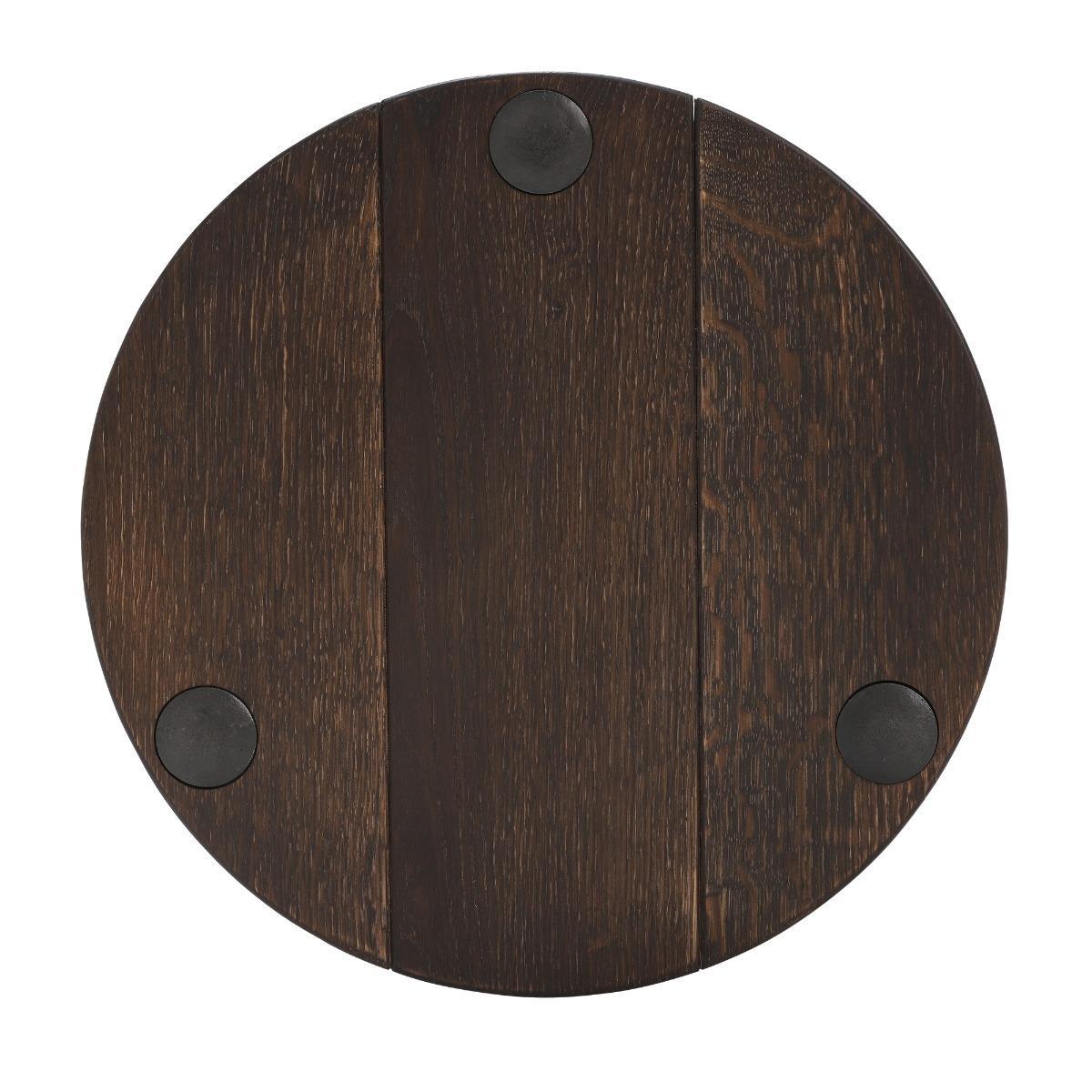 Design. Embraced from the natural wonder of wood and trees, the Chandra Round End Table has been carefully crafted using the very best materials and traditional joinery techniques. Inspired by mechanics and natural elements, Chandra uses solid oak and cast iron rods to create a visually appealing yet practical piece for your home. Each brass cast iron element is used to resemble the shape of steel valves within a motor engine; these are used to space each solid oak board, resulting in an industrial look.