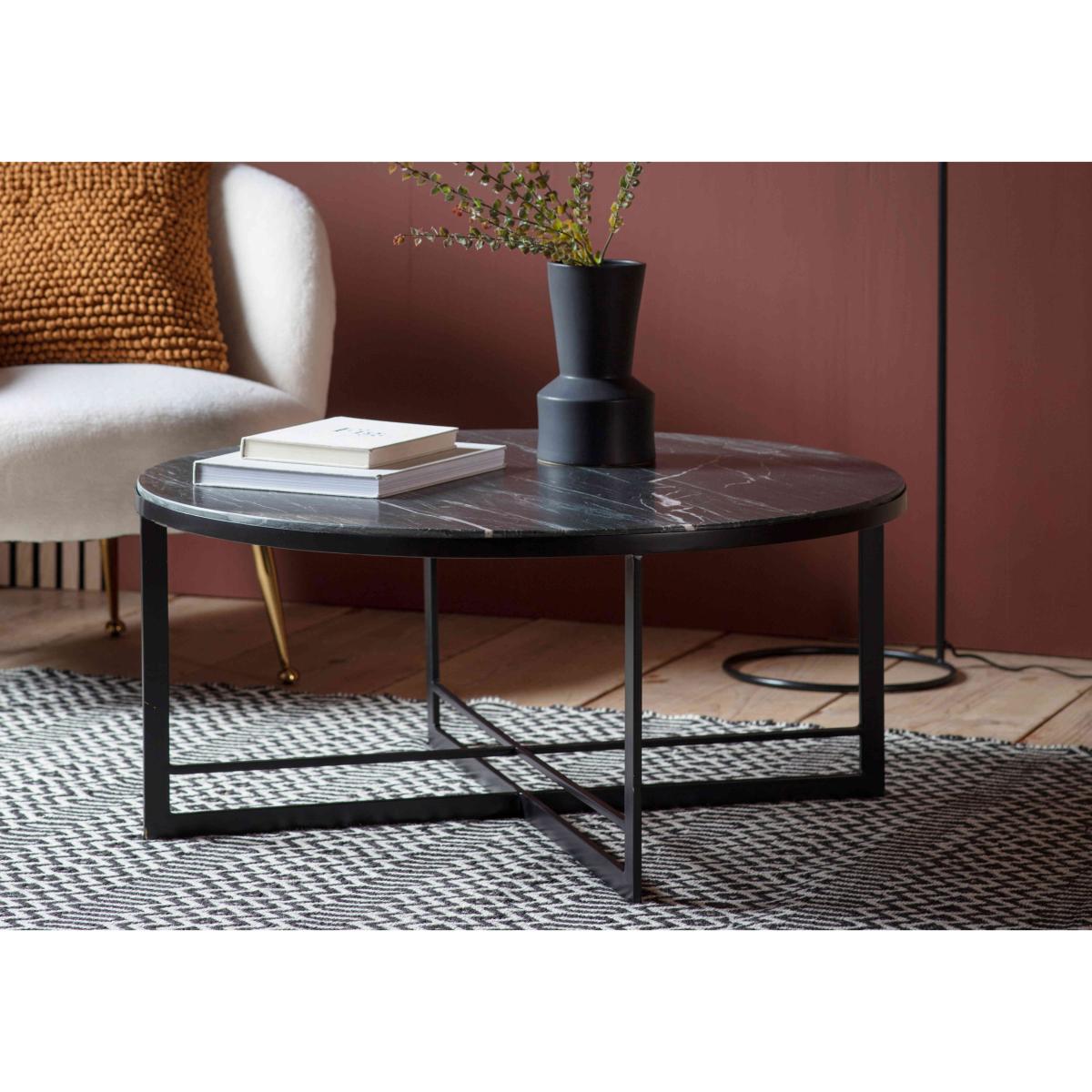 Every living room needs a stylish coffee table, and this piece is a fabulous choice with its natural marble top and sleek metal base. Why you'll love it This coffee table showcases a stunning Indian black marble top. Natural stone pairs beautifully with matt black metal. Also available with grey marble and brushed steel. Every table is entirely unique thanks to the individual marbling. What you need to know Made from marble, iron and MDF. We recommend always using coasters. For indoor use only. Dimensions Width: 90 cm (36 inches) Height: 40 cm (16 inches) Depth: 90 cm (36 inches) Weight: 54 kg