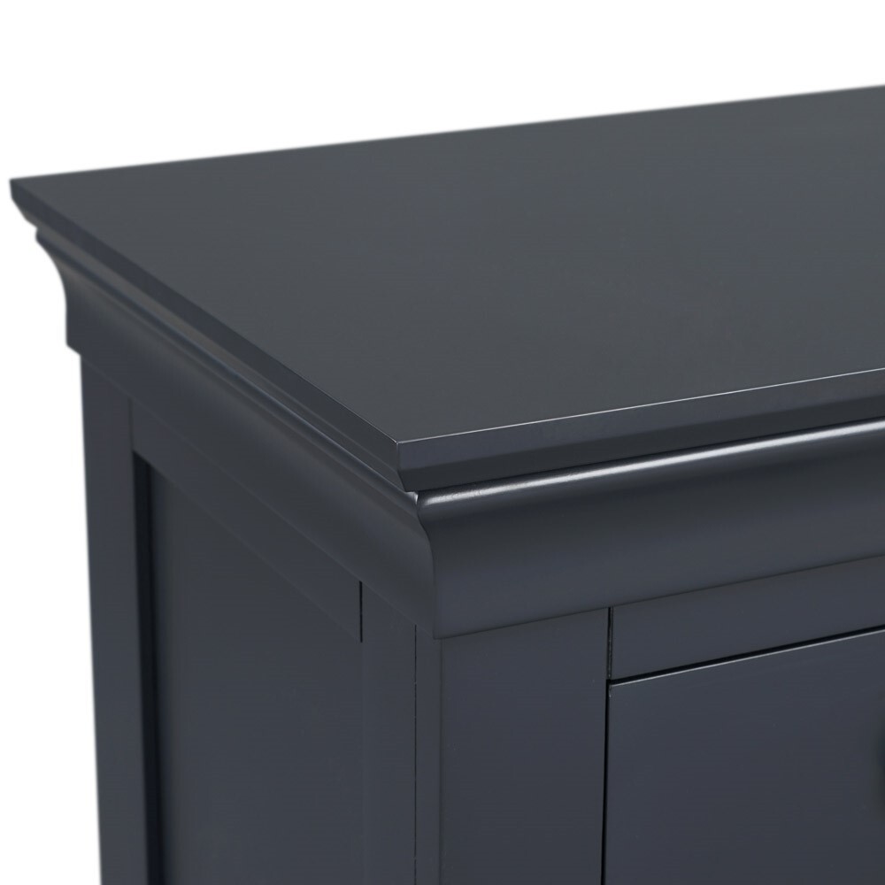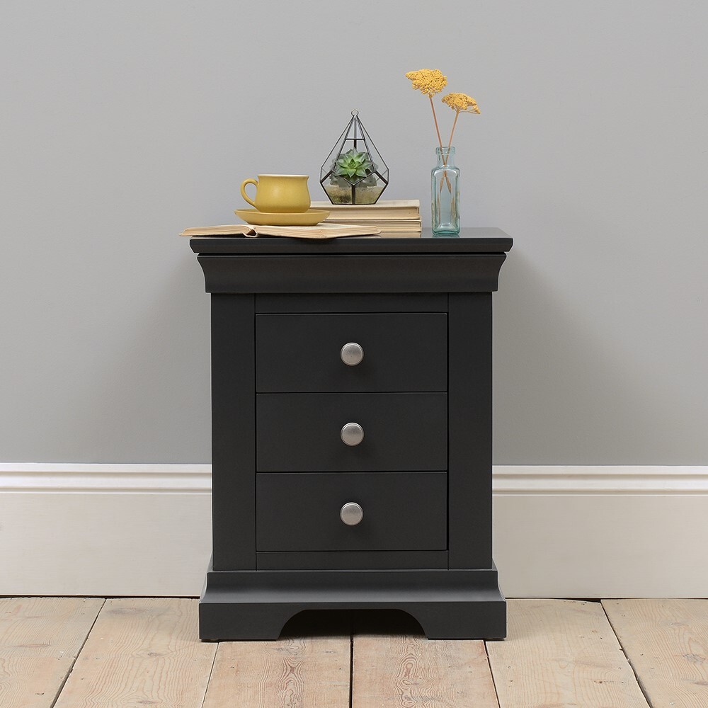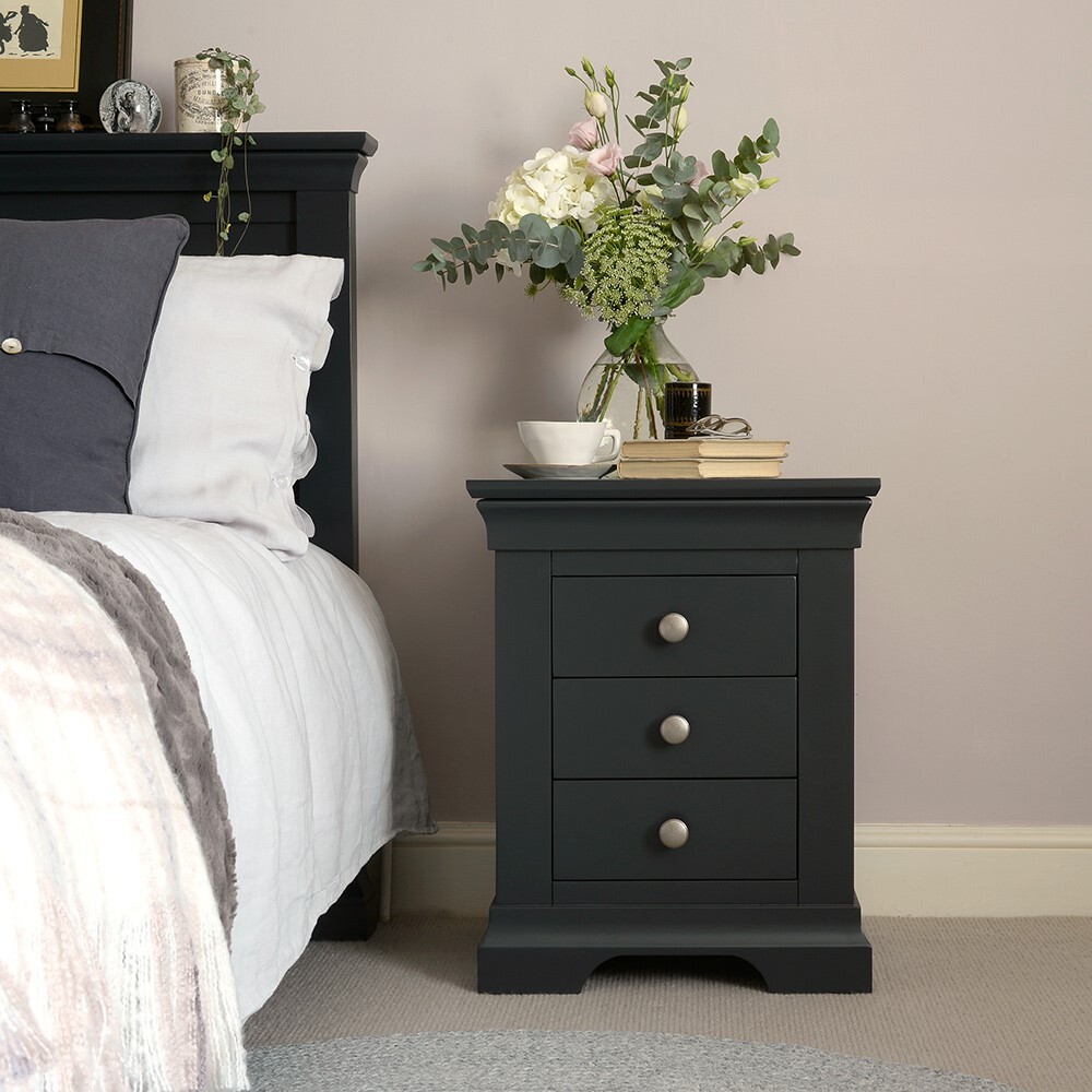 With ample room for all of your bedtime essentials in its three roomy drawers and wide open top - perfect for a lamp or to rest your book upon. Painted in a deep rich matte off-black. This classic styling of this bedside will be right at home in any décor, be it modern or traditional and will make the ideal companion for the matching Chantilly Dusky Black Bed. We supply both antique silver handles and coordinating painted ones so you can apply the finishing touch to suit your tastes!
