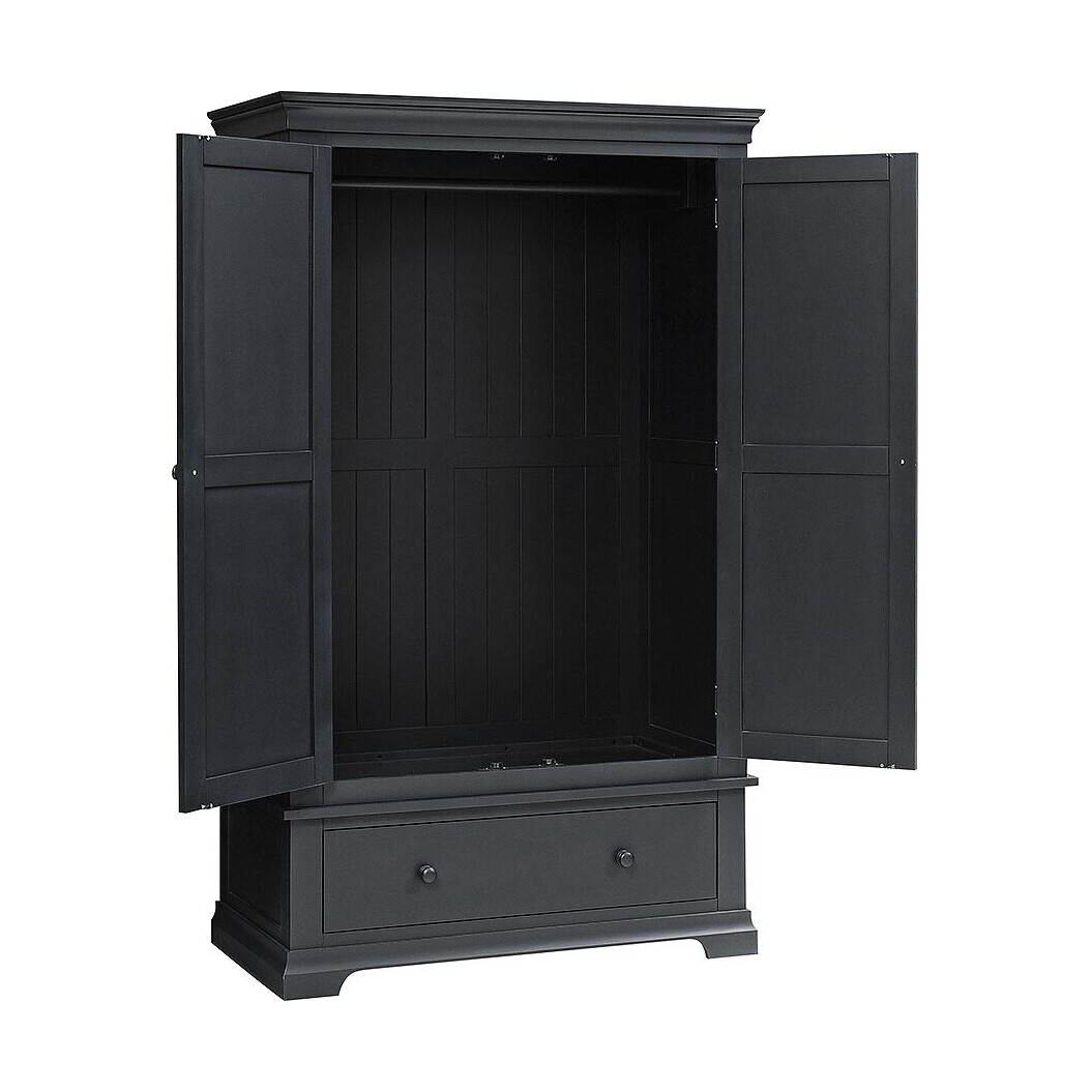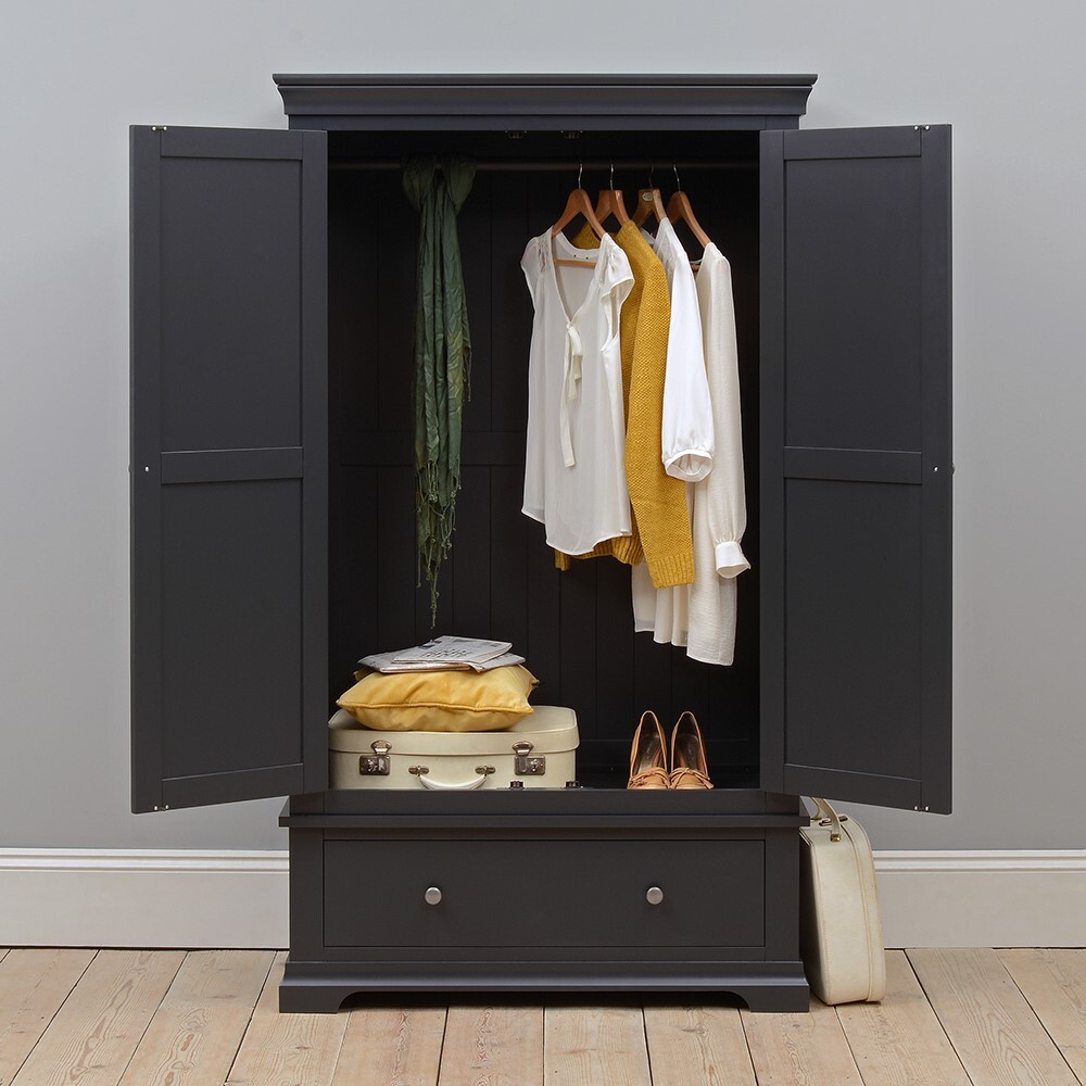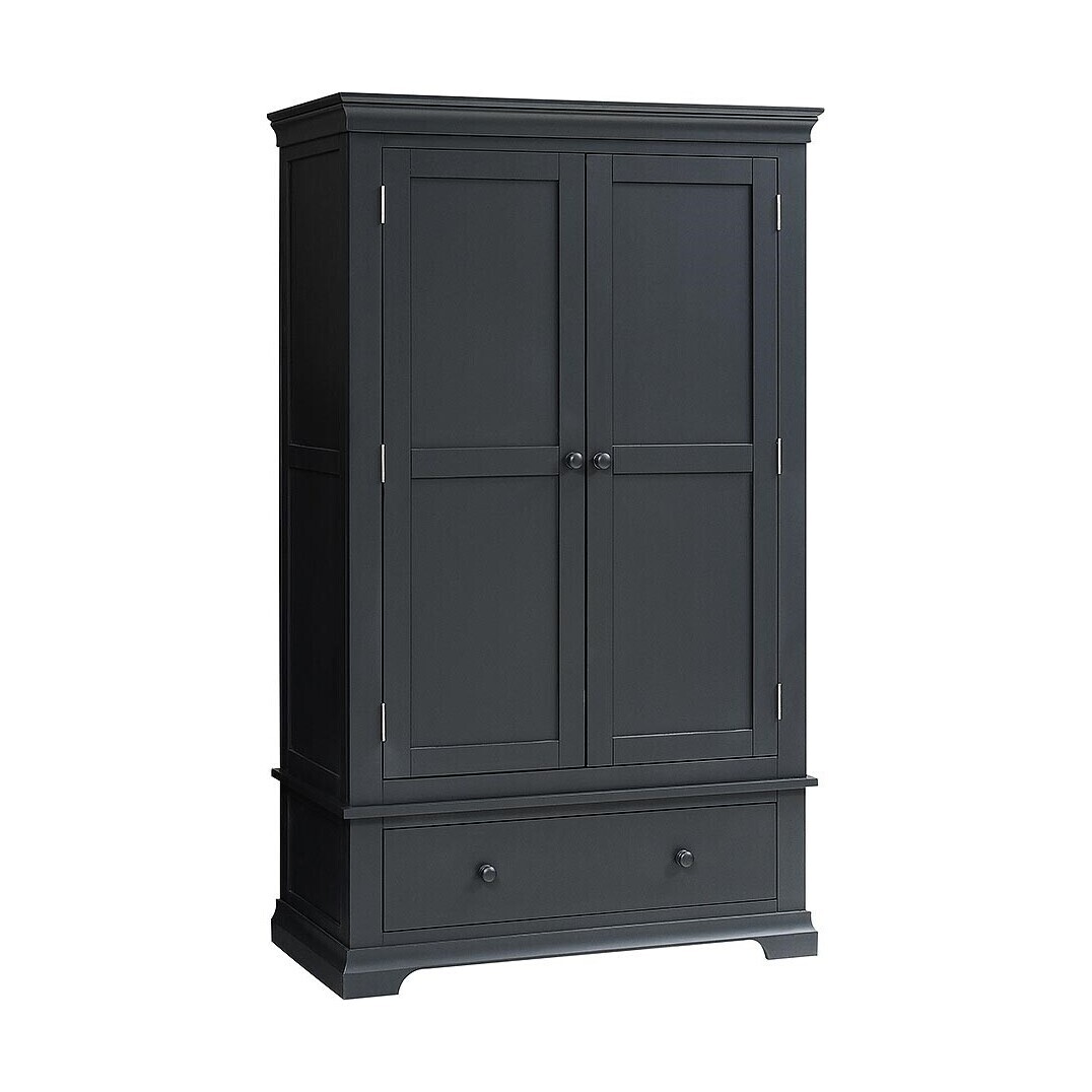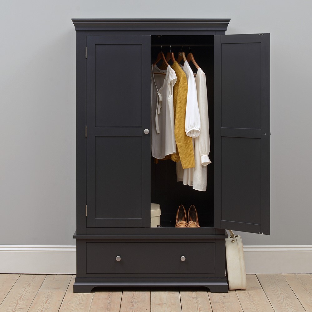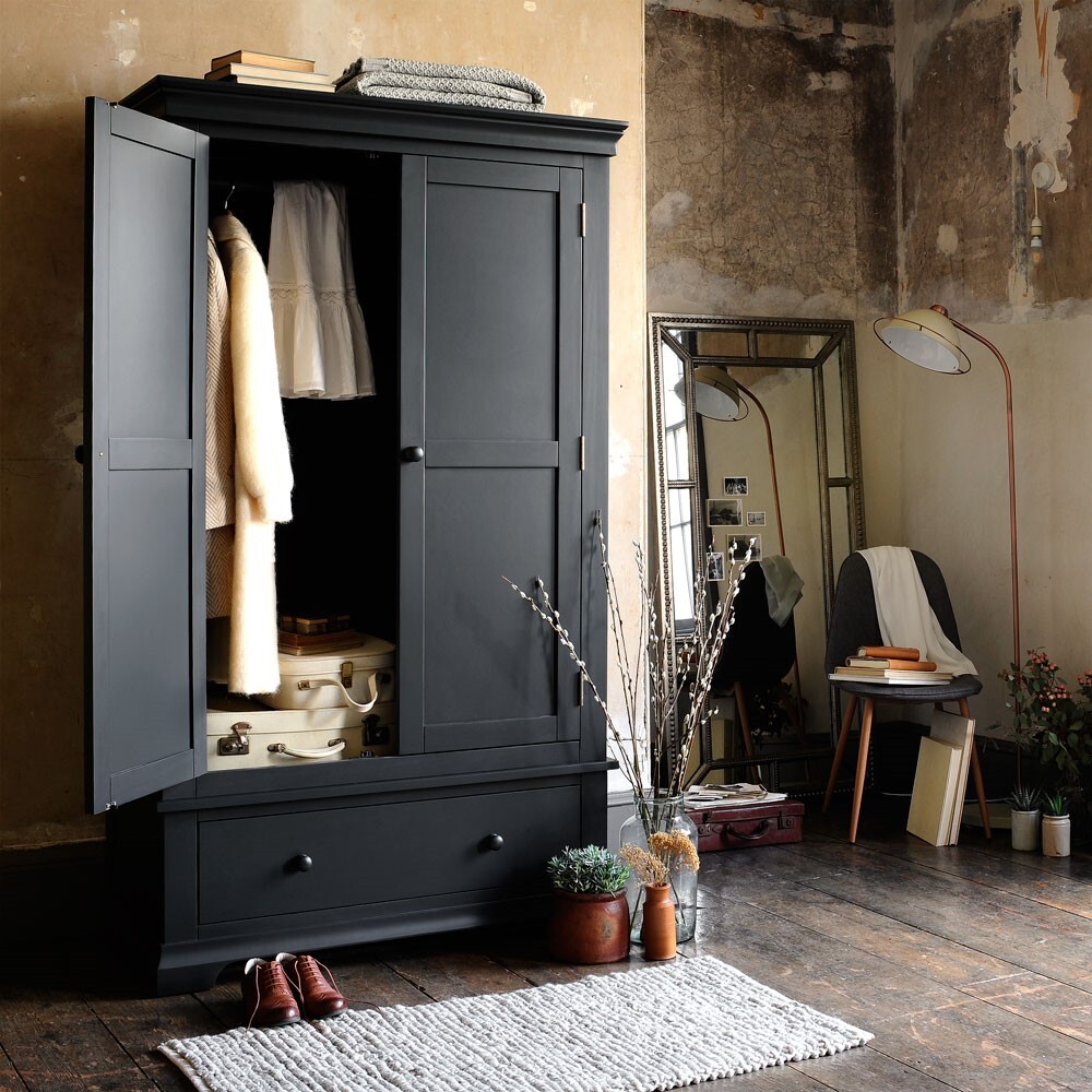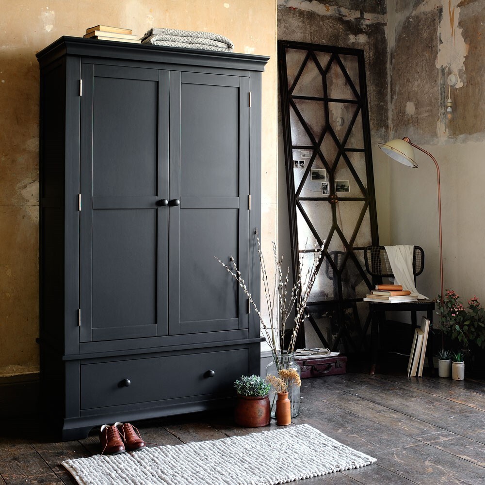 Strikingly modern looking with its soft and chalky matt black tones, we think this wardrobe will look superb contrasting against a lighter background, making a real focal point in your bedroom. Beautifully made, with full width hanging space, room for shoes at the bottom, and a handy drawer for bulky jumpers and jeans, its clean lines and simple panelled doors will bring country-style elegance to any space.