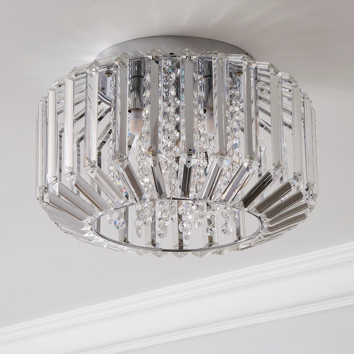 Deisgned with stunning crystal glass and hanging glass bead details, the Chantilly Flush fitting would bring a touch of class and style to any space. This elegant light fitting comes complete with complementing chrome plated details adding to the luxe styling, and is fully compatible with dimmer switches.