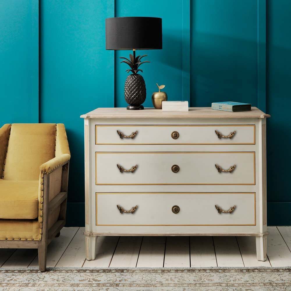 Influenced by pieces found in chic French boutiques, our Chantilly Large Chest of Drawers has been designed and crafted by skilled artisans. Constructed from mango wood and given a soft grey exterior, this charming three drawer chest is not only practical but stylish. The striking gold trim and rococo inspired brass handles truly capture the elegance and sophistication of Parisian style.