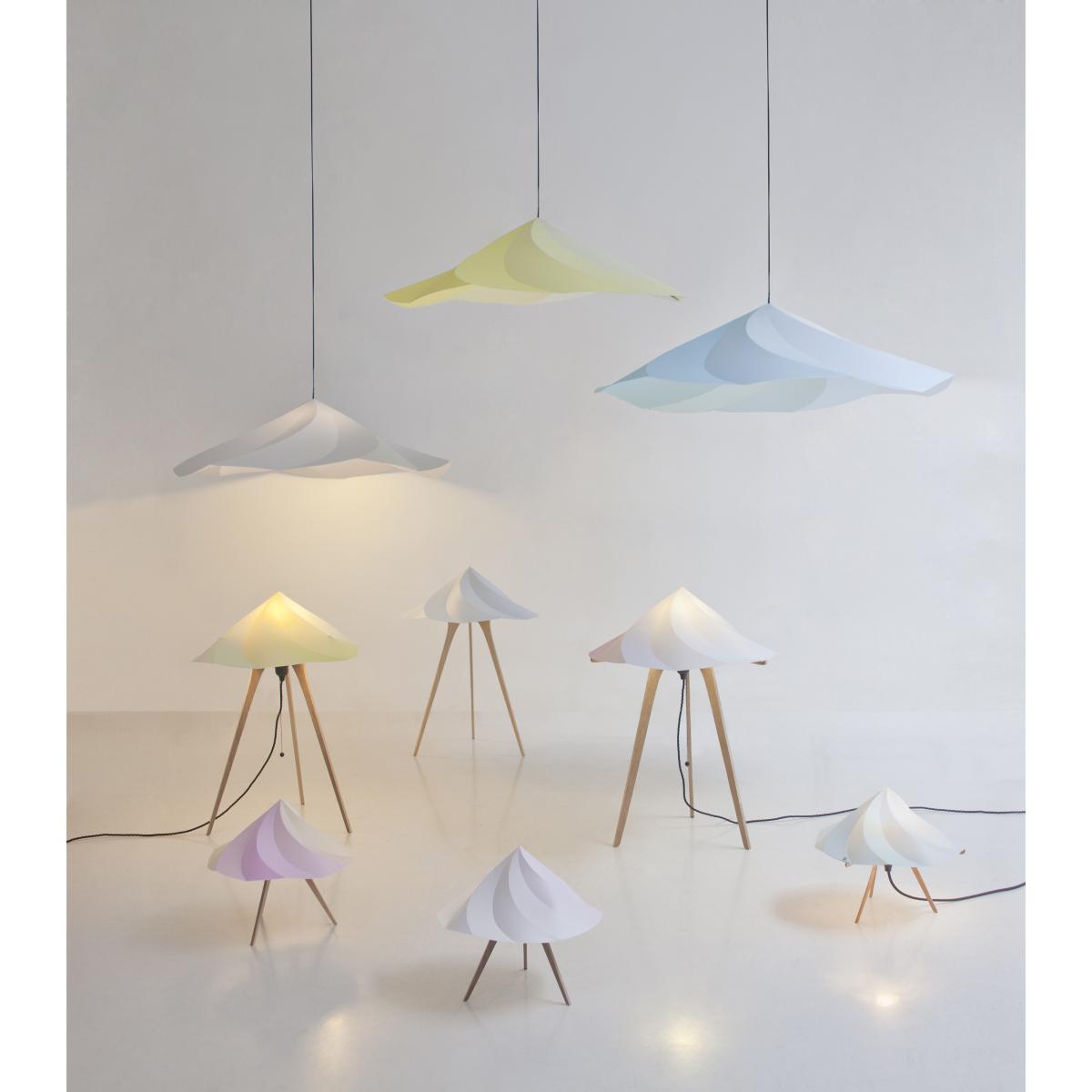 Chantilly lamps are dancing objects on long and elegant plywood legs. Complex volumes are created through a simple system of folds of a polypropyene sheet. With their pastel and delicious colours, they also represent a research on colorimetric transitions. The objective of this project was to design delicate and funny lamps at a reasonable price. They exist in three sizes (small, medium or large to be suspended) and four colours.