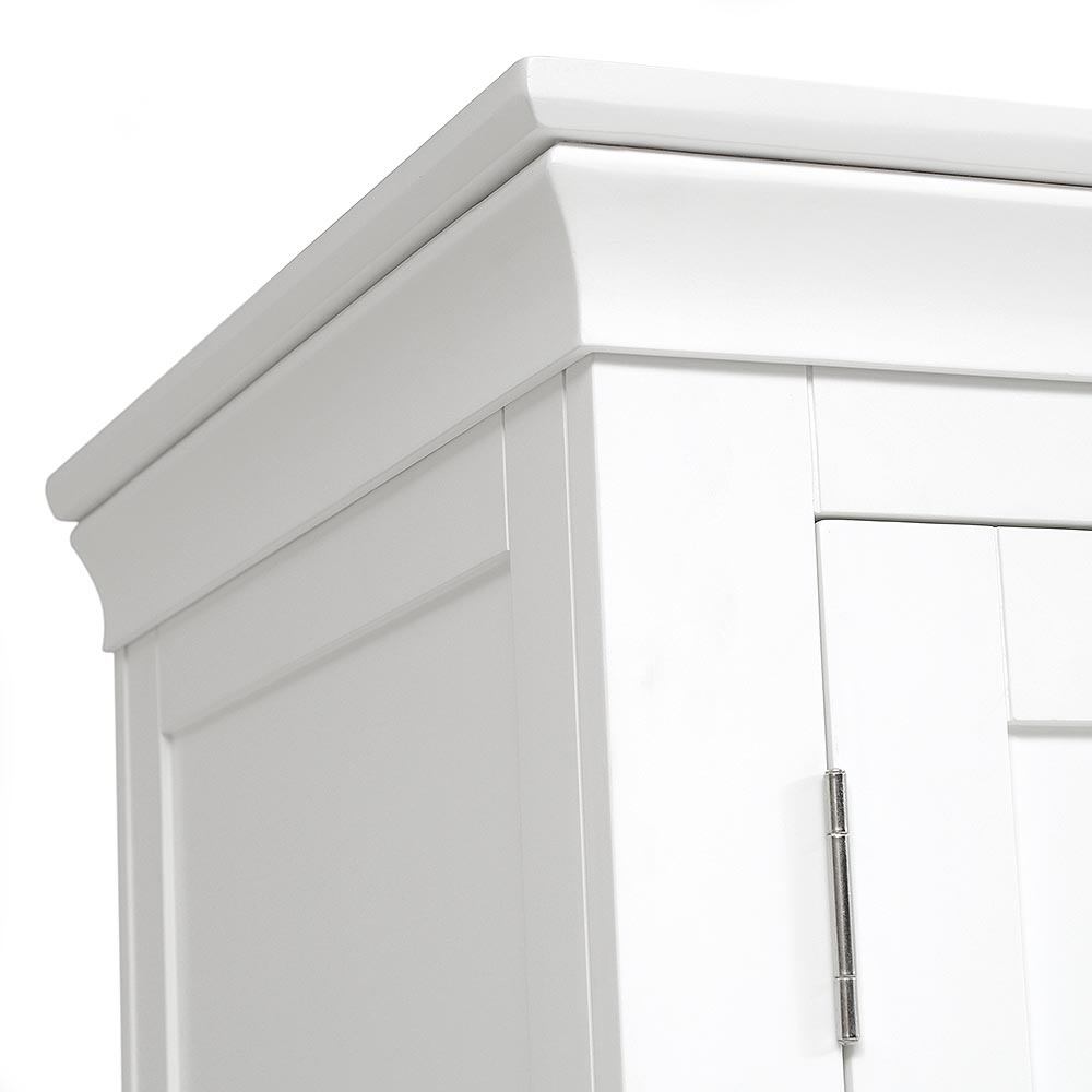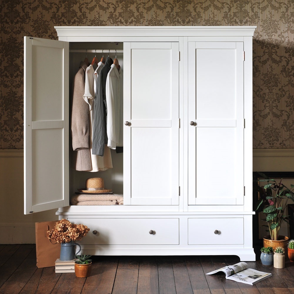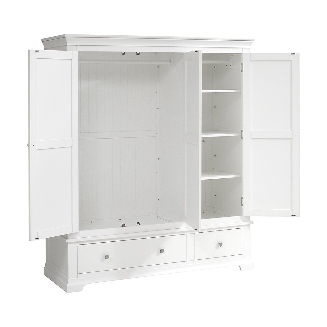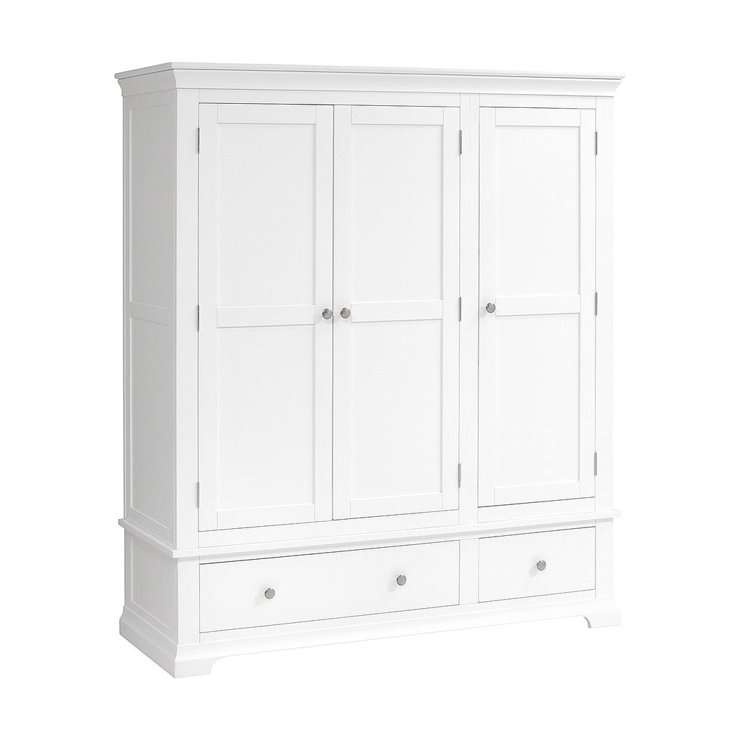 For those who have more clothes to store than most, this stunning triple wardrobe will look splendid in a master bedroom where its soft white finish will make an eye-catching focal point. Simply designed with elegant touches like the tapered cornice and cut-out plinth, it also comes with brushed steel and white wooden handles for you to choose from. Behind the double doors you'll find a full hanging space and behind the third door is a rail and three shelves which can removed or adjusted for extra versatility. Small and large drawers at the bottom offer extra storage space for all your bulkier stuff.