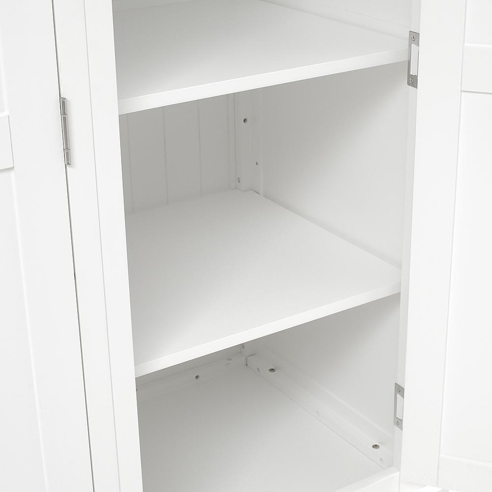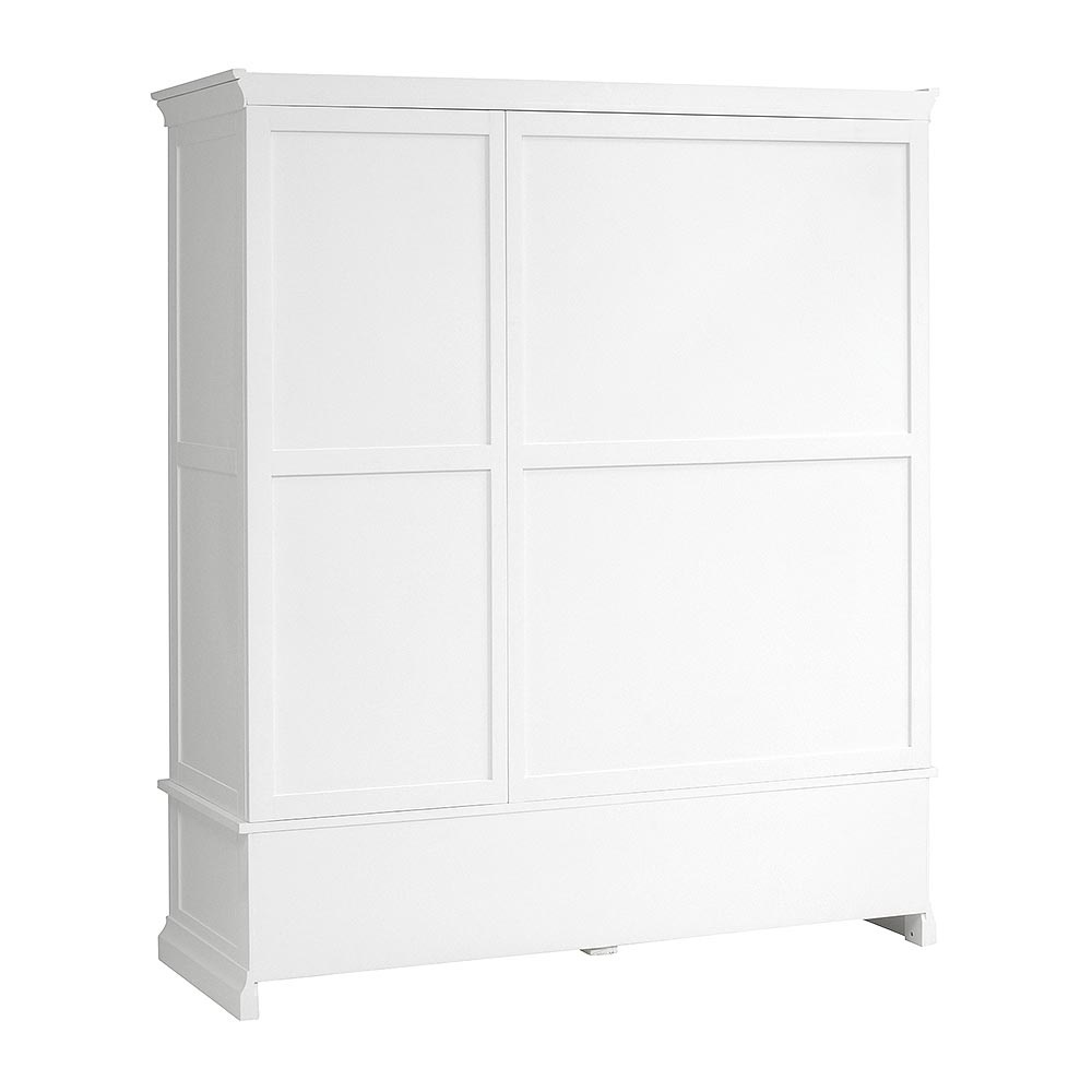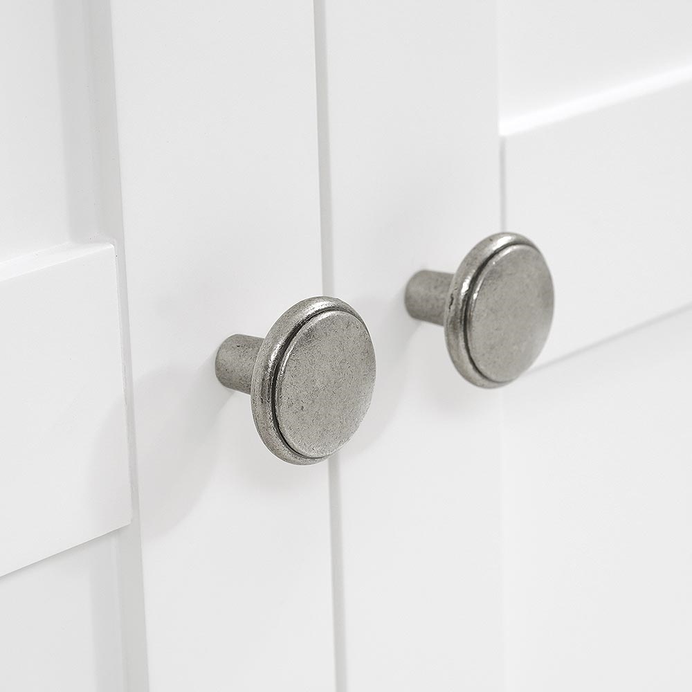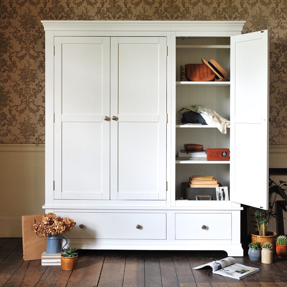 For those who have more clothes to store than most, this stunning triple wardrobe will look splendid in a master bedroom where its soft white finish will make an eye-catching focal point. Simply designed with elegant touches like the tapered cornice and cut-out plinth, it also comes with brushed steel and white wooden handles for you to choose from. Behind the double doors you'll find a full hanging space and behind the third door is a rail and three shelves which can removed or adjusted for extra versatility. Small and large drawers at the bottom offer extra storage space for all your bulkier stuff.