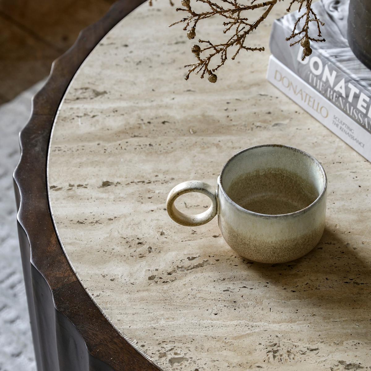 * Stylish round drum base crafted from mango wood* Beautifully scalloped edges with travertine stone inset top* Unique and eye-catching design* Matching side table available The Chantry Coffee Table showcases a stylish and unusual design, featuring a round drum base crafted from mango wood with scalloped edges, paired with a travertine stone inset top. Its unique aesthetic is complemented by a matching side table, perfect for a coordinated look in your living space.